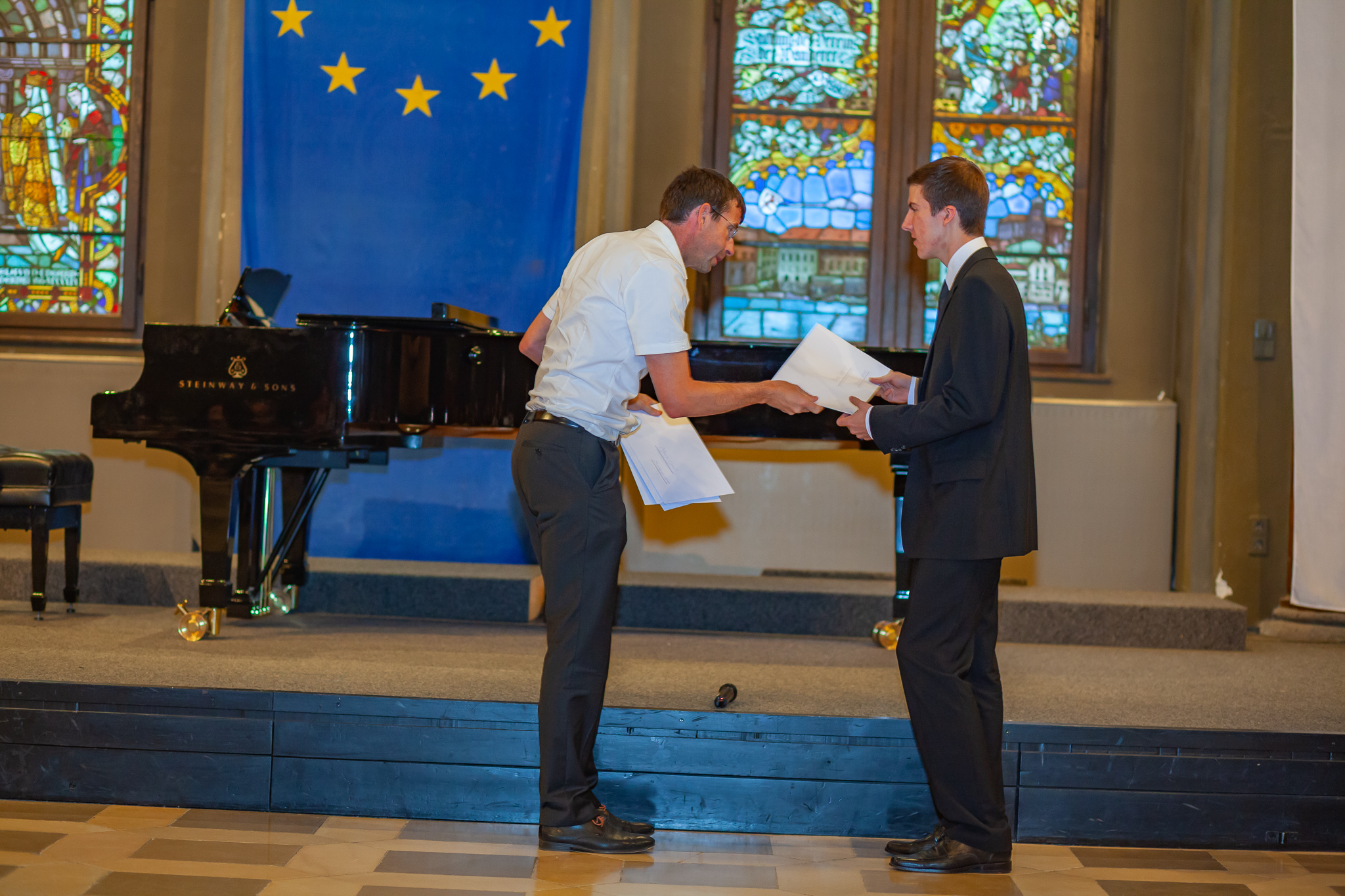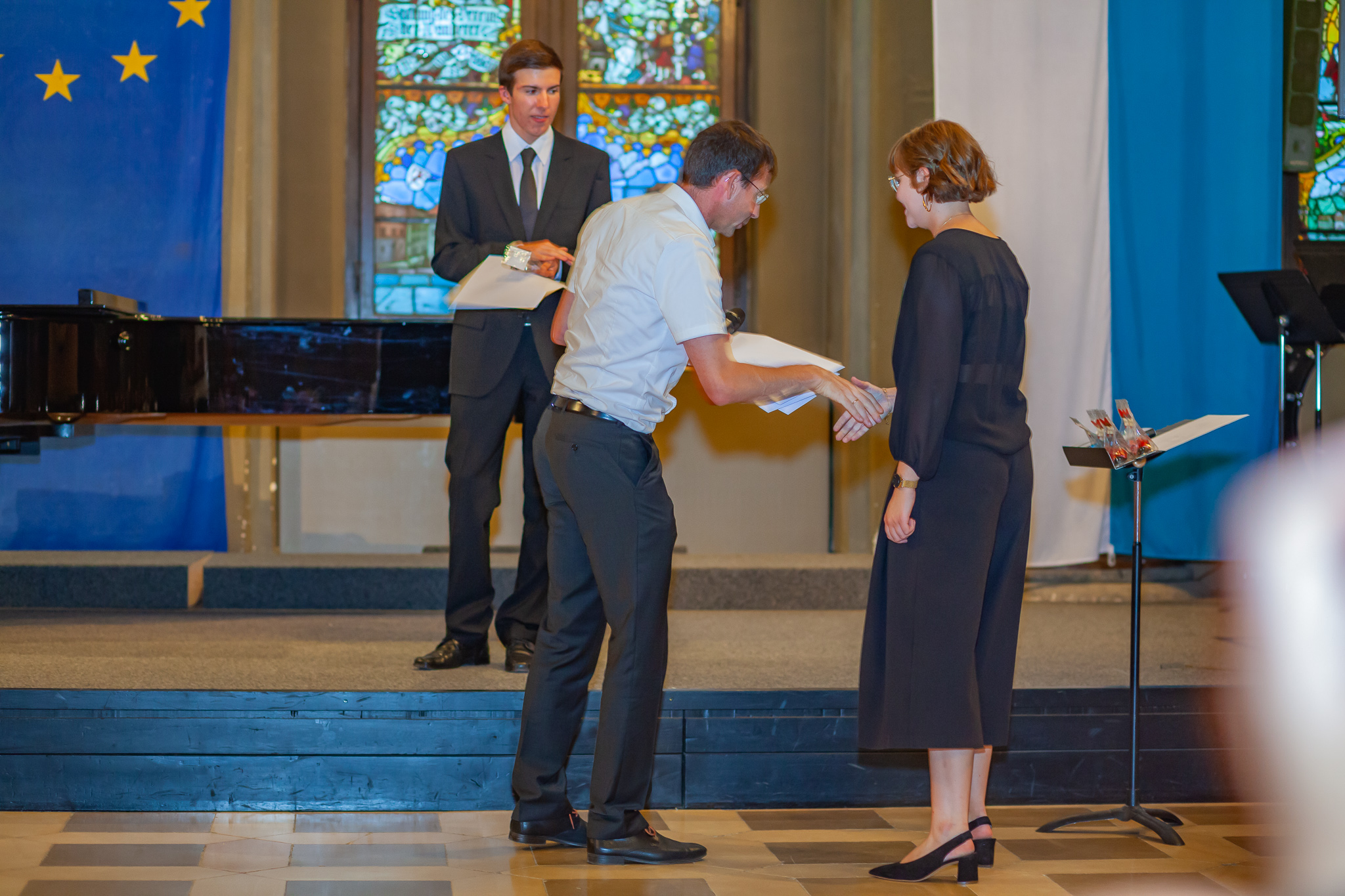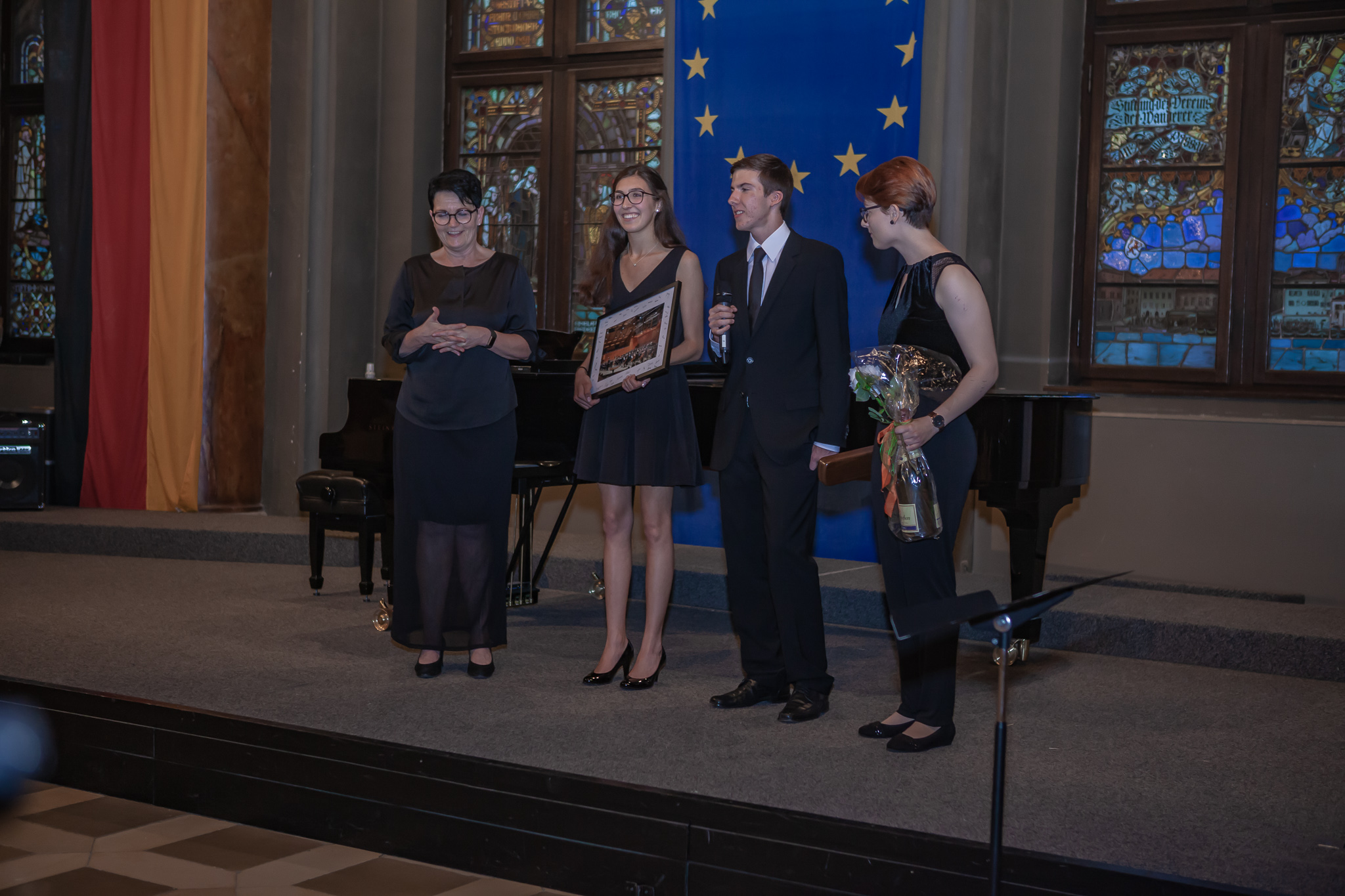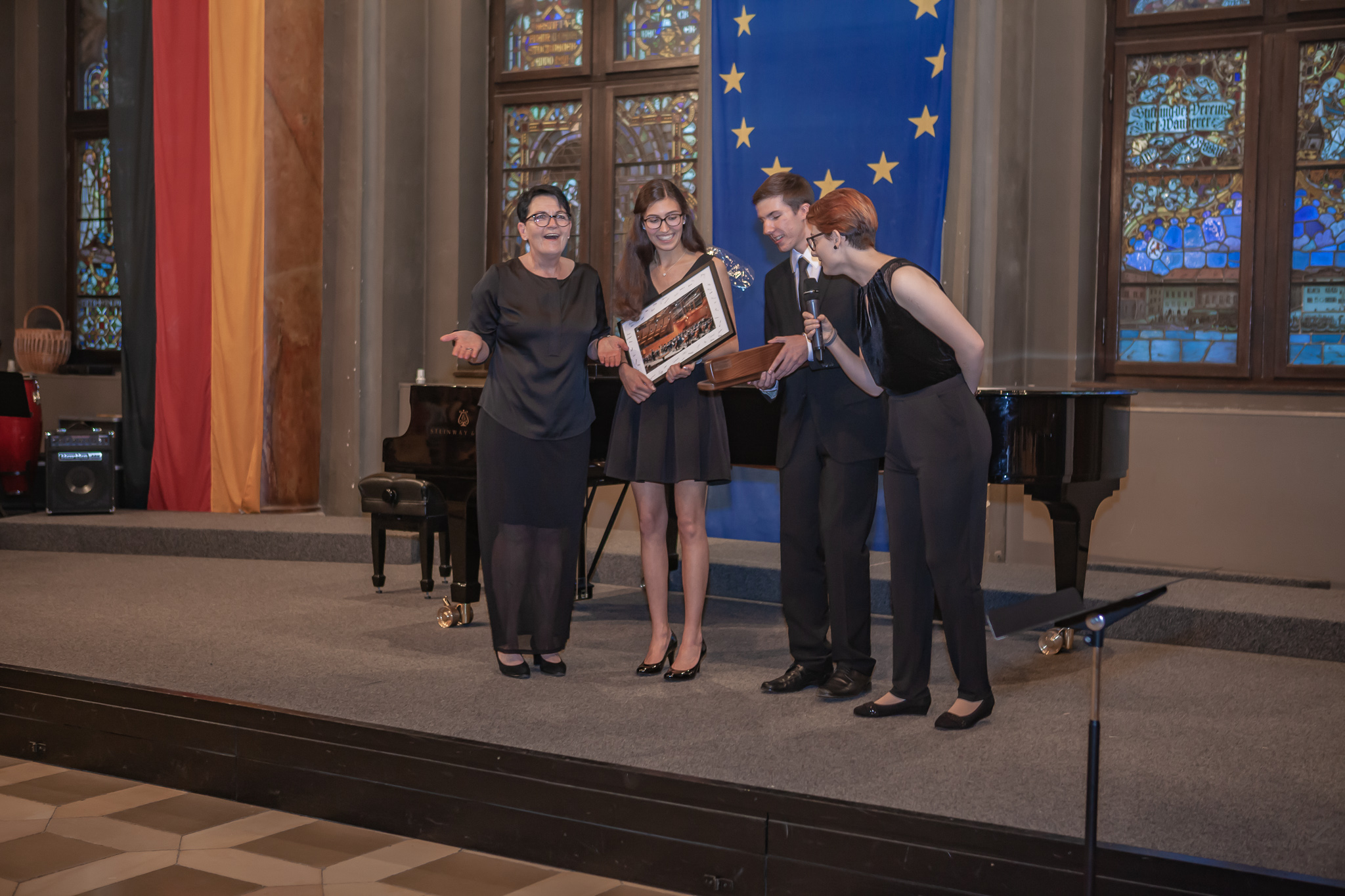 Der Schulchef verlieh den Großen Musikpreis an fünf weitere Schüler. Er würdigte Franziska Fischer, die sich in vielfältiger Weise musikalisch in das Schulleben einbrachte. Sie habe mit ihrem Violinspiel Orchester und Kammermusik bereichert und mit ihrem Streichquartett große Erfolge bei "Jugend musiziert" erzielt. Herausragende Leistungen habe sie auch im Chor gezeigt. Elisabeth Pontz könne mit ihrer klaren, analytischen Denkweise musikalische Zusammenhänge erfassen und in ihrer geschliffenen Sprache wiedergeben. Sie verfüge zudem über ausgezeichnete musikalische Fähigkeiten. Im Chor sei sie eine erfahrenen Sängerin, die auch in kleinen Ensembles zu begeistern und überzeugen weiß. Marie Groß sei ebenfalls eine hervorragende Sängerin, die auch andere zu Chor- und Ensemblearbeit animiere. Sie habe seit der fünften Klasse in Musikgruppen und Projekten mitgewirkt und auch Erfolge bei "Jugend musiziert" gefeiert. Elena Breinfalk überzeuge als herausragende Pianistin, sagte Zitzl. Zahlreiche Meisterkurse belegten die hohe Qualität ihres musikalischen Könnens. Sie setze ihre vielseitige musikalische Begabung in großem Umfang und auf höchstem Niveau ein. Martin Schmid habe in vorbildlicher Weise das Orchester unterstützt und Konzerte bereichert. Er habe seine Aufgabe als Konzertmeister in vollster Zufriedenheit und mit großem Engegement weit über das übliche Maß der Probenarbeit erfüllt. Außerdem habe er in Projekten und als erster Geiger in Kammermusiken mitgewirkt sowie mit seinem Streichquartett beim Landeswettbewerb "Jugend musiziert" geglänzt, sei humorvoll und erfrischend.