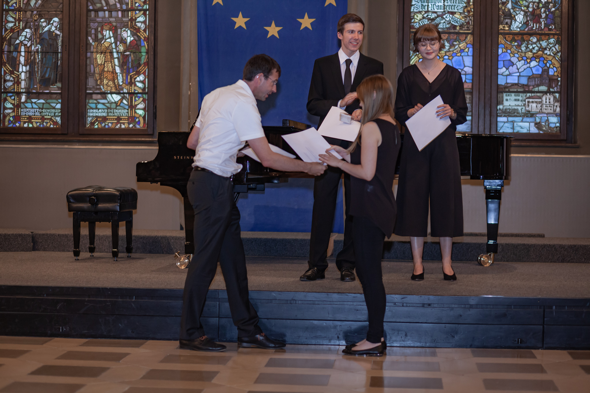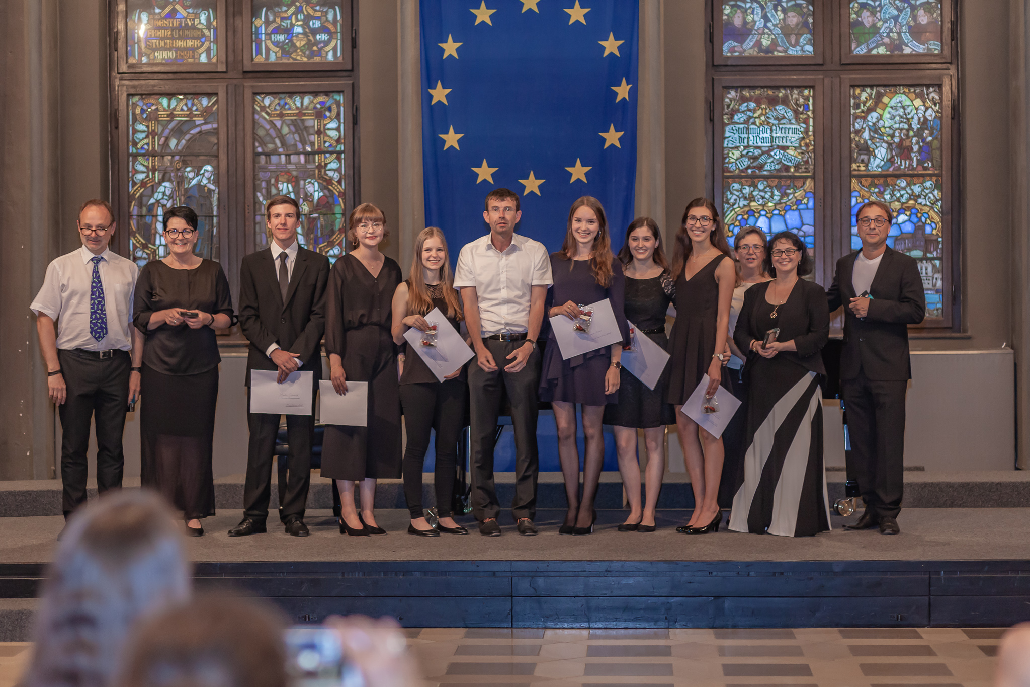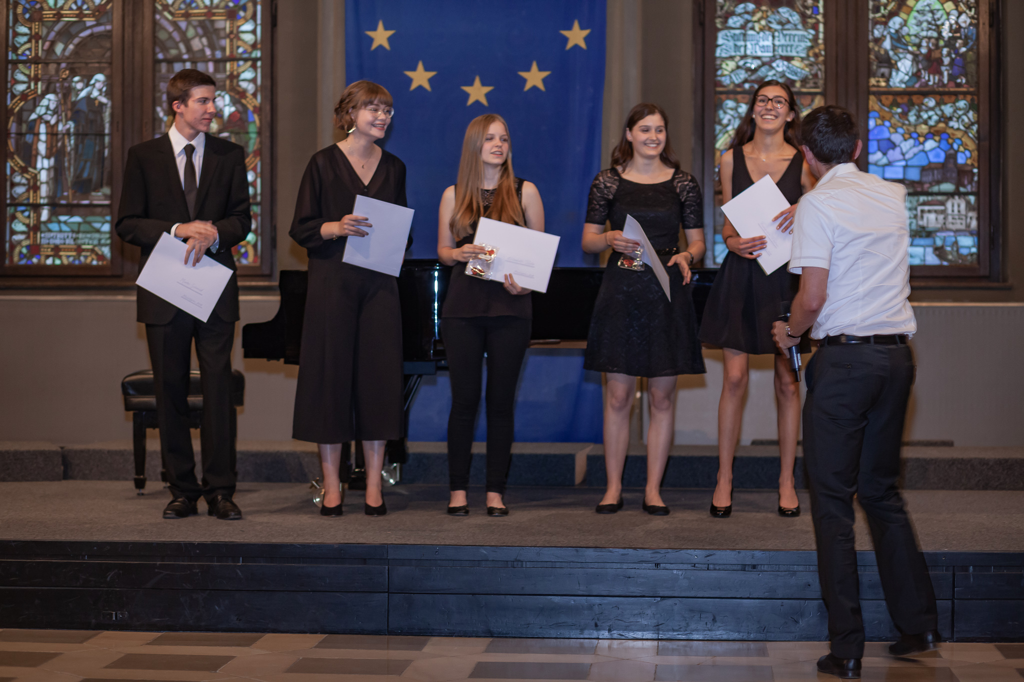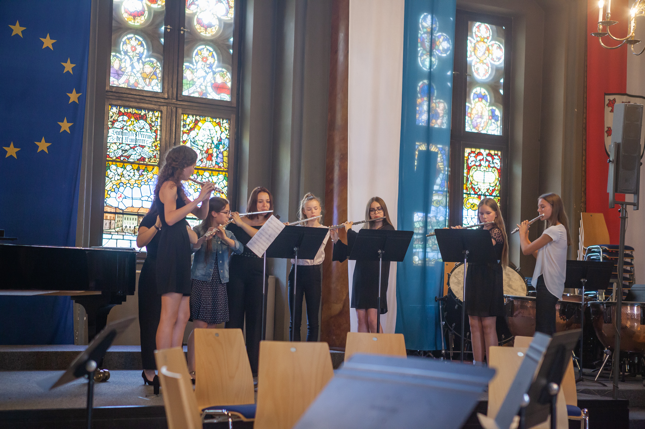 Der Schulchef verlieh den Großen Musikpreis an fünf weitere Schüler. Er würdigte Franziska Fischer, die sich in vielfältiger Weise musikalisch in das Schulleben einbrachte. Sie habe mit ihrem Violinspiel Orchester und Kammermusik bereichert und mit ihrem Streichquartett große Erfolge bei "Jugend musiziert" erzielt. Herausragende Leistungen habe sie auch im Chor gezeigt. Elisabeth Pontz könne mit ihrer klaren, analytischen Denkweise musikalische Zusammenhänge erfassen und in ihrer geschliffenen Sprache wiedergeben. Sie verfüge zudem über ausgezeichnete musikalische Fähigkeiten. Im Chor sei sie eine erfahrenen Sängerin, die auch in kleinen Ensembles zu begeistern und überzeugen weiß. Marie Groß sei ebenfalls eine hervorragende Sängerin, die auch andere zu Chor- und Ensemblearbeit animiere. Sie habe seit der fünften Klasse in Musikgruppen und Projekten mitgewirkt und auch Erfolge bei "Jugend musiziert" gefeiert. Elena Breinfalk überzeuge als herausragende Pianistin, sagte Zitzl. Zahlreiche Meisterkurse belegten die hohe Qualität ihres musikalischen Könnens. Sie setze ihre vielseitige musikalische Begabung in großem Umfang und auf höchstem Niveau ein. Martin Schmid habe in vorbildlicher Weise das Orchester unterstützt und Konzerte bereichert. Er habe seine Aufgabe als Konzertmeister in vollster Zufriedenheit und mit großem Engegement weit über das übliche Maß der Probenarbeit erfüllt. Außerdem habe er in Projekten und als erster Geiger in Kammermusiken mitgewirkt sowie mit seinem Streichquartett beim Landeswettbewerb "Jugend musiziert" geglänzt, sei humorvoll und erfrischend.
