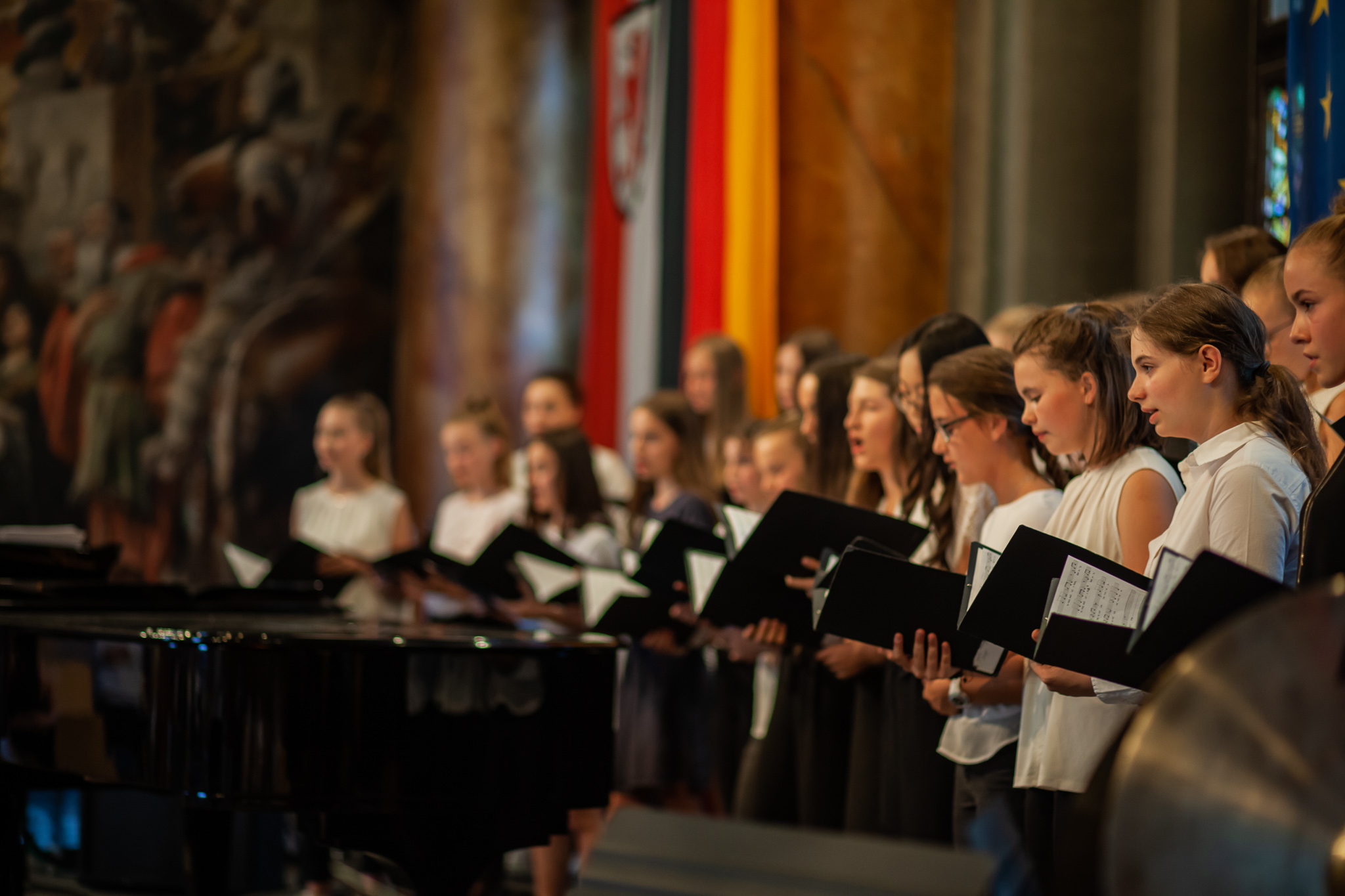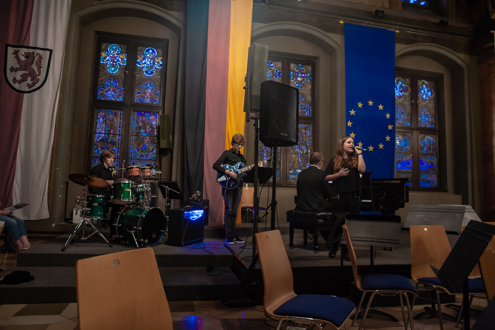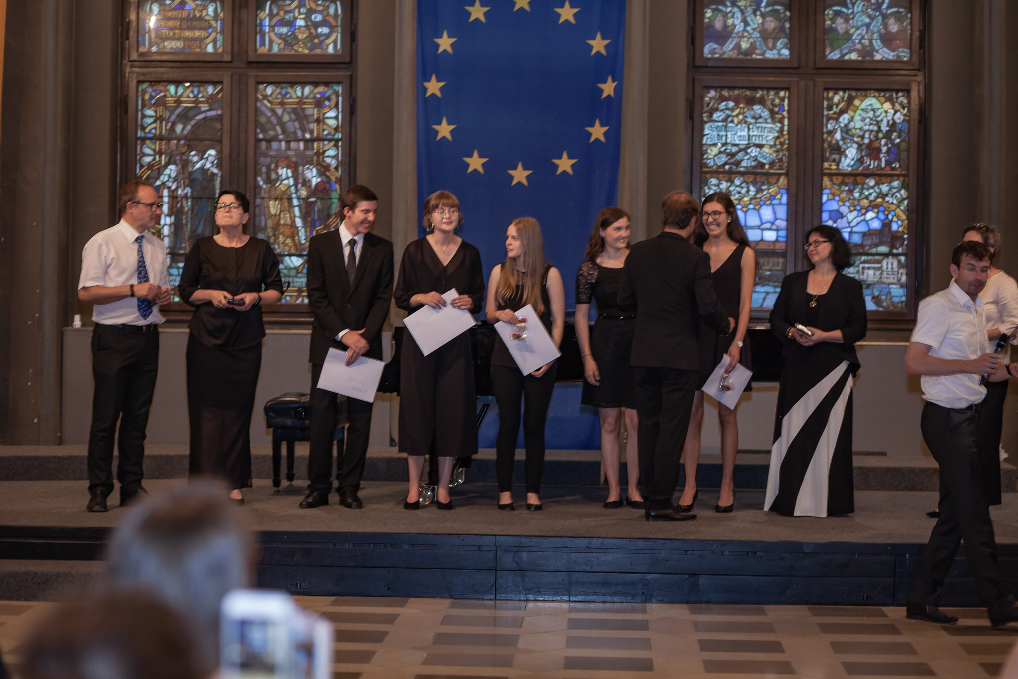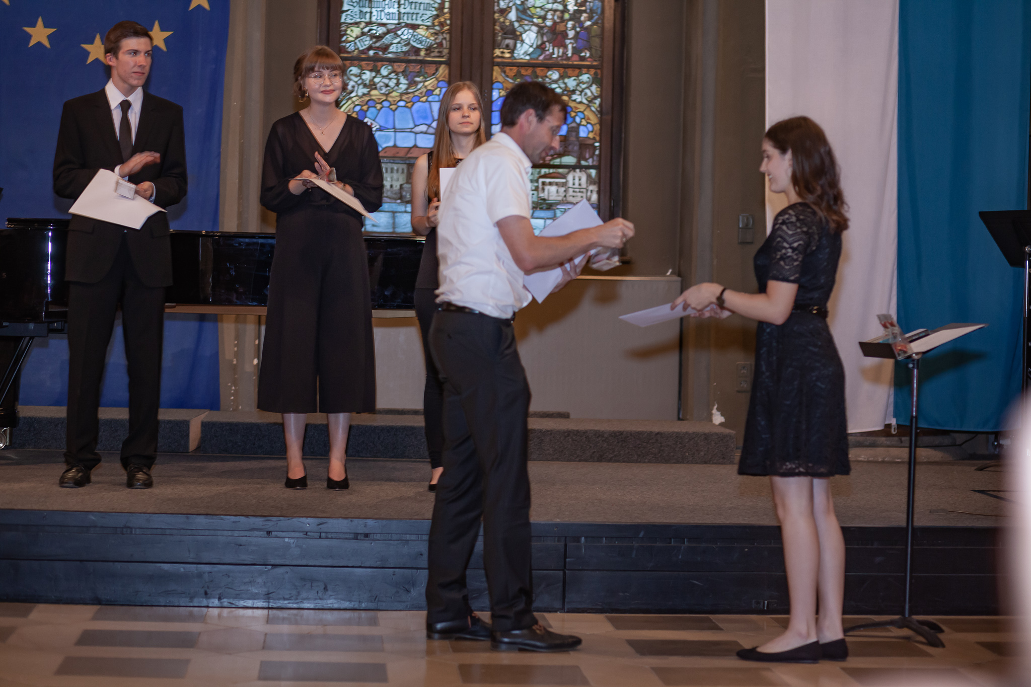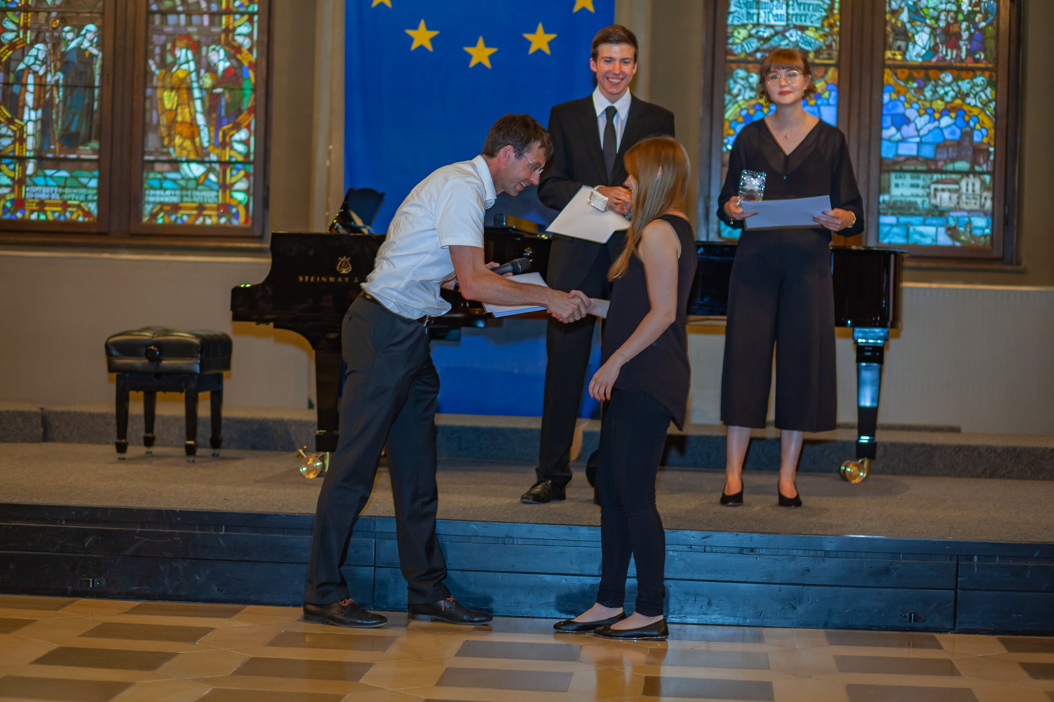 Der Schulchef verlieh den Großen Musikpreis an fünf weitere Schüler. Er würdigte Franziska Fischer, die sich in vielfältiger Weise musikalisch in das Schulleben einbrachte. Sie habe mit ihrem Violinspiel Orchester und Kammermusik bereichert und mit ihrem Streichquartett große Erfolge bei "Jugend musiziert" erzielt. Herausragende Leistungen habe sie auch im Chor gezeigt. Elisabeth Pontz könne mit ihrer klaren, analytischen Denkweise musikalische Zusammenhänge erfassen und in ihrer geschliffenen Sprache wiedergeben. Sie verfüge zudem über ausgezeichnete musikalische Fähigkeiten. Im Chor sei sie eine erfahrenen Sängerin, die auch in kleinen Ensembles zu begeistern und überzeugen weiß. Marie Groß sei ebenfalls eine hervorragende Sängerin, die auch andere zu Chor- und Ensemblearbeit animiere. Sie habe seit der fünften Klasse in Musikgruppen und Projekten mitgewirkt und auch Erfolge bei "Jugend musiziert" gefeiert. Elena Breinfalk überzeuge als herausragende Pianistin, sagte Zitzl. Zahlreiche Meisterkurse belegten die hohe Qualität ihres musikalischen Könnens. Sie setze ihre vielseitige musikalische Begabung in großem Umfang und auf höchstem Niveau ein. Martin Schmid habe in vorbildlicher Weise das Orchester unterstützt und Konzerte bereichert. Er habe seine Aufgabe als Konzertmeister in vollster Zufriedenheit und mit großem Engegement weit über das übliche Maß der Probenarbeit erfüllt. Außerdem habe er in Projekten und als erster Geiger in Kammermusiken mitgewirkt sowie mit seinem Streichquartett beim Landeswettbewerb "Jugend musiziert" geglänzt, sei humorvoll und erfrischend.