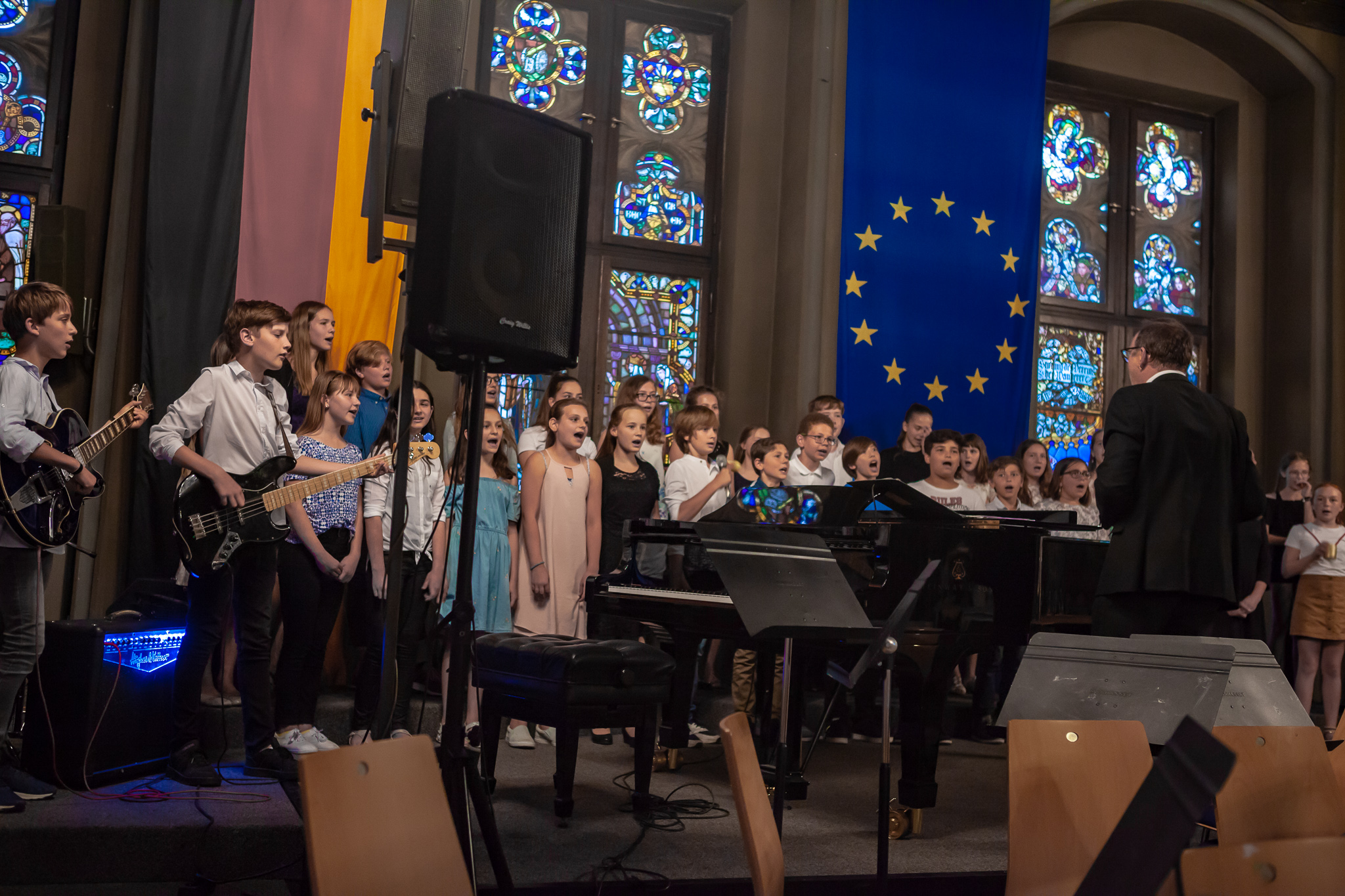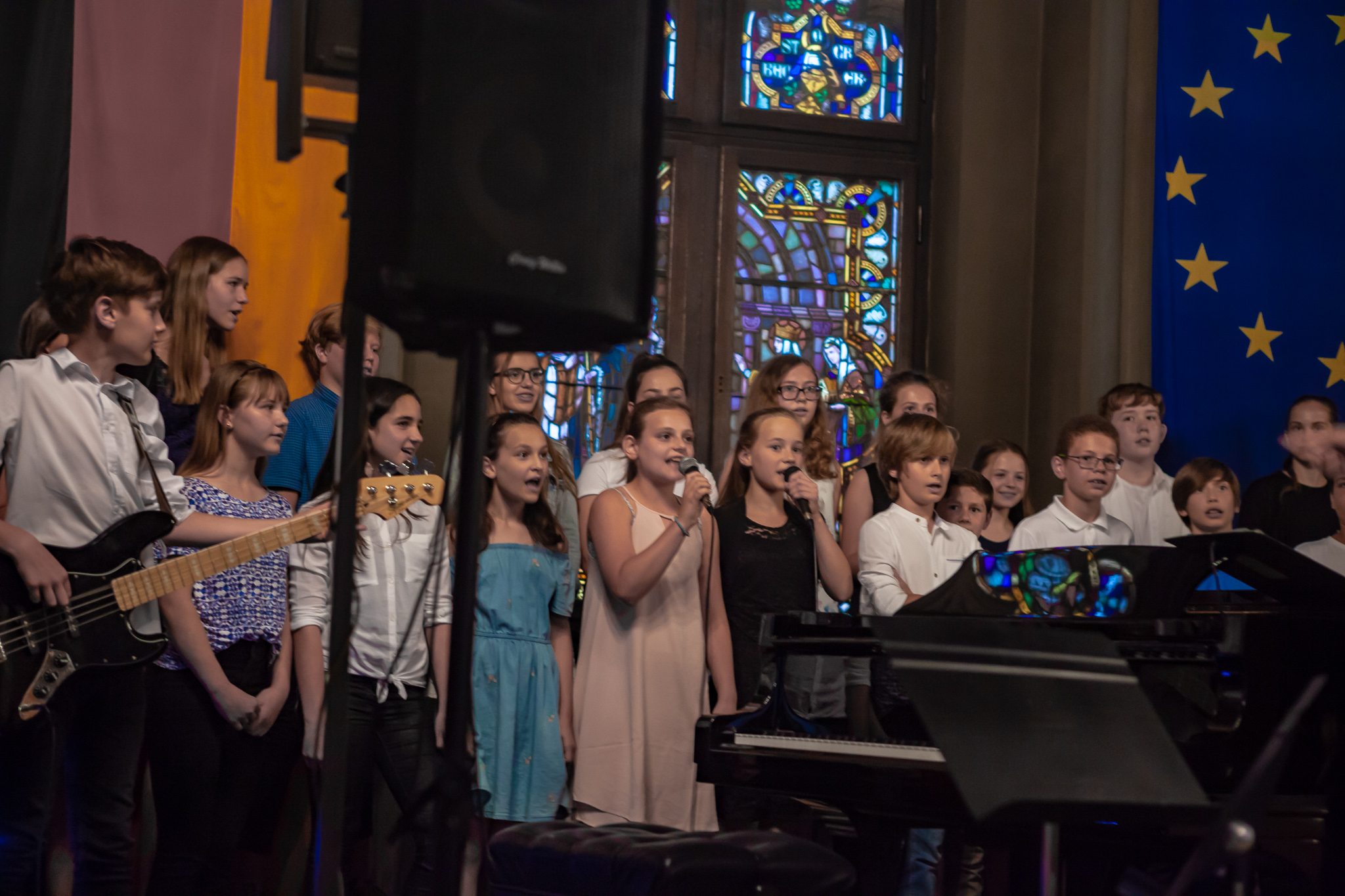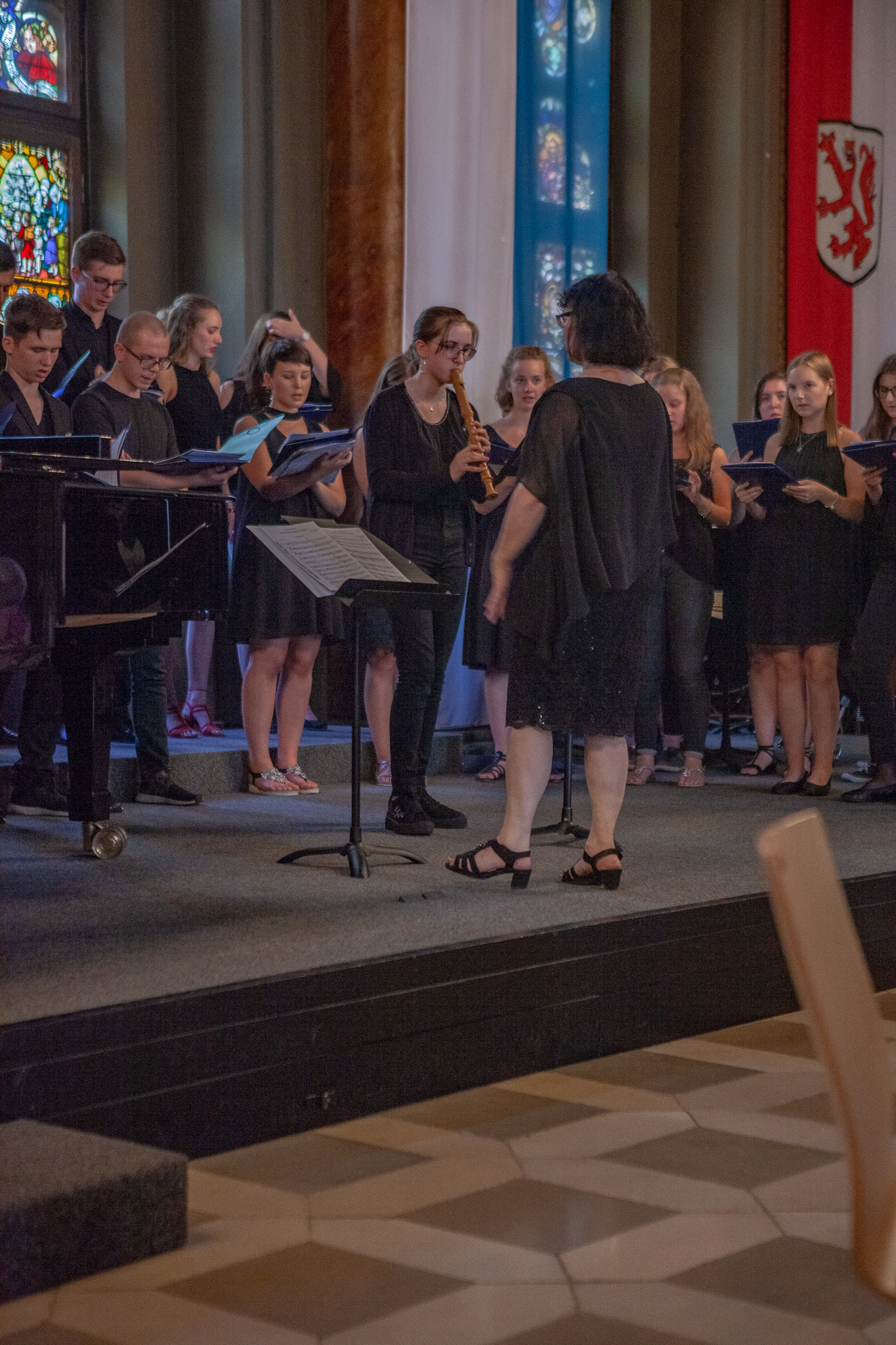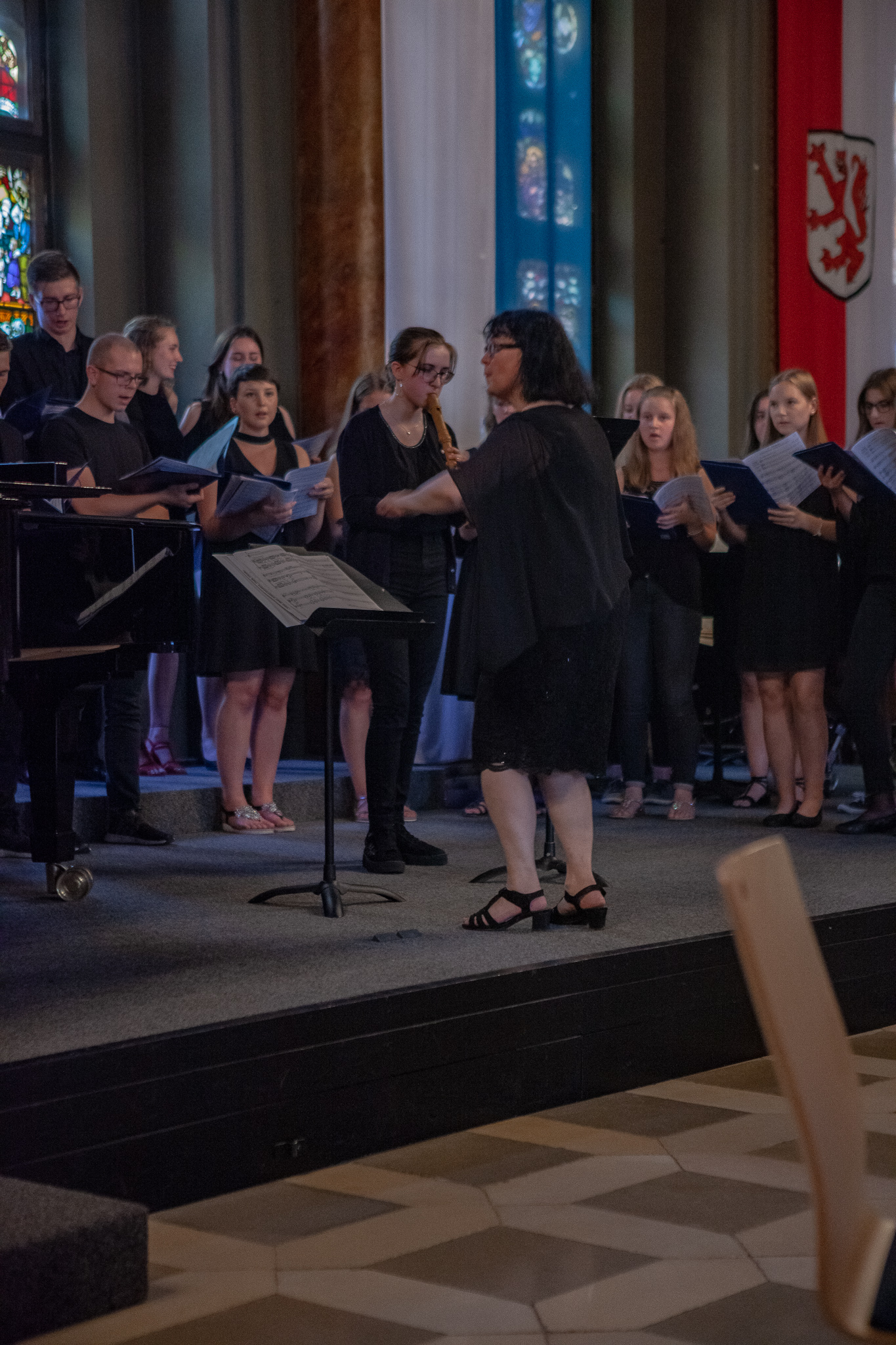 Micht minder faszinierend stellte sich der riesige vier- bis sechststimmige Oberstufenchor unter der Regie von Brigitte Glas und Kurt Brunner vor, der mit dem Mitmachstück "Sing with us" einlud und mit einem virtuosen "Africa" von Toto, bei dem die Sänger mit Klatschen und Stampfen tropischen Regenwald, Wolkenbruch, Blitz und Donner inszenierten, für Beifall sorgte. Er beeindruckte auch mit dem geistlichen Lied "God be in my head" von John Rutter, einem modernen Chorstück mit perkussiven Elementen und Kunstsprache, sowie "Adiemus" von Karl Jenkins, mit dem der Chor im Januar 2019 in der New Yorker Carnegie Hall aufwarten wird. Am zweiten Abend strahten Frauen- und Männerchor zuerst getrennt, dann gemeinsam mit "What a wonderful world".