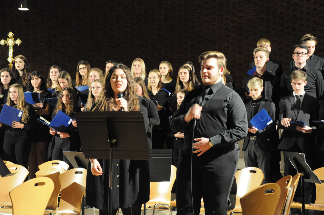 Diesen bereicherte das Bläserensemble "Freudenblech" unter der Leitung von Christoph Rose, das Kompositionen von J. Groh spielte. Das Unter- und Mittelstufenorchester präsentierte unter der Regie von Brigitte Glas ausdrucksstarke Melodien, darunter einen traditionellen spanischen Choral. Schwungvolle italienische Weihnachtslieder brachte der Chor der 5. und 6. Klassen von Christoph Rose dar. Pia Martin (Sopran) und das Querflötenensemble warteten mit der anspruchsvollen Aria "Hört doch! Der sanften Flöten Chor" aus der Bach-Kantate BMV 206 auf. Moderne englische Weihnachtsgesänge bot der Chor der 7. und 8. Klassen unter der Leitung von Claudia Seibold dar, darunter das rhythmische mehrstimmige "Singin' on Christmas Morn".