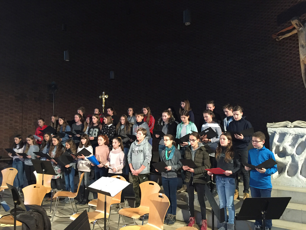 Solisten Jennifer Schäfer und Niklas Czerny anrührend und aus vollen Kehlen das "Sternstundenlied", die Kurt Brunner am Piano und Perkussionisten begleiteten. Die jungen Interpreten, die den gesamten Altarraum ausfüllten und ein eindrucksvolles Bild boten, setzten damit unter der Leitung von Brigitte Glas den großartigen Höhepunkt und glanzvollen Abschluss des Benefizabends.
