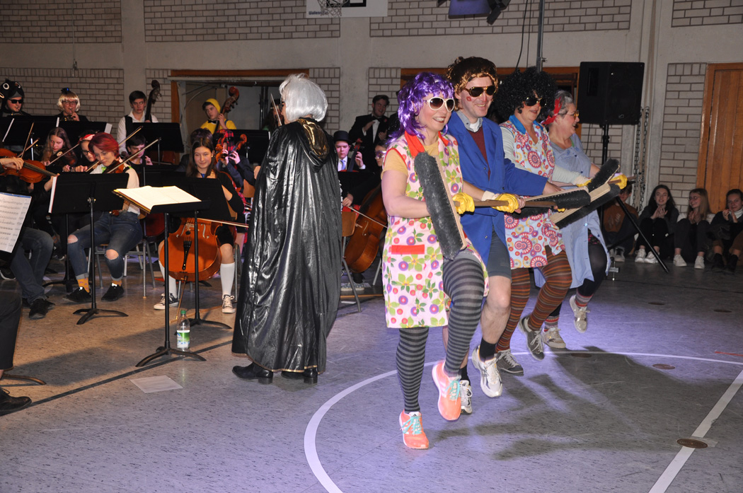 Beim rhythmischen “Libertango“ mischte sich gar ein Lehrer, nämlich Gerhard Baier mit seinem Akkordeon, unter das Orchester und beeindruckte durch sein virtuoses Spiel. Bezaubernde Operetten-Duette gaben Antonia Lerchl und Niklas Czerny, aber auch Amelie Kahlert und Paul Färber zum Besten. Dazwischen brachte Tim Kurbegovic aus der Klasse 10b das Publikum mit seinen „Gedanken zur bayerischen Leberkässemmel“ zum Lachen, da natürlich viele die darin karikierten Lehrer erkannten. Der Besentanz der vierköpfigen Lehrer-Dance Company „Die flotten Feger“ zu Jacques Offenbachs CanCan brachte die Turnhalle vor der Pause zum Toben und wurde als Gute-Nacht-Gruß am Schluss dieses aufheiternden Abends wiederholt.