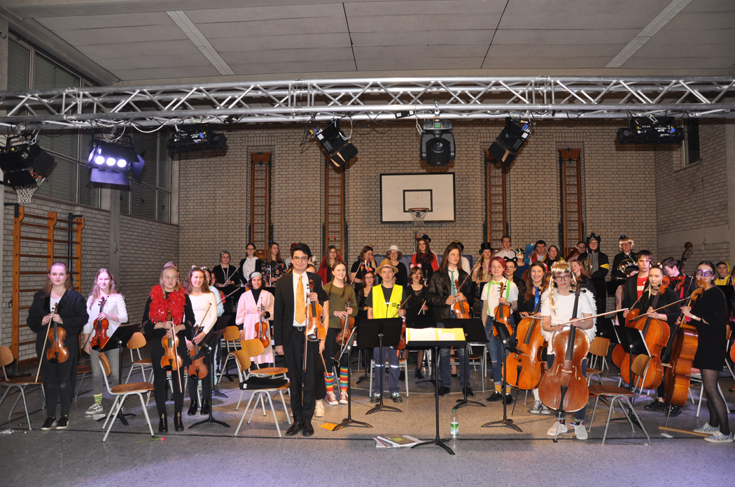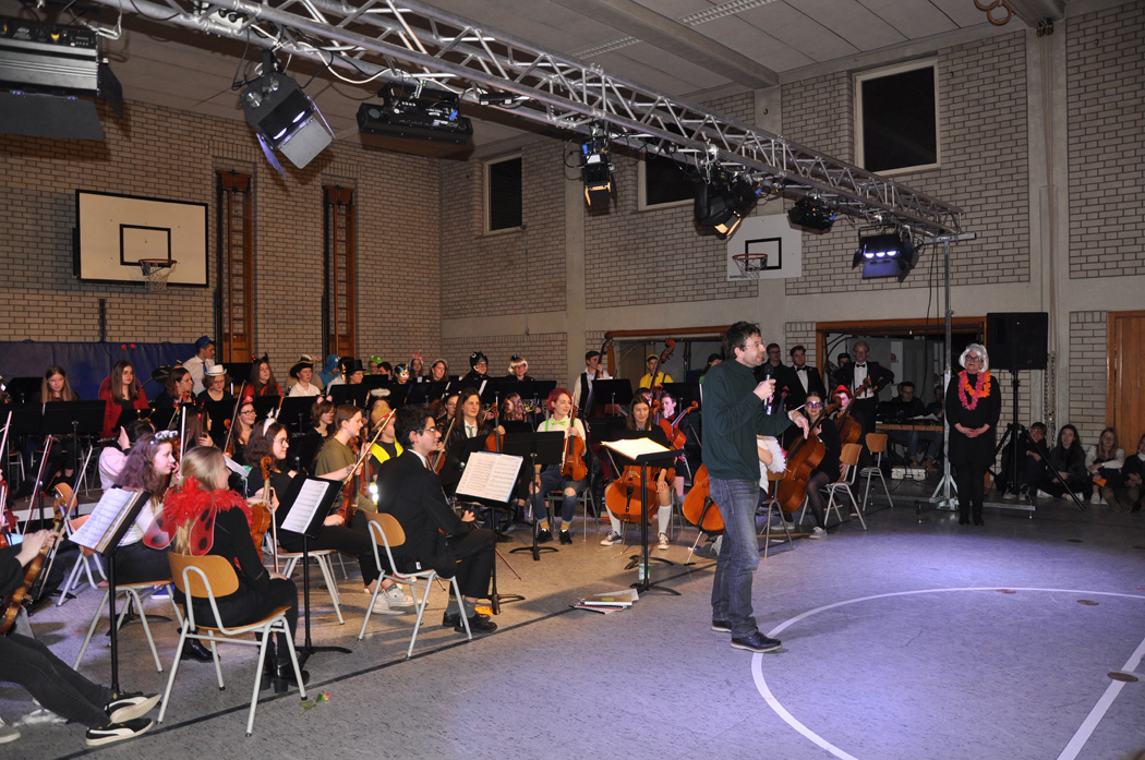 Beste Stimmung herrschte am Mittwoch beim ersten Faschingskonzert am Auersperg-Gymnasium in der vollbesetzten Turnhalle. Die Idee zu diesem bunten Abend hatte Musiklehrerin Margit Weinberger, Leiterin des Oberstufenorchesters, die schwungvoll dirigierte und dazwischen humorvoll von einer Darbietung zur nächsten moderierte. Sie hatte mit ihrem unheimlich disziplinierten und motivierten Orchester viele mitreißende Stücke einstudiert, die mit bewundernswerter Präzision und Dynamik vorgetragen wurden, zum Beispiel die Suite „Palladio“ von Karl Jenkins oder das fulminante Finale „The Pirates oft the Caribbean“.