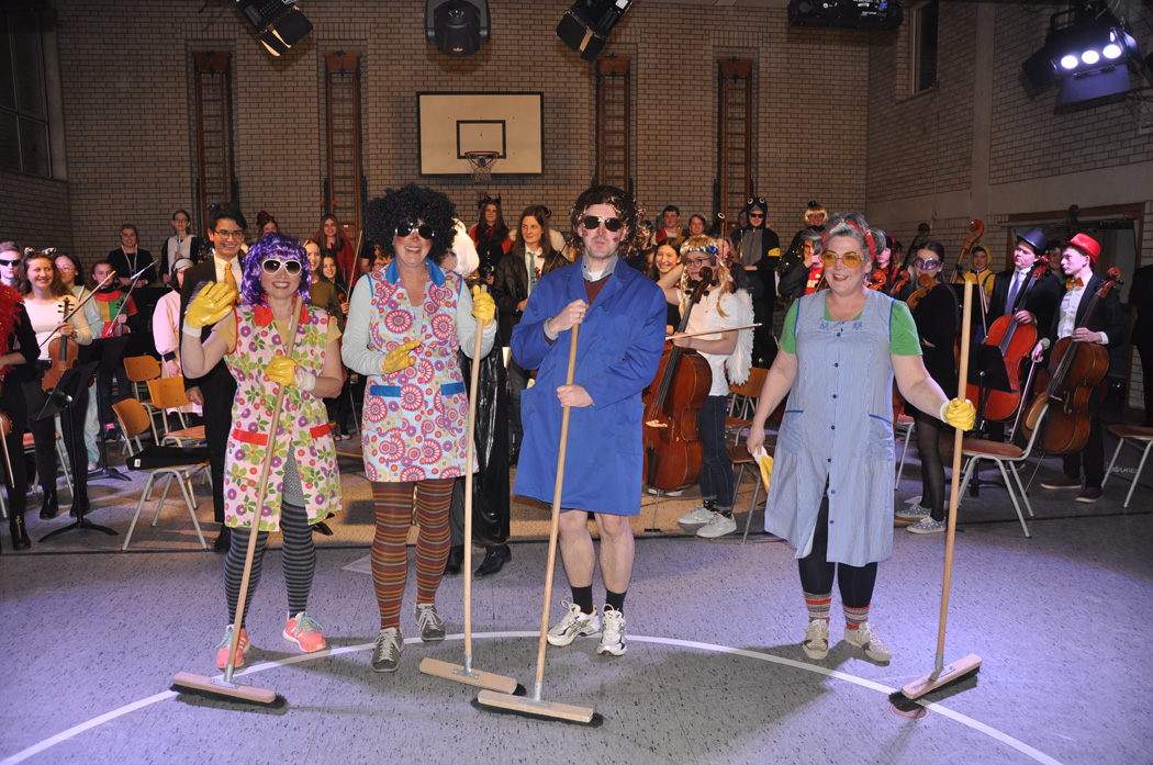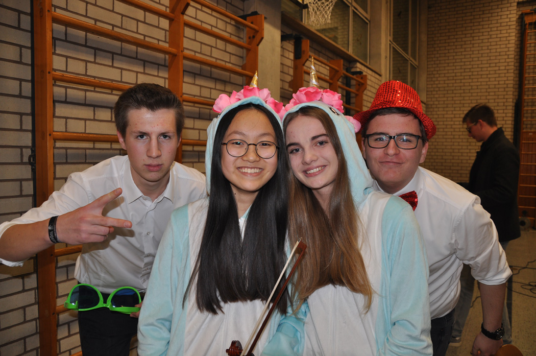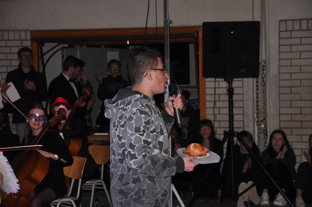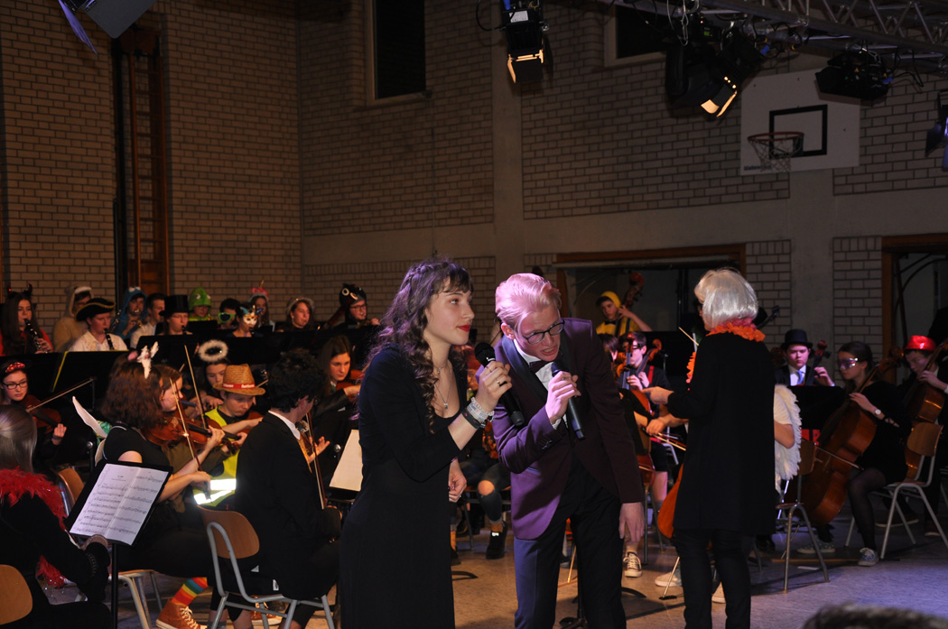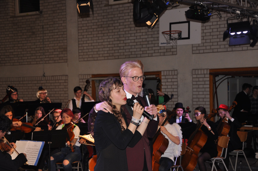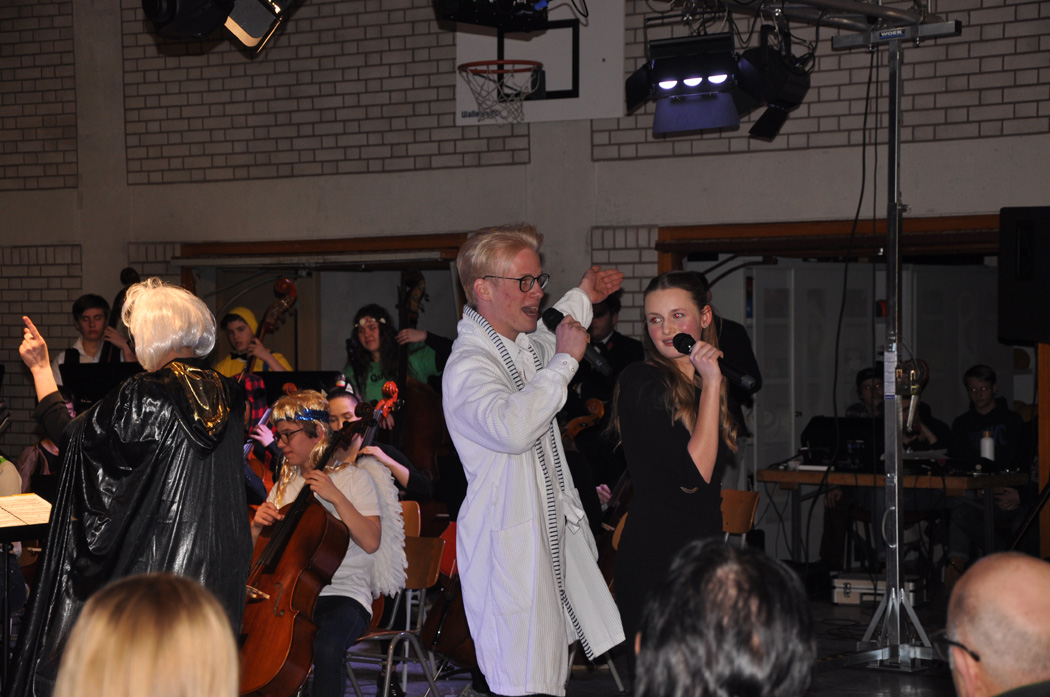 Beim rhythmischen “Libertango“ mischte sich gar ein Lehrer, nämlich Gerhard Baier mit seinem Akkordeon, unter das Orchester und beeindruckte durch sein virtuoses Spiel. Bezaubernde Operetten-Duette gaben Antonia Lerchl und Niklas Czerny, aber auch Amelie Kahlert und Paul Färber zum Besten. Dazwischen brachte Tim Kurbegovic aus der Klasse 10b das Publikum mit seinen „Gedanken zur bayerischen Leberkässemmel“ zum Lachen, da natürlich viele die darin karikierten Lehrer erkannten. Der Besentanz der vierköpfigen Lehrer-Dance Company „Die flotten Feger“ zu Jacques Offenbachs CanCan brachte die Turnhalle vor der Pause zum Toben und wurde als Gute-Nacht-Gruß am Schluss dieses aufheiternden Abends wiederholt.