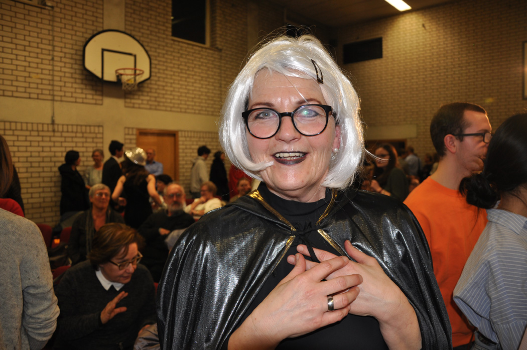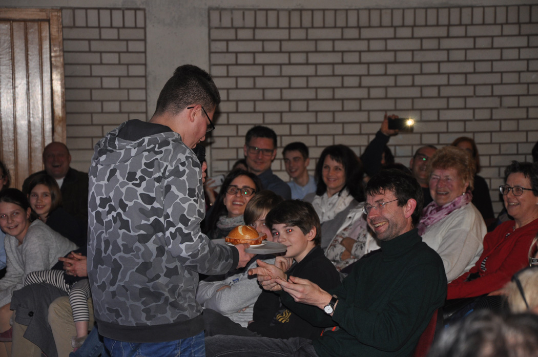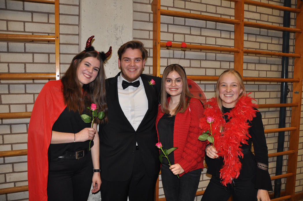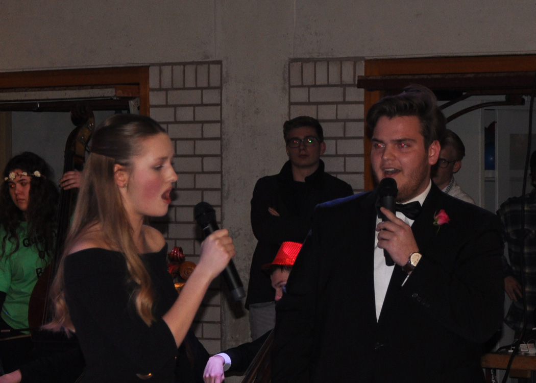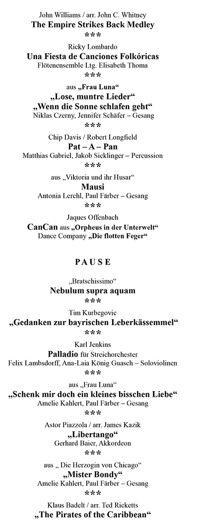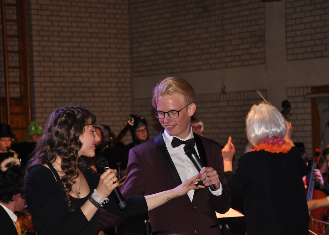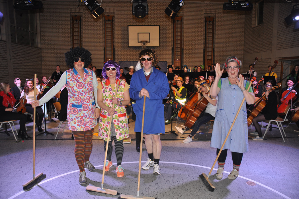 Beim rhythmischen “Libertango“ mischte sich gar ein Lehrer, nämlich Gerhard Baier mit seinem Akkordeon, unter das Orchester und beeindruckte durch sein virtuoses Spiel. Bezaubernde Operetten-Duette gaben Antonia Lerchl und Niklas Czerny, aber auch Amelie Kahlert und Paul Färber zum Besten. Dazwischen brachte Tim Kurbegovic aus der Klasse 10b das Publikum mit seinen „Gedanken zur bayerischen Leberkässemmel“ zum Lachen, da natürlich viele die darin karikierten Lehrer erkannten. Der Besentanz der vierköpfigen Lehrer-Dance Company „Die flotten Feger“ zu Jacques Offenbachs CanCan brachte die Turnhalle vor der Pause zum Toben und wurde als Gute-Nacht-Gruß am Schluss dieses aufheiternden Abends wiederholt.