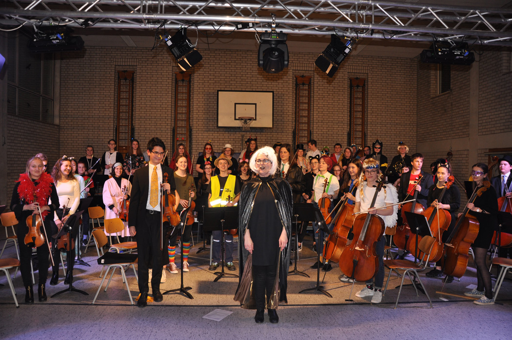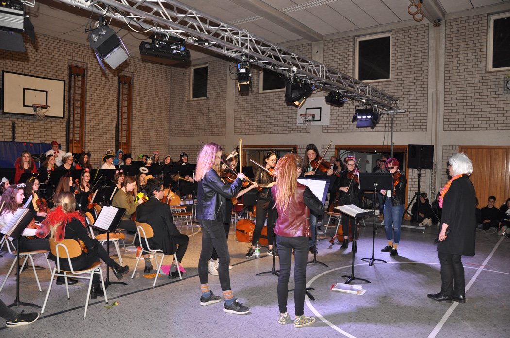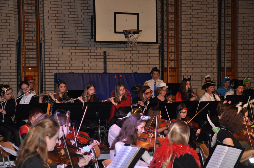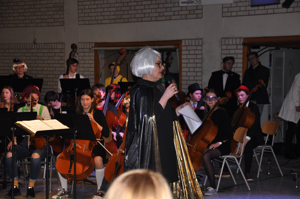 Beste Stimmung herrschte am Mittwoch beim ersten Faschingskonzert am Auersperg-Gymnasium in der vollbesetzten Turnhalle. Die Idee zu diesem bunten Abend hatte Musiklehrerin Margit Weinberger, Leiterin des Oberstufenorchesters, die schwungvoll dirigierte und dazwischen humorvoll von einer Darbietung zur nächsten moderierte. Sie hatte mit ihrem unheimlich disziplinierten und motivierten Orchester viele mitreißende Stücke einstudiert, die mit bewundernswerter Präzision und Dynamik vorgetragen wurden, zum Beispiel die Suite „Palladio“ von Karl Jenkins oder das fulminante Finale „The Pirates oft the Caribbean“.