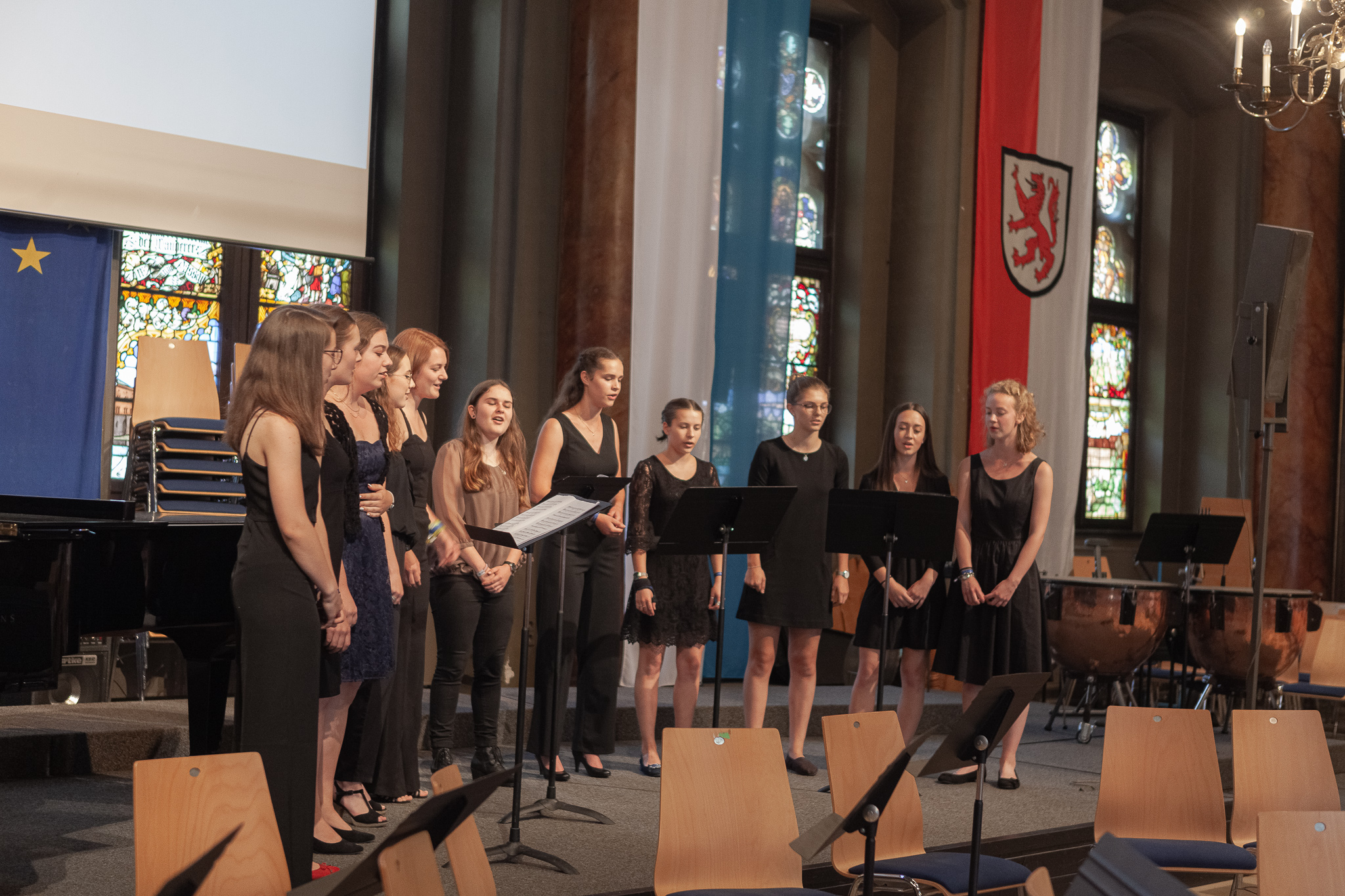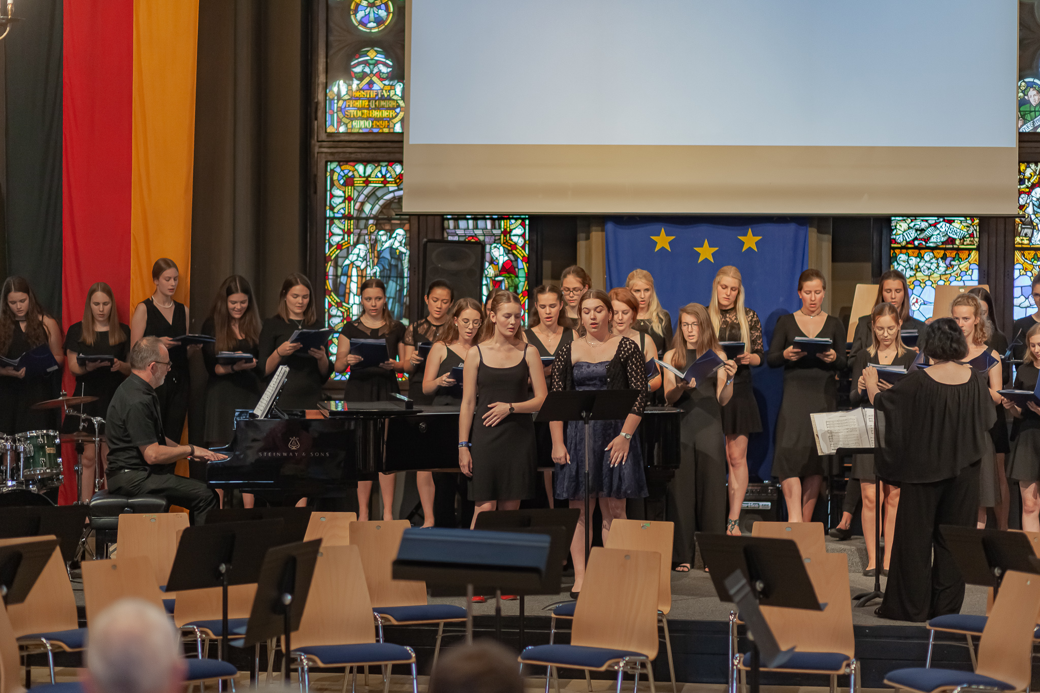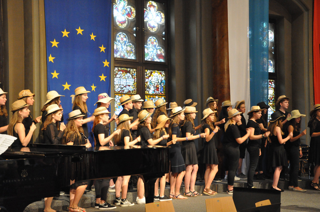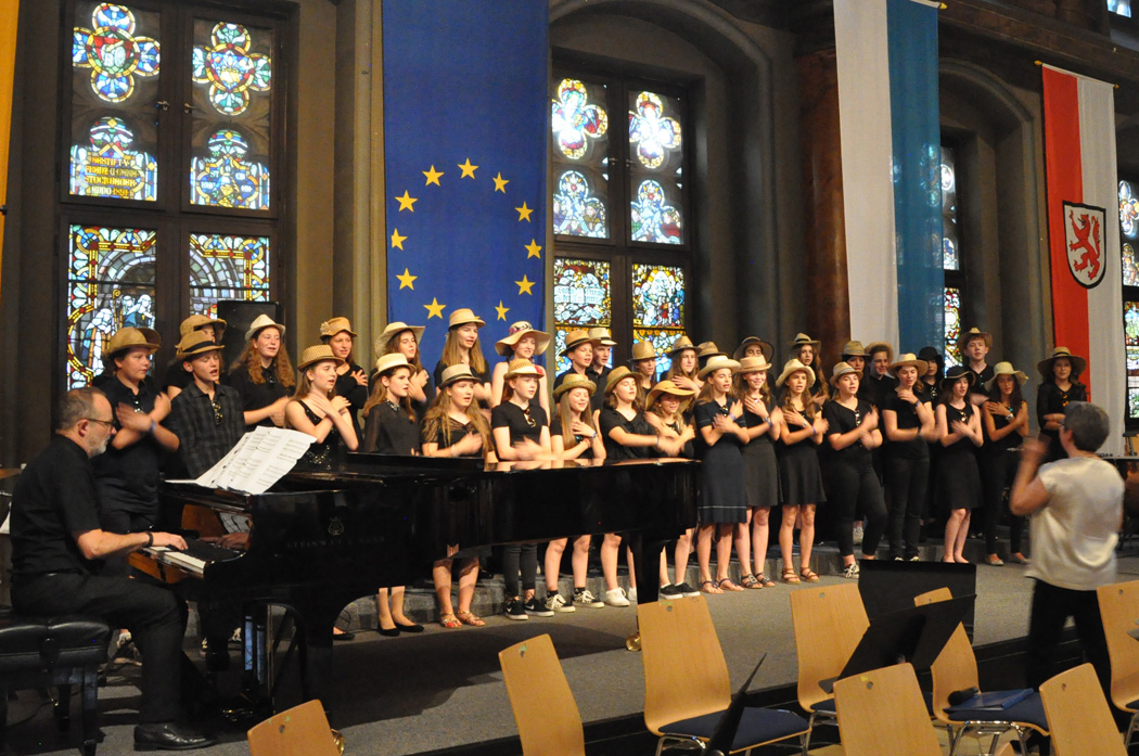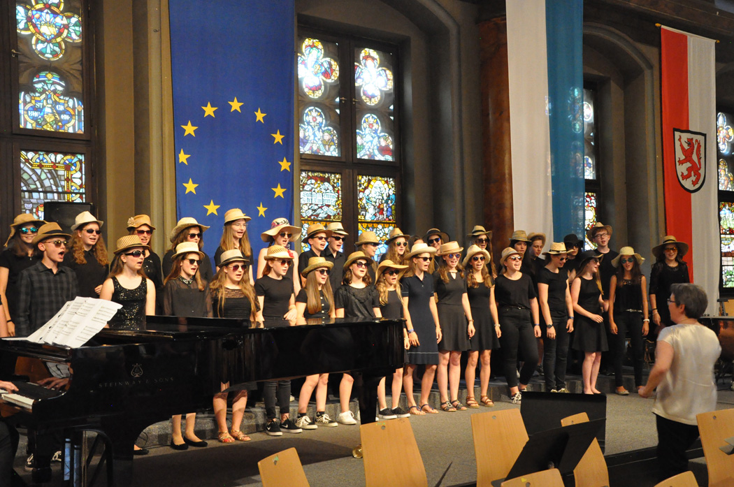 Für Gänsehaut-Momente sorgte auch der riesige Oberstufenchor unter der Leitung von Brigitte Glas mit dem Pop-Klassiker „Streets of London“ und Filmmusik aus „Die Schöne und das Biest“, bei der Solist Maximilian Weiß den Ton angab. Solistin Jennifer Schäfer eroberte mit „Die Nacht“ von Richard Strauss die Herzen und der Frauenchor mit der angesagten Komposition „Flight Song“. Zu den Gesangswerken „Elegia“ und „Adiemus“ von Karl Jenkins erschienen Bilder aus New York auf einer Leinwand, die Eindrücke vom Auftritt der Sänger in der Carnegie Hall in Manhattan heuer im Februar vermittelten. Dass sie mit ihren herrlichen Stimmen die Gewinner sind, zeigte der „Rocky“-Siegersong „Eye of the Tiger“.