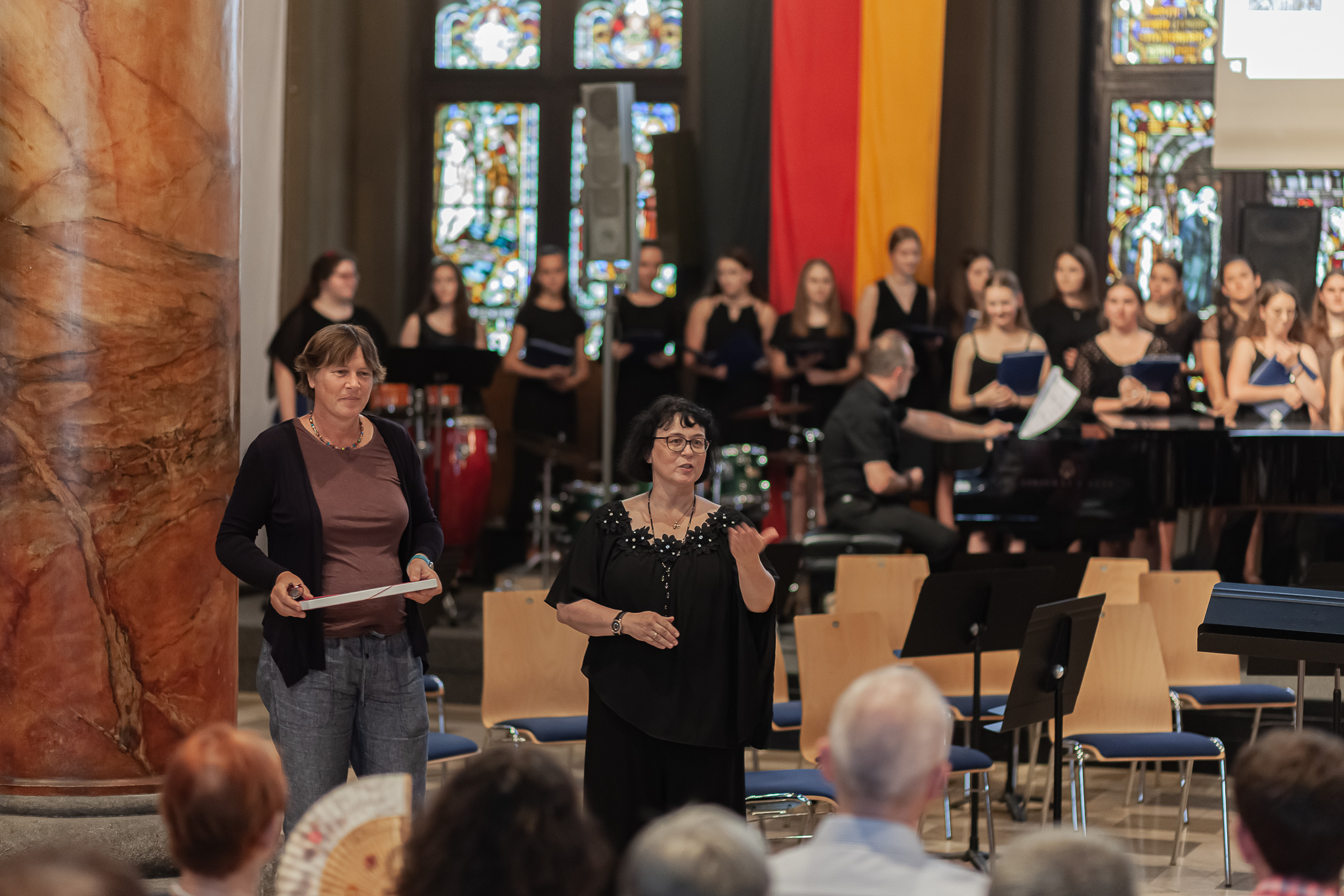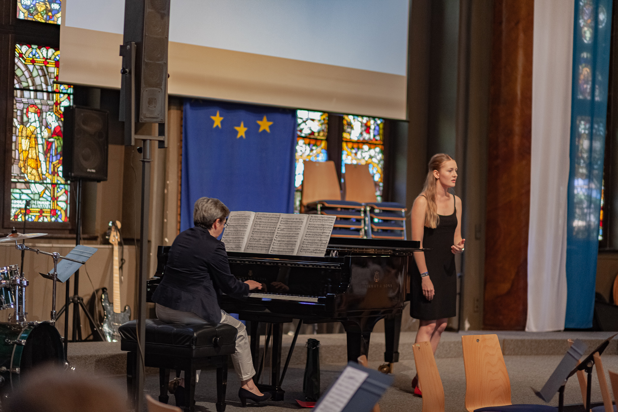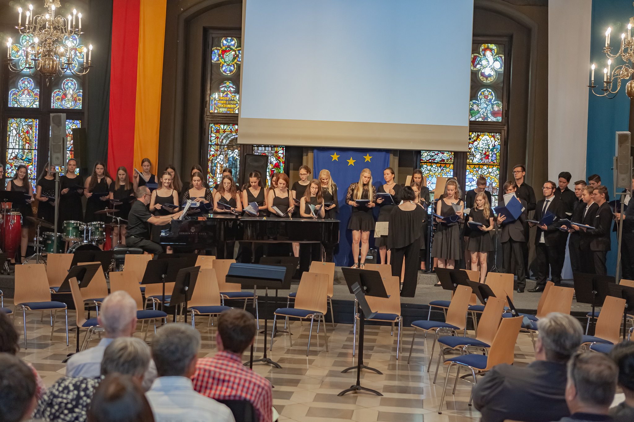 Für Gänsehaut-Momente sorgte auch der riesige Oberstufenchor unter der Leitung von Brigitte Glas mit dem Pop-Klassiker „Streets of London“ und Filmmusik aus „Die Schöne und das Biest“, bei der Solist Maximilian Weiß den Ton angab. Solistin Jennifer Schäfer eroberte mit „Die Nacht“ von Richard Strauss die Herzen und der Frauenchor mit der angesagten Komposition „Flight Song“. Zu den Gesangswerken „Elegia“ und „Adiemus“ von Karl Jenkins erschienen Bilder aus New York auf einer Leinwand, die Eindrücke vom Auftritt der Sänger in der Carnegie Hall in Manhattan heuer im Februar vermittelten. Dass sie mit ihren herrlichen Stimmen die Gewinner sind, zeigte der „Rocky“-Siegersong „Eye of the Tiger“.