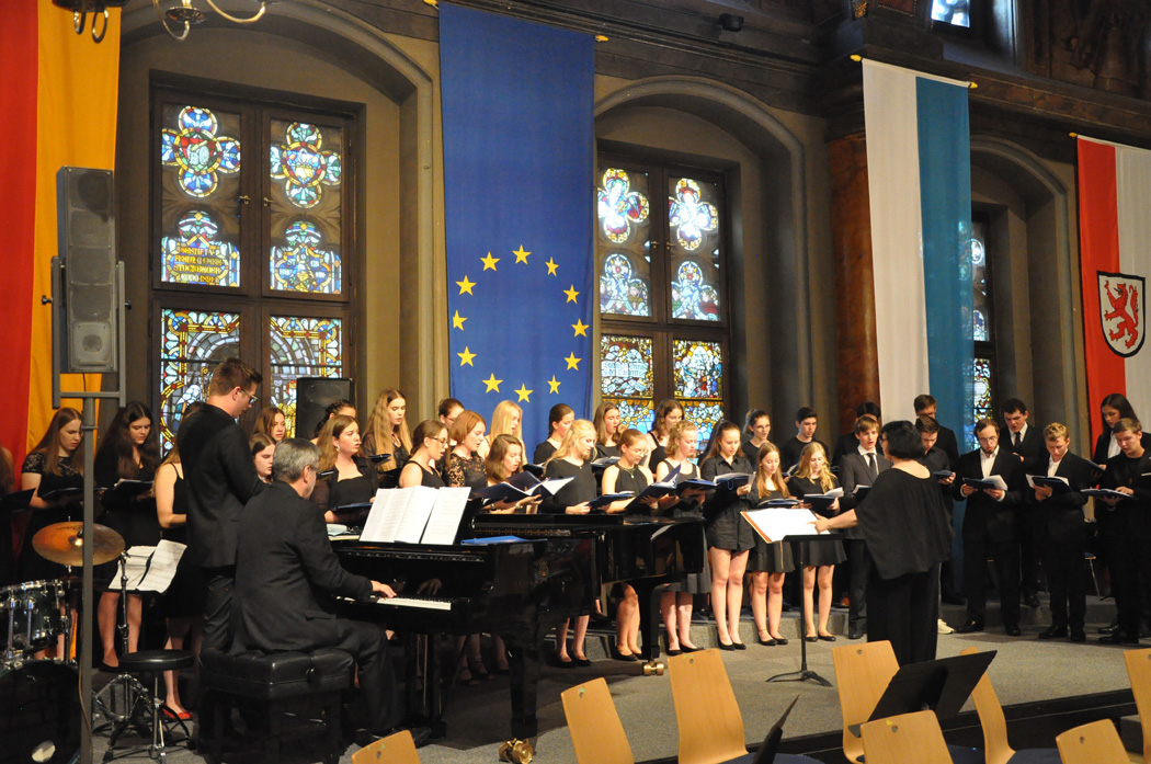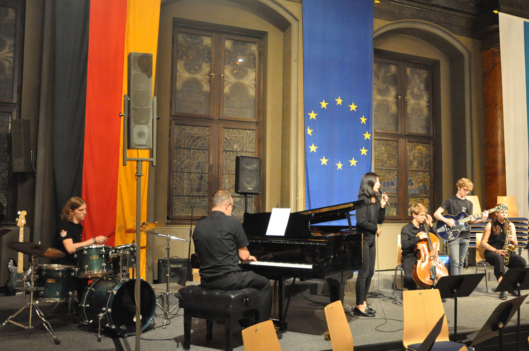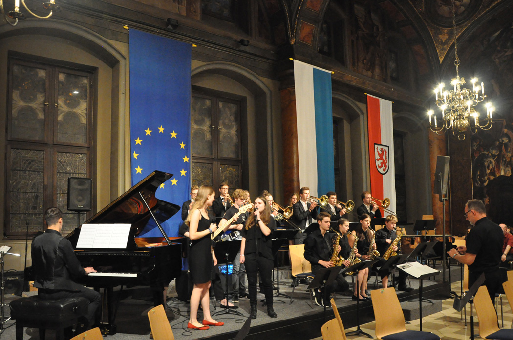 Der Chor der fünften und sechsten Klassen unter der Regie von Christoph Rose erfreute mit einem traditionellen bayerischen Lied und regte mit dem „Earth Song“ von Michael Jackson zum Nachdenken an. Maximilian Weiß beeindruckte mit einem Basssolo von Johann Sebastian Bach und der Mittelstufenchor unter der Leitung von Claudia Seibold brachte zeitgenössische Titel und „On the sunny side of the street“ zu Gehör. Das Querflötenensemble unter der Regie von Elisabeth Thoma ließ südländische Rhythmen von Astor Piazzolla erklingen und die Jazz-Combo 12 lud mit Duke Ellington zum Swingen ein. Die Bigband unter der Leitung von Christoph Rose brachte die Besuchermit den herrlichen Solostimmen von Alina Striedl und Antonia Lerchl zum Jubeln und die Rathauswände zum Zittern. Auch sie erntete nach der Zugabe „Birdland“ als „Rausschmeißer“ stehende Ovationen.