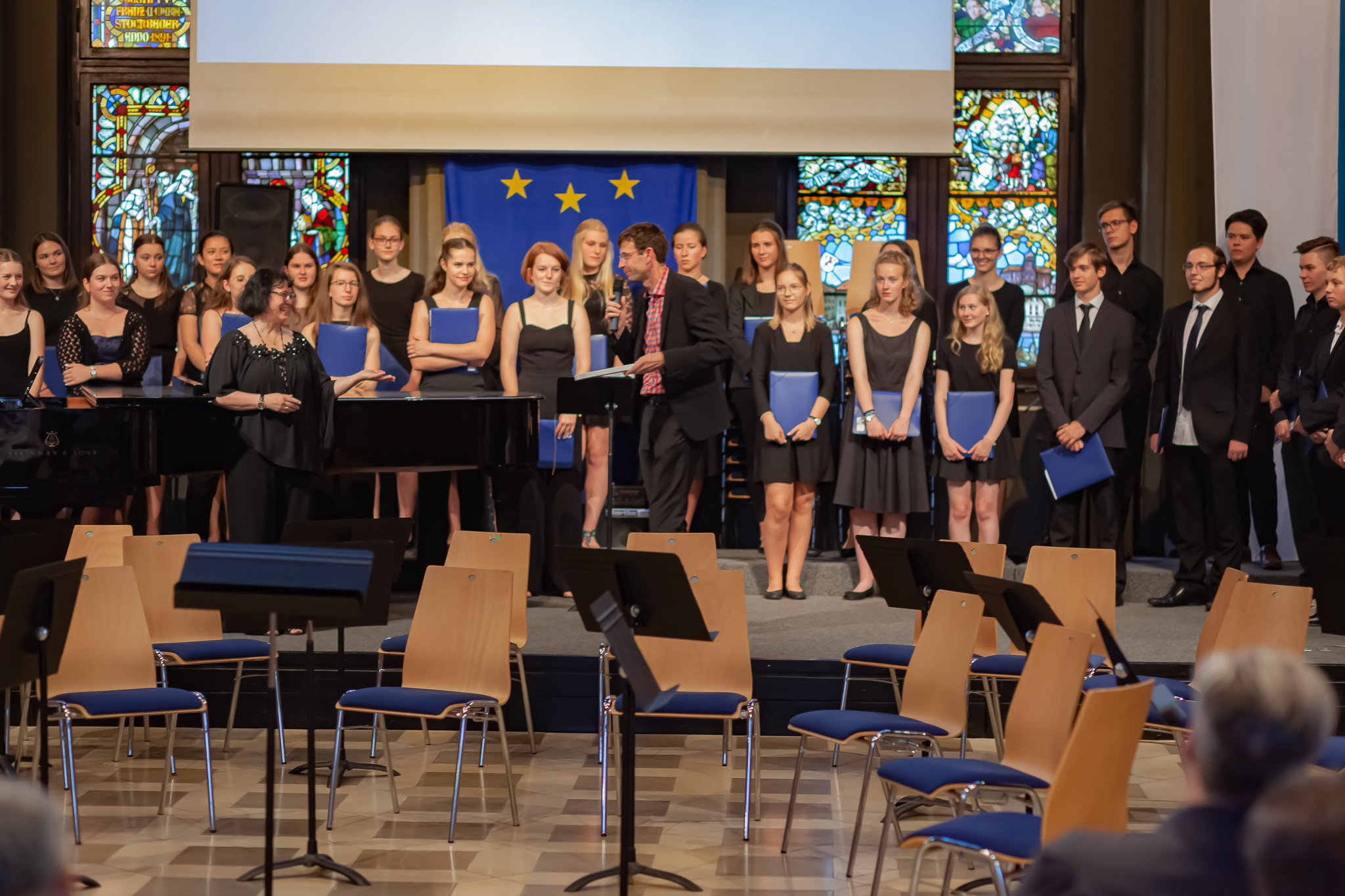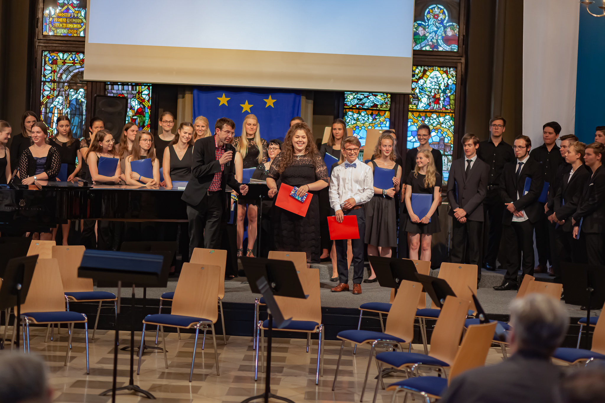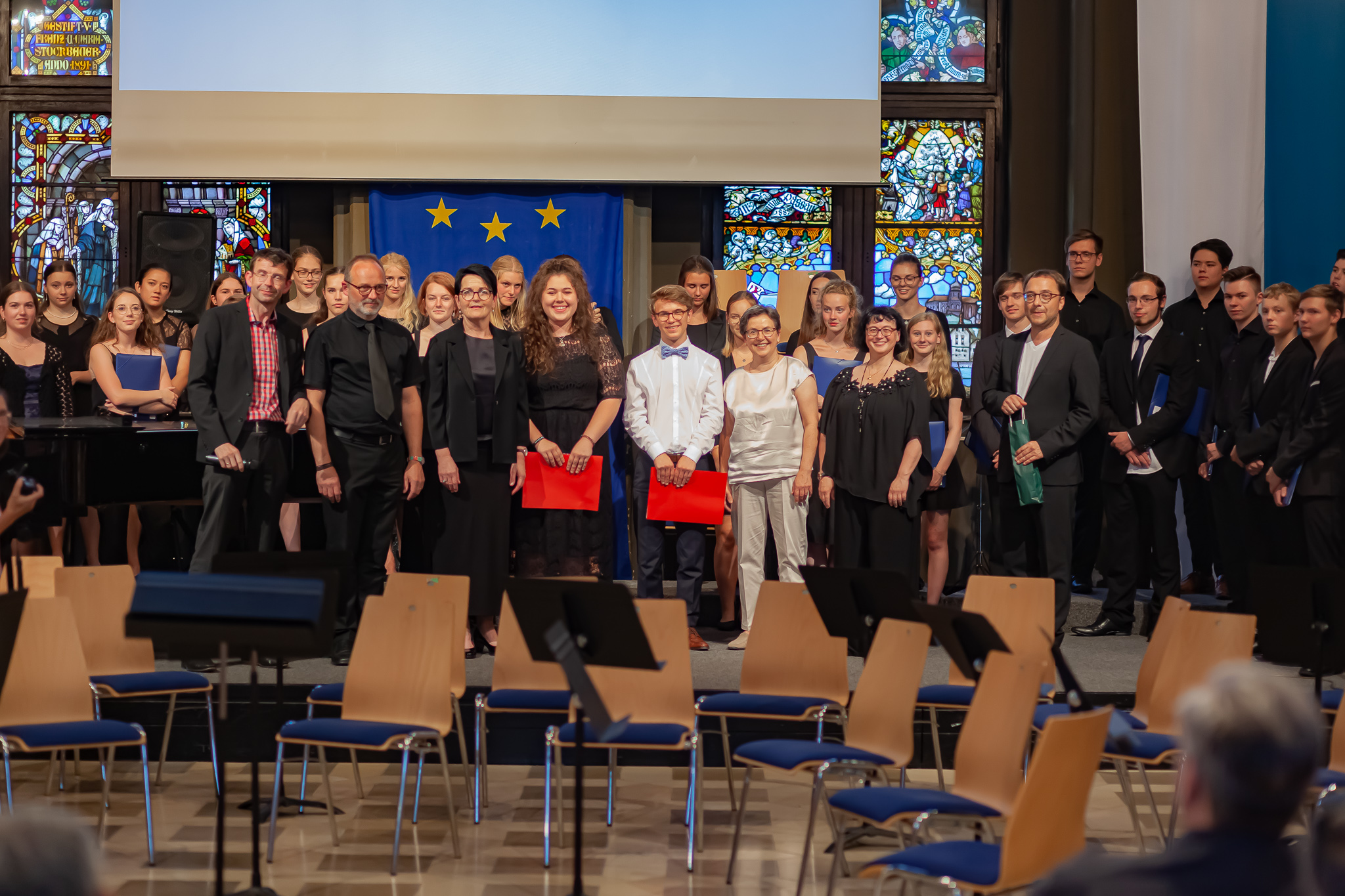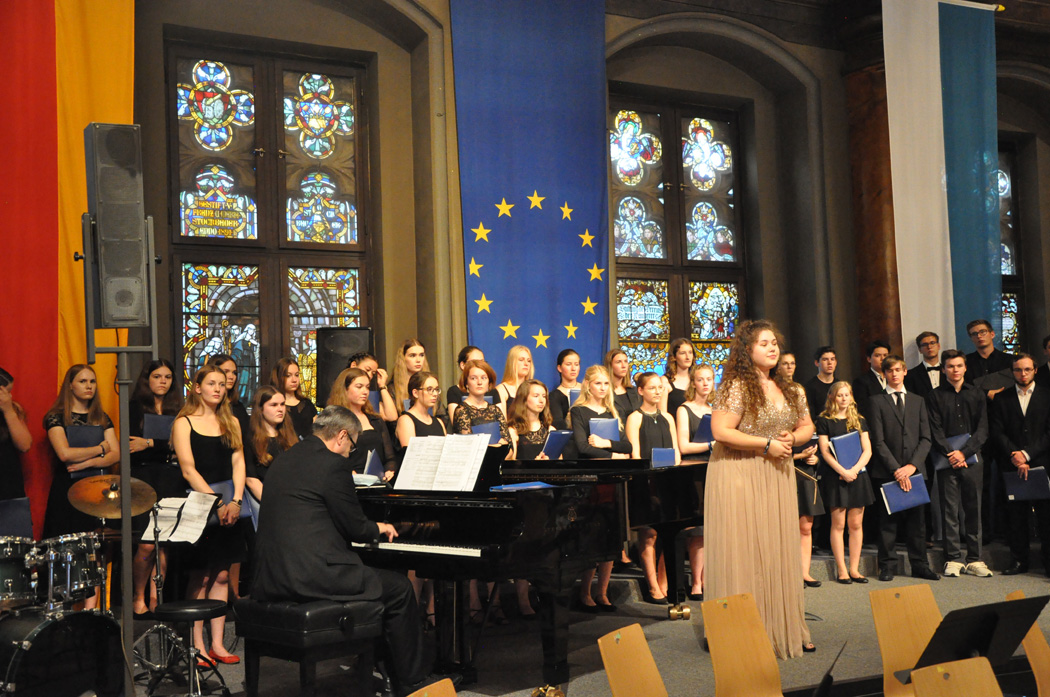 Zwei herausragende junge Interpreten nahmen eine besondere Ehrung entgegen. Schulleiter Christian Zitzl verlieh an Jennifer Schäfer und Korbinian Seibold den Musikpreis 2019 der Schule. Ein Gymnasium definiere sich über das Abitur, sagte der Schulchef bei der Preisverleihung. Ein musisches Gymnasium definiere sich aber auch über musische Leistungen. Er sei stolz darauf, Jennifer Schäfer und Korbinian Seibold mit dem Musikpreis auszuzeichnen. Dank ging auch an die Lehrer: Vor dem faszinierenden Bild des riesigen Oberstufenchors holte er Brigitte Glas, Margit Weinberger, Claudia Seibold, Elmar Slama, Christoph Rose und Kurt Brunner nach vorne und hob auch Elisabeth Thoma, Miyase Kaptan und Elisabeth Immelmann sowie den früheren Musiklehrer Matthias Seibold hervor, der die Preisträger ebenfalls unterrichtet hatte.