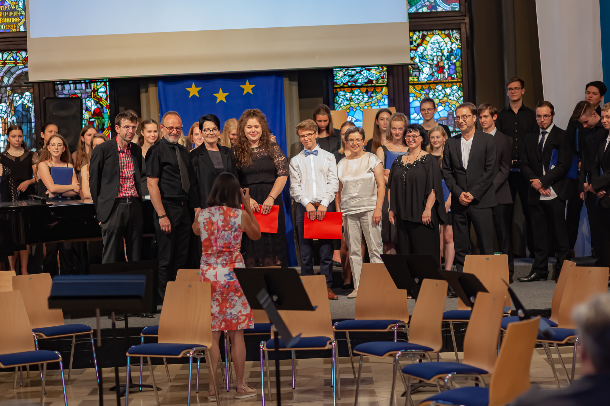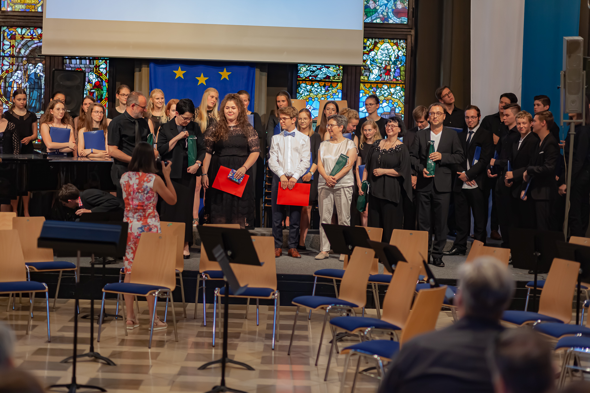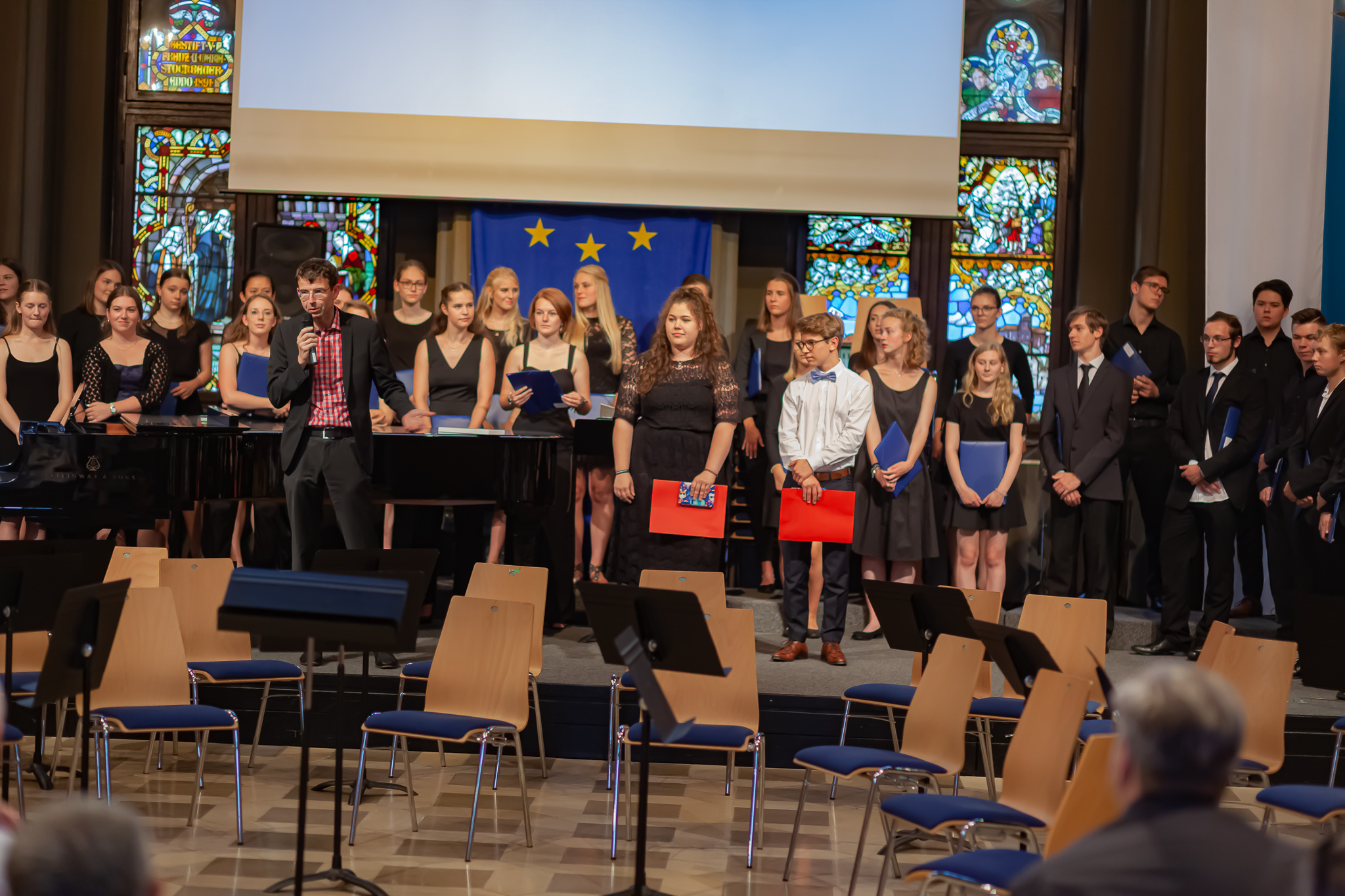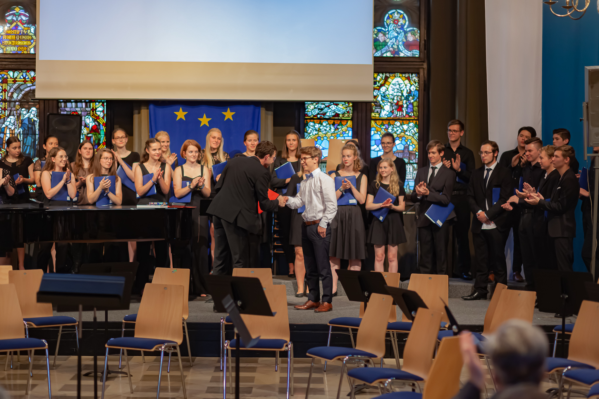 Zwei herausragende junge Interpreten nahmen eine besondere Ehrung entgegen. Schulleiter Christian Zitzl verlieh an Jennifer Schäfer und Korbinian Seibold den Musikpreis 2019 der Schule. Ein Gymnasium definiere sich über das Abitur, sagte der Schulchef bei der Preisverleihung. Ein musisches Gymnasium definiere sich aber auch über musische Leistungen. Er sei stolz darauf, Jennifer Schäfer und Korbinian Seibold mit dem Musikpreis auszuzeichnen. Dank ging auch an die Lehrer: Vor dem faszinierenden Bild des riesigen Oberstufenchors holte er Brigitte Glas, Margit Weinberger, Claudia Seibold, Elmar Slama, Christoph Rose und Kurt Brunner nach vorne und hob auch Elisabeth Thoma, Miyase Kaptan und Elisabeth Immelmann sowie den früheren Musiklehrer Matthias Seibold hervor, der die Preisträger ebenfalls unterrichtet hatte.