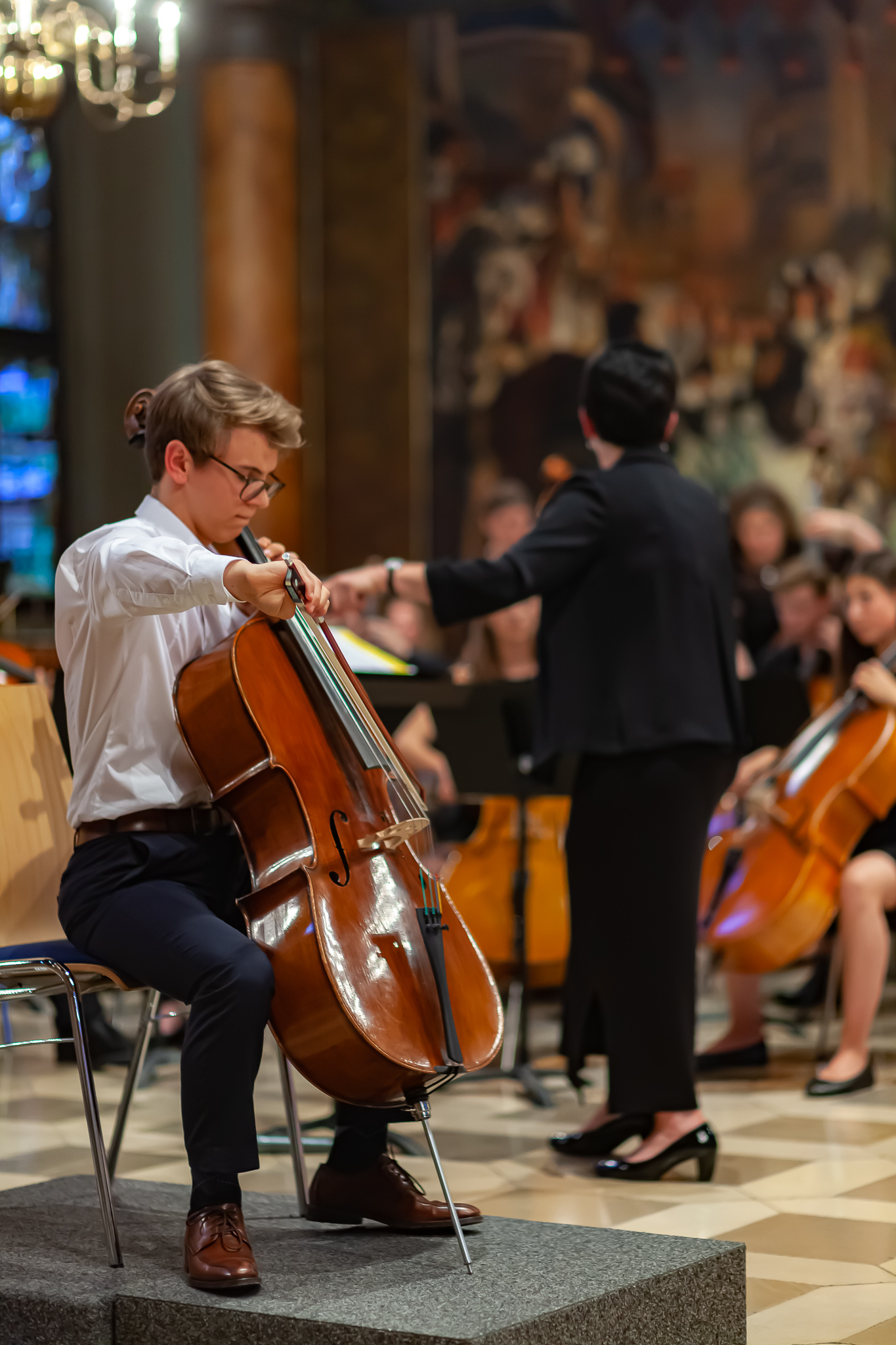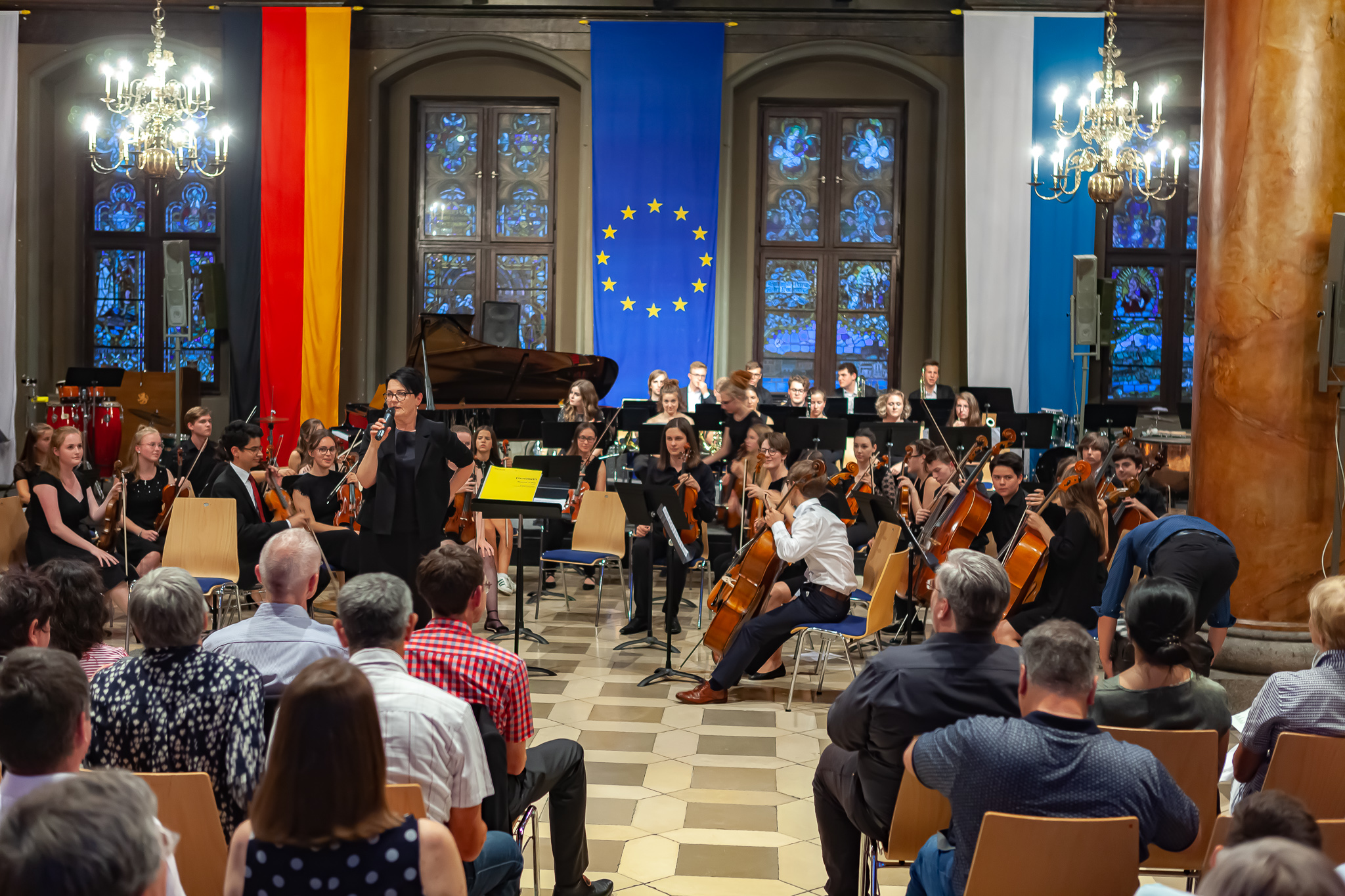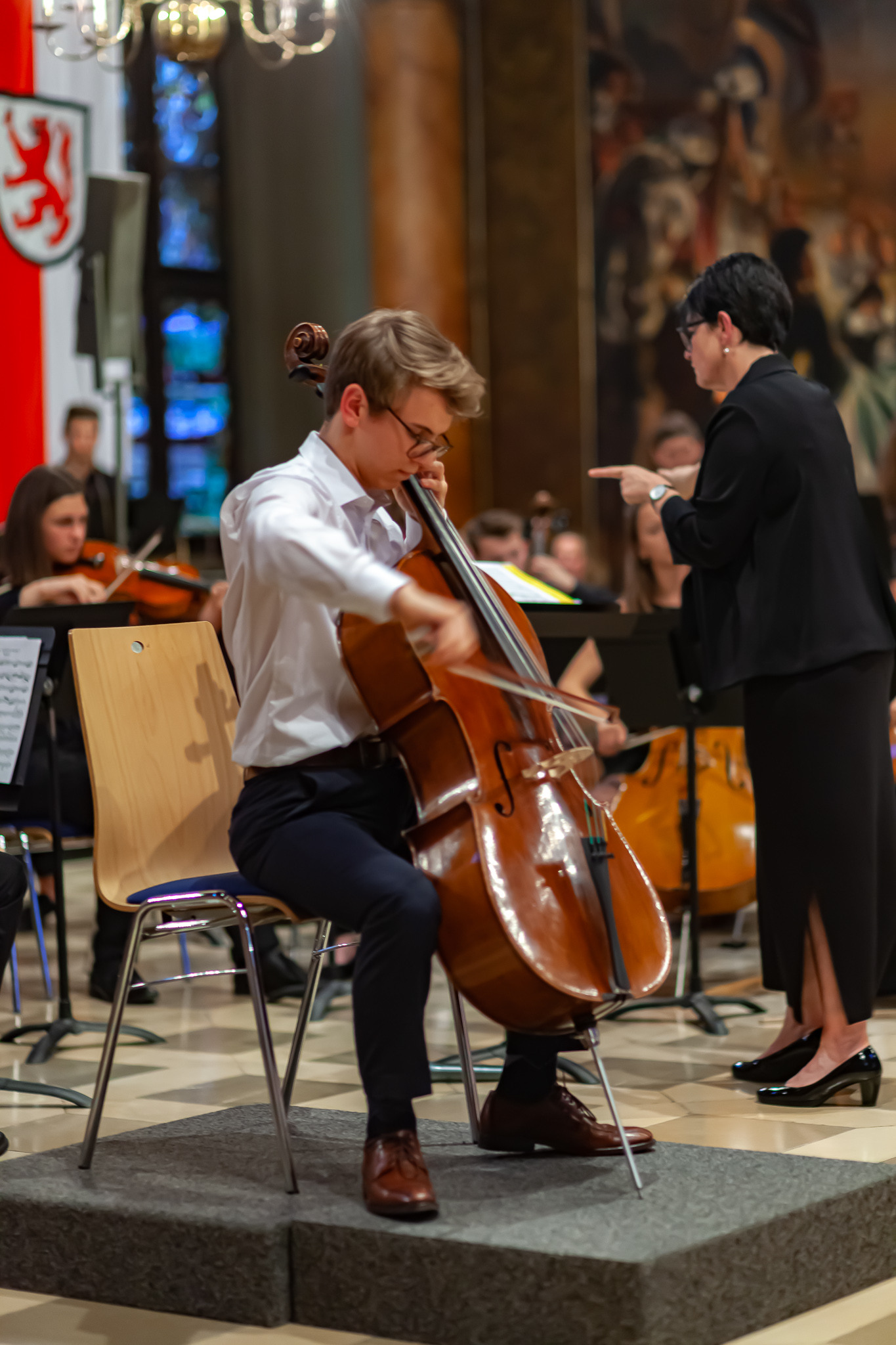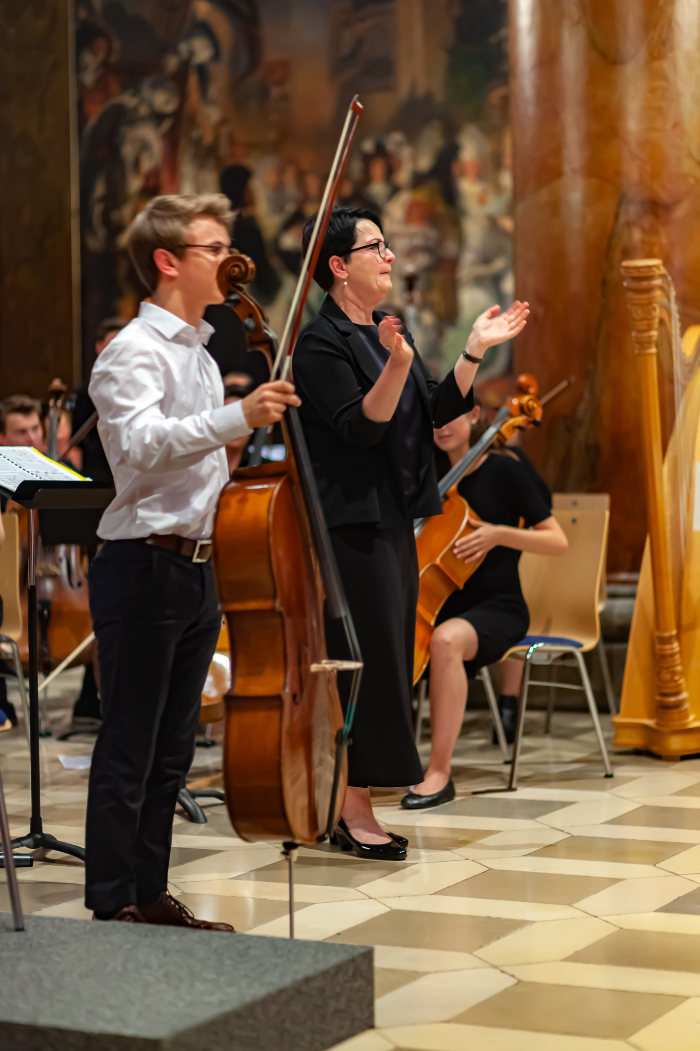 Korbinian Seibold und das klangstarke Oberstufenorchester unter der Leitung von Margit Weinberger, mit Jennifer Schäfer am Kontrabass, verzauberten die Besuchermit dem berührend vorgetragenen „Kol Nidrei op 47“ für Violoncello mit Orchester von Max Bruch. Das Stück basiere auf dem jüdischen Gebet „Kol Nidrei“, das am Vorabend des höchsten jüdischen Feiertags Jom Kippur gesprochen wird, erzählte Weinberger. Die eindringliche Melodie sei nach einer hebräischen Hymne komponiert worden. Die Zuhörer zeigten sich begeistert und spendeten stehende Ovationen. Auch Margit Weinberger war sichtlich ergriffen. Es sei ein großes Glücksgefühl, mit Schülern dies aufführen zu können. Mit virtuosem Solospiel faszinierte auch Simon Seidl am Klavier, der mit dem energiegeladenen Orchester die „Rhapsody in Blue“ von George Gershwin präsentierte. Für die erneut hohe Kunst gab es ebenfalls standing ovations.