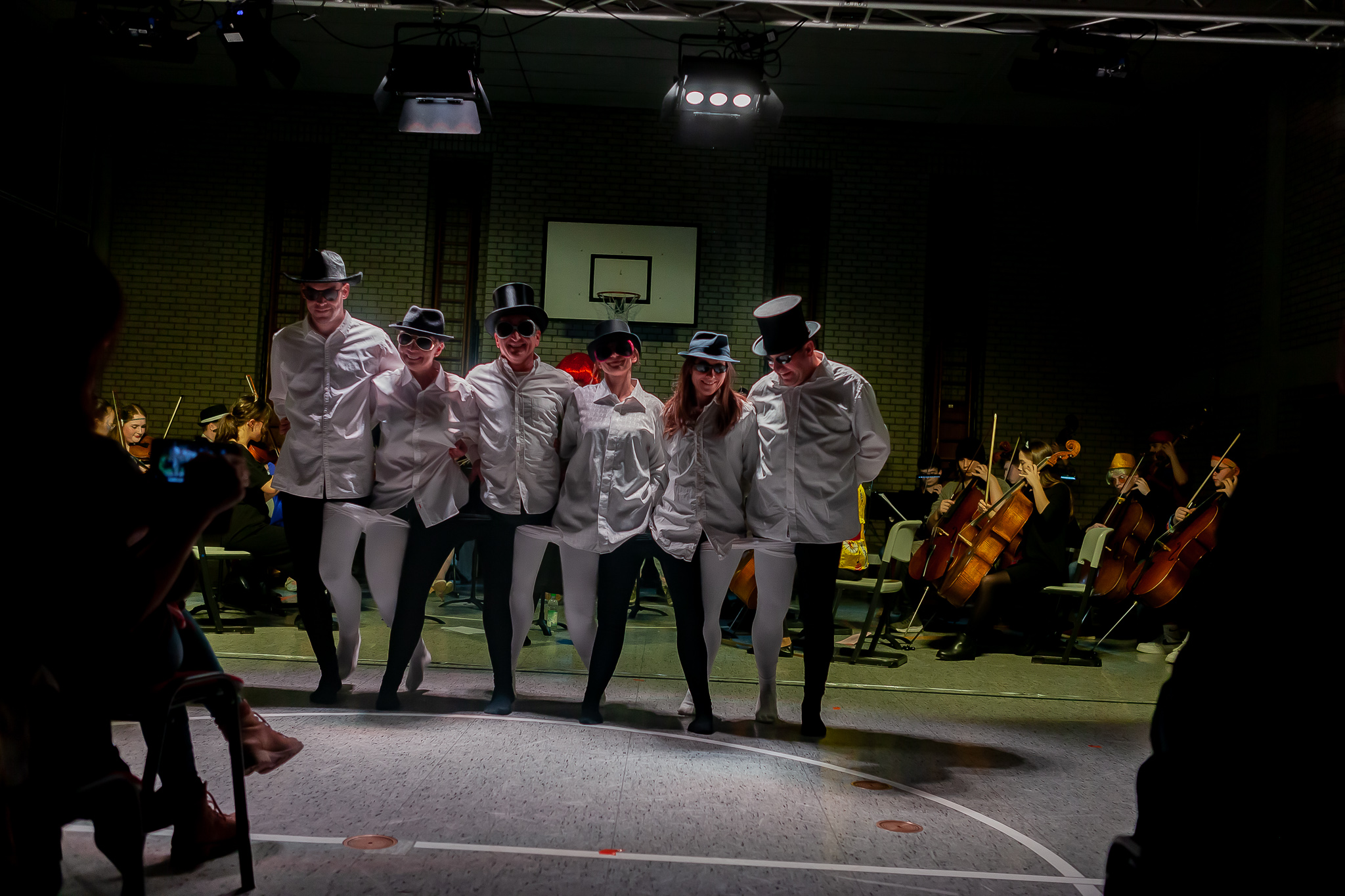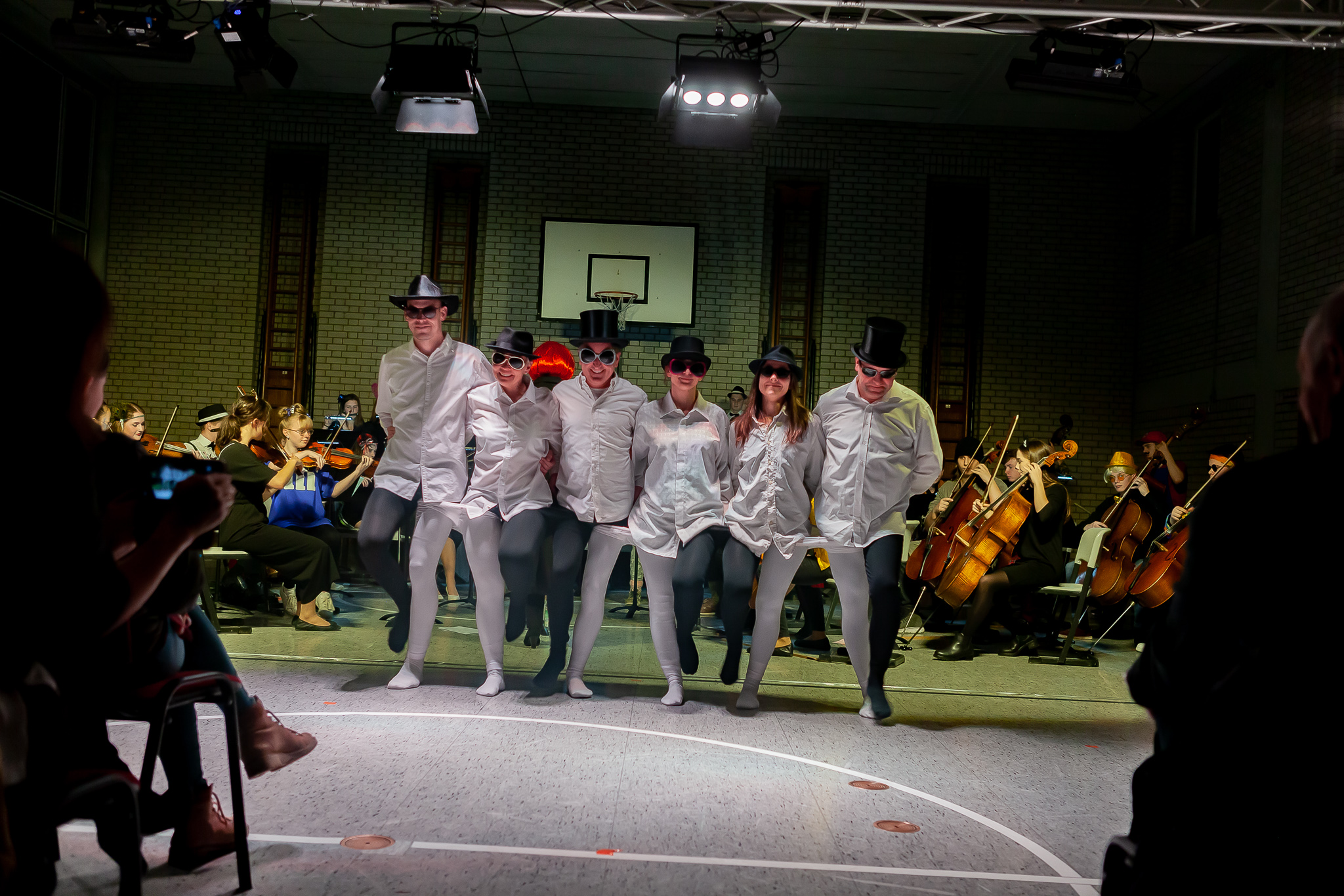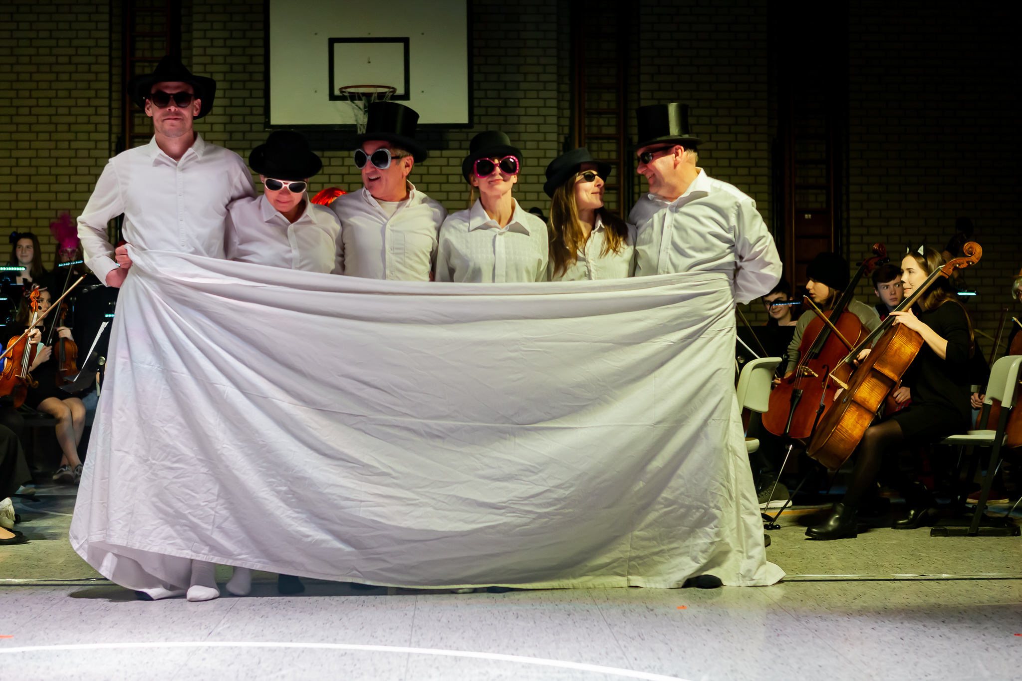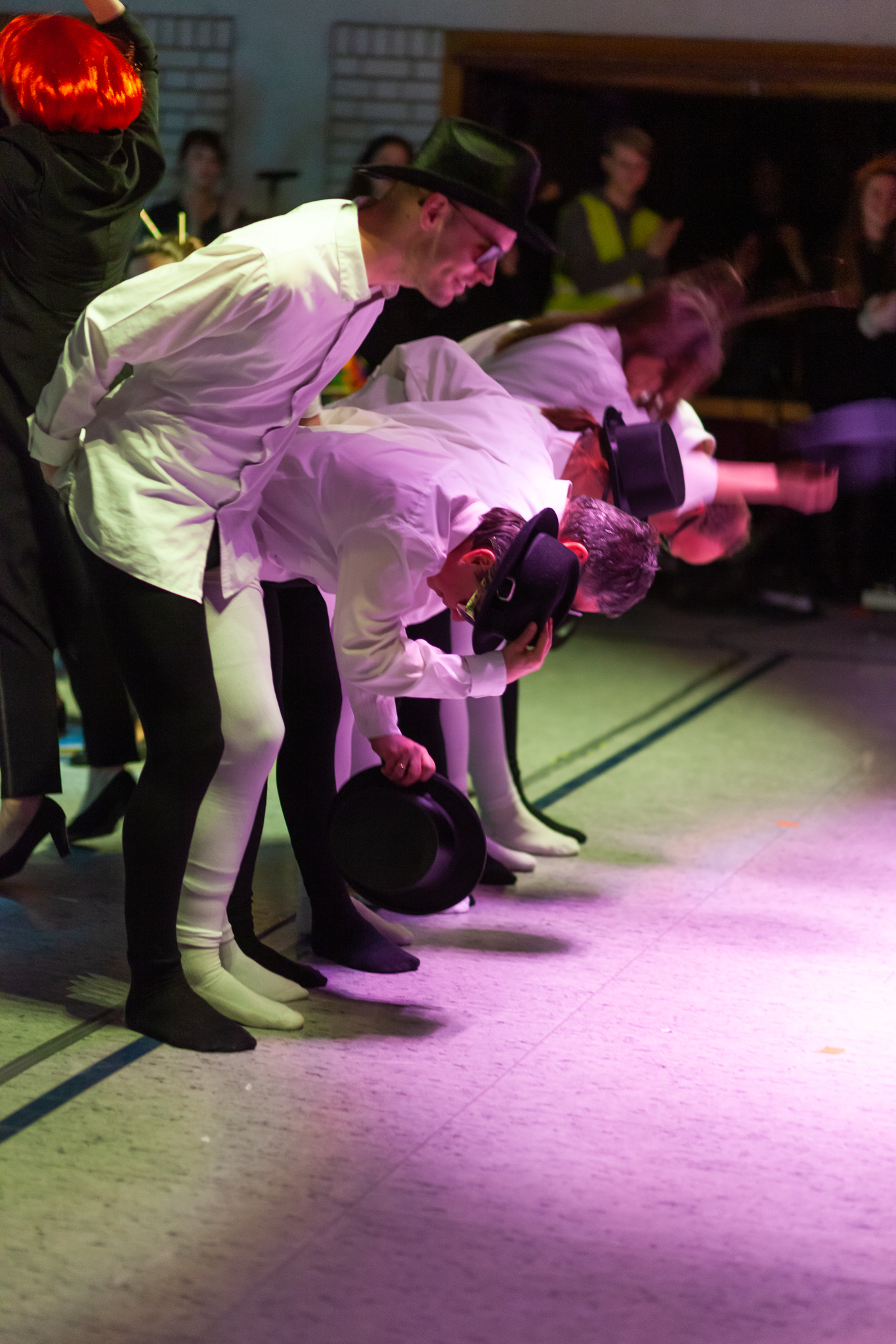 Margit Weinberger war es außerdem gelungen, mehrere Solisten und Gruppen für kabarettistische Auftritte und Tanzeinlagen zu gewinnen. Angeleitet von Sportlehrerin Jacqueline Tietze, zeigten ihre Tanzkunst nicht nur die acht Mädchen der „Dance Company Q12“, sondern auch ein schwarz-weiß bestrumpftes Lehrerensemble, das die Zuschauer durch skurrile Beinschwünge verwirrte. Wortwitz vom Feinsten gab es aus Schüler- und Lehrermund. Ursel Krafts Theatergruppe der Oberstufe (s. Foto oben li.) sah das Zusammenleben von Schülern und Lehrern in der Schule wie in einem Zoo. „Fantasus Horribillicribifax“ alias Bernhard Haberl nahm gar manche seiner Kollegen als Freudenhainer Zwerge und weiteres Fußvolk auf die Schippe. Und die Freudenhainer Eule alias Sepp Duschl erzählte amüsante Geschichtchen, in die er im Stile Willy Astors tatsächlich alle Orchestermitglieder und Lehrer namentlich verwebte.
