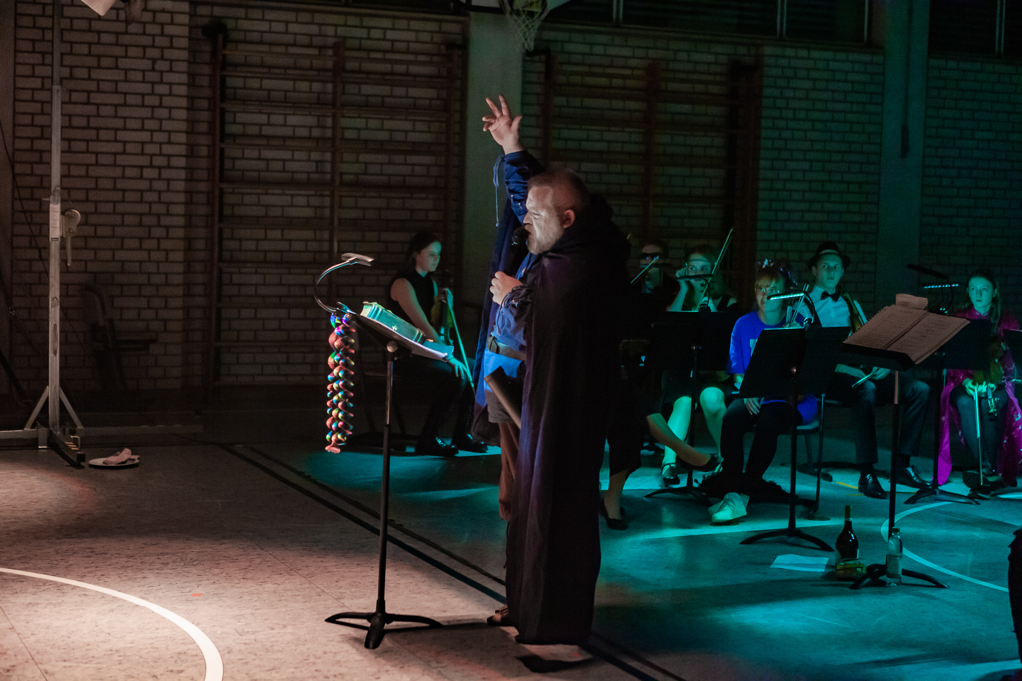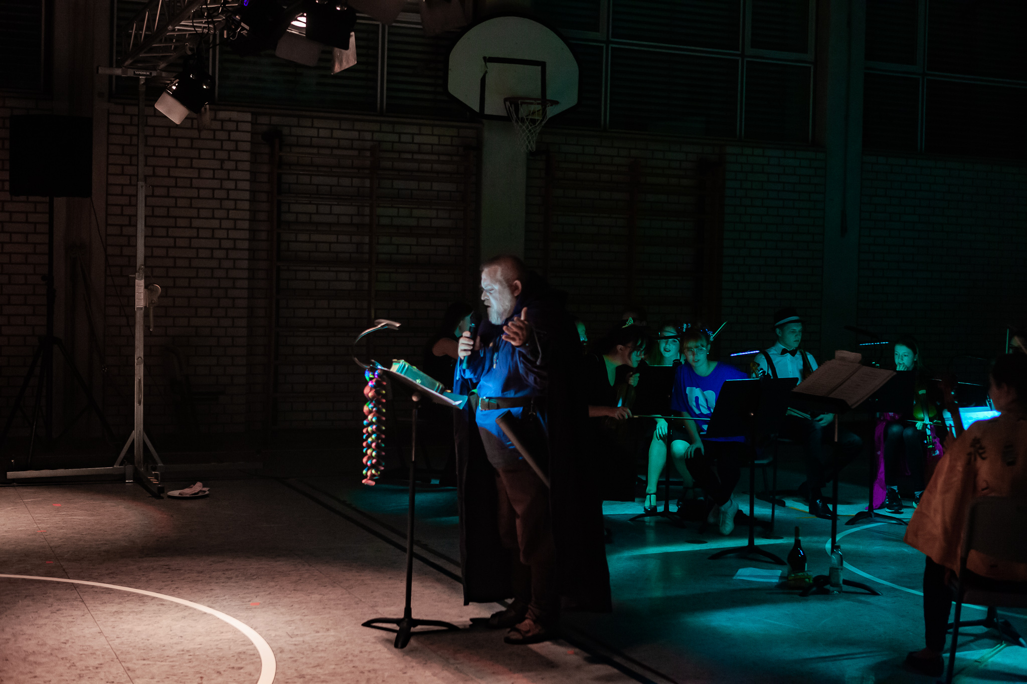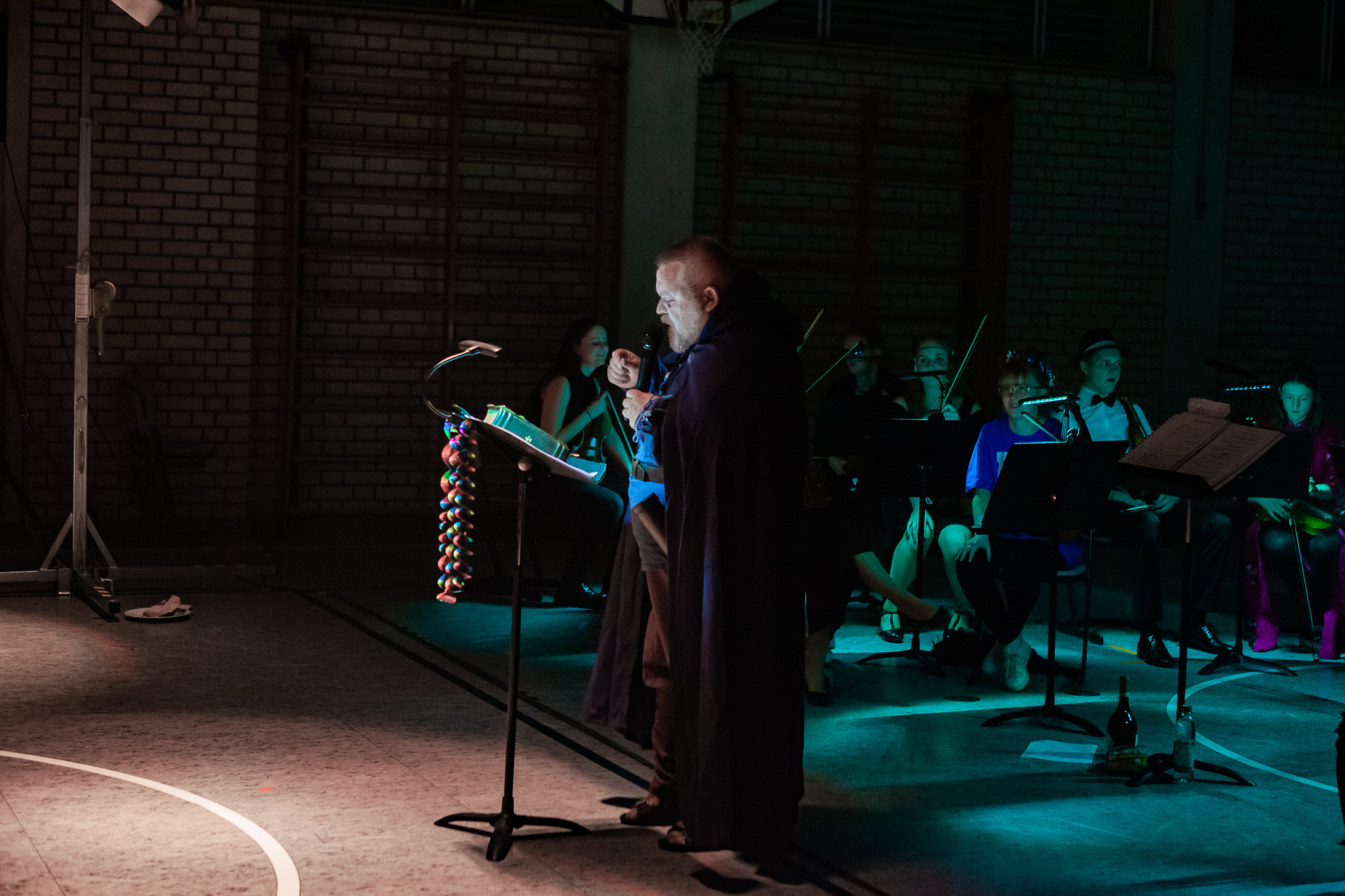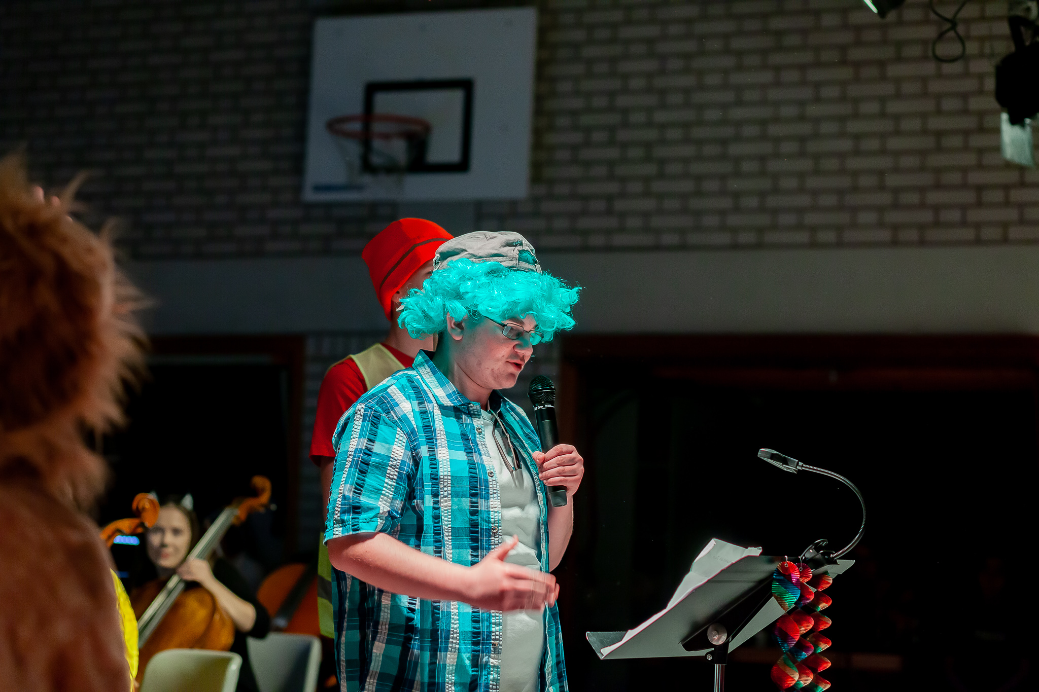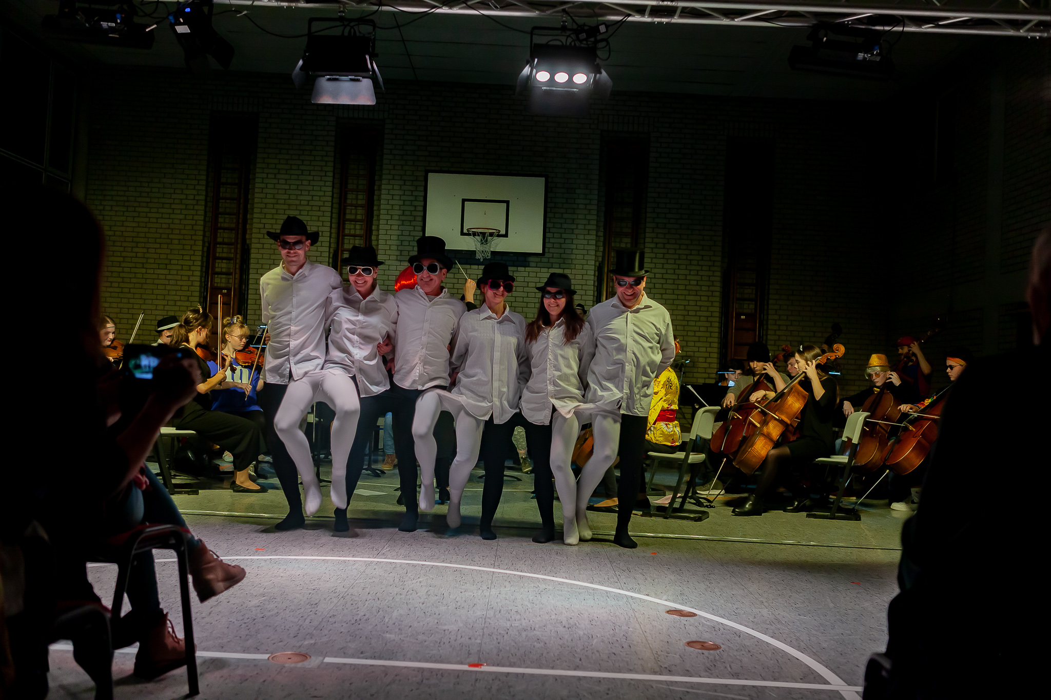 Margit Weinberger war es außerdem gelungen, mehrere Solisten und Gruppen für kabarettistische Auftritte und Tanzeinlagen zu gewinnen. Angeleitet von Sportlehrerin Jacqueline Tietze, zeigten ihre Tanzkunst nicht nur die acht Mädchen der „Dance Company Q12“, sondern auch ein schwarz-weiß bestrumpftes Lehrerensemble, das die Zuschauer durch skurrile Beinschwünge verwirrte. Wortwitz vom Feinsten gab es aus Schüler- und Lehrermund. Ursel Krafts Theatergruppe der Oberstufe (s. Foto oben li.) sah das Zusammenleben von Schülern und Lehrern in der Schule wie in einem Zoo. „Fantasus Horribillicribifax“ alias Bernhard Haberl nahm gar manche seiner Kollegen als Freudenhainer Zwerge und weiteres Fußvolk auf die Schippe. Und die Freudenhainer Eule alias Sepp Duschl erzählte amüsante Geschichtchen, in die er im Stile Willy Astors tatsächlich alle Orchestermitglieder und Lehrer namentlich verwebte.