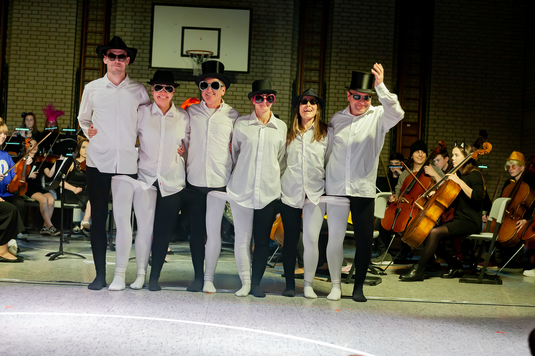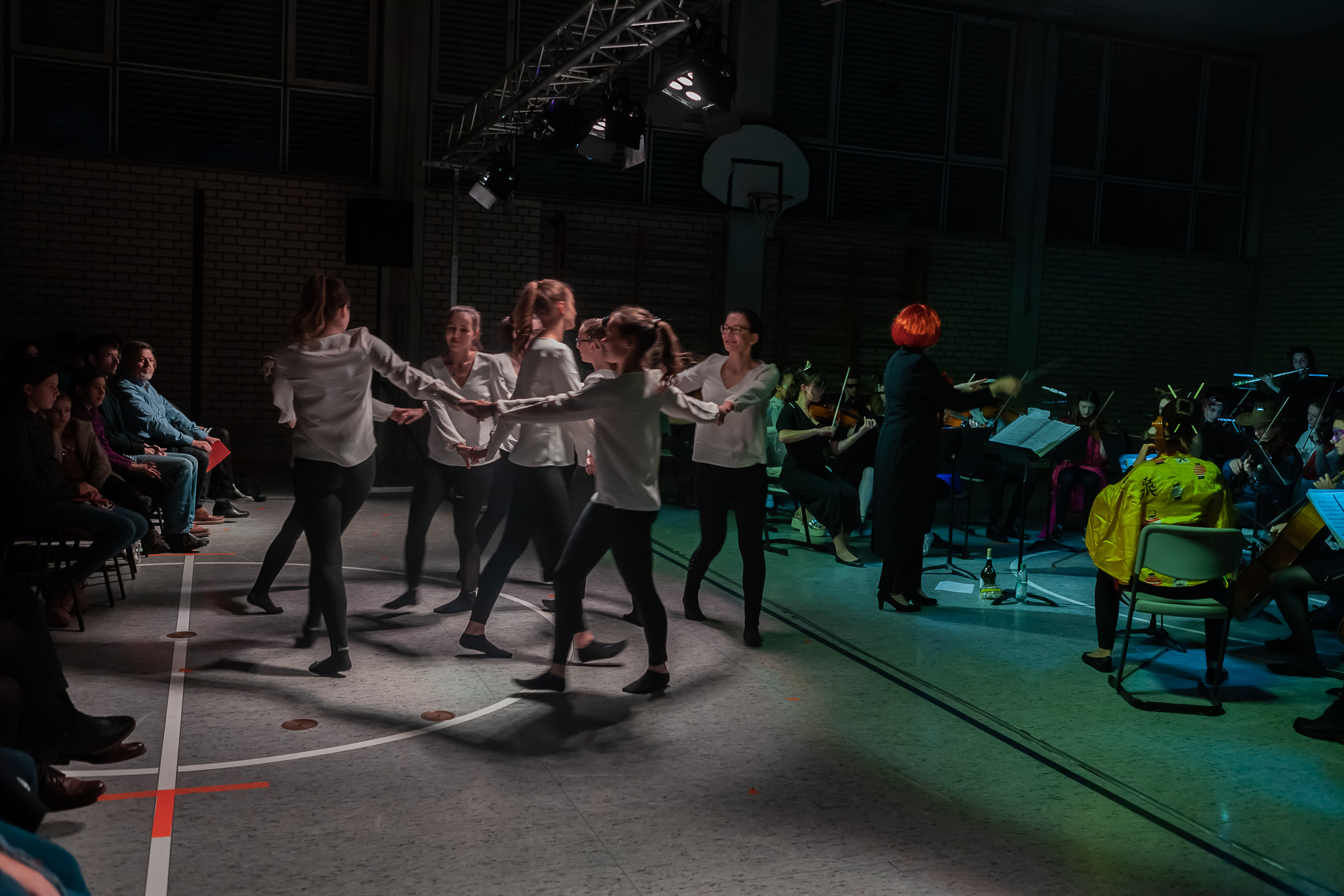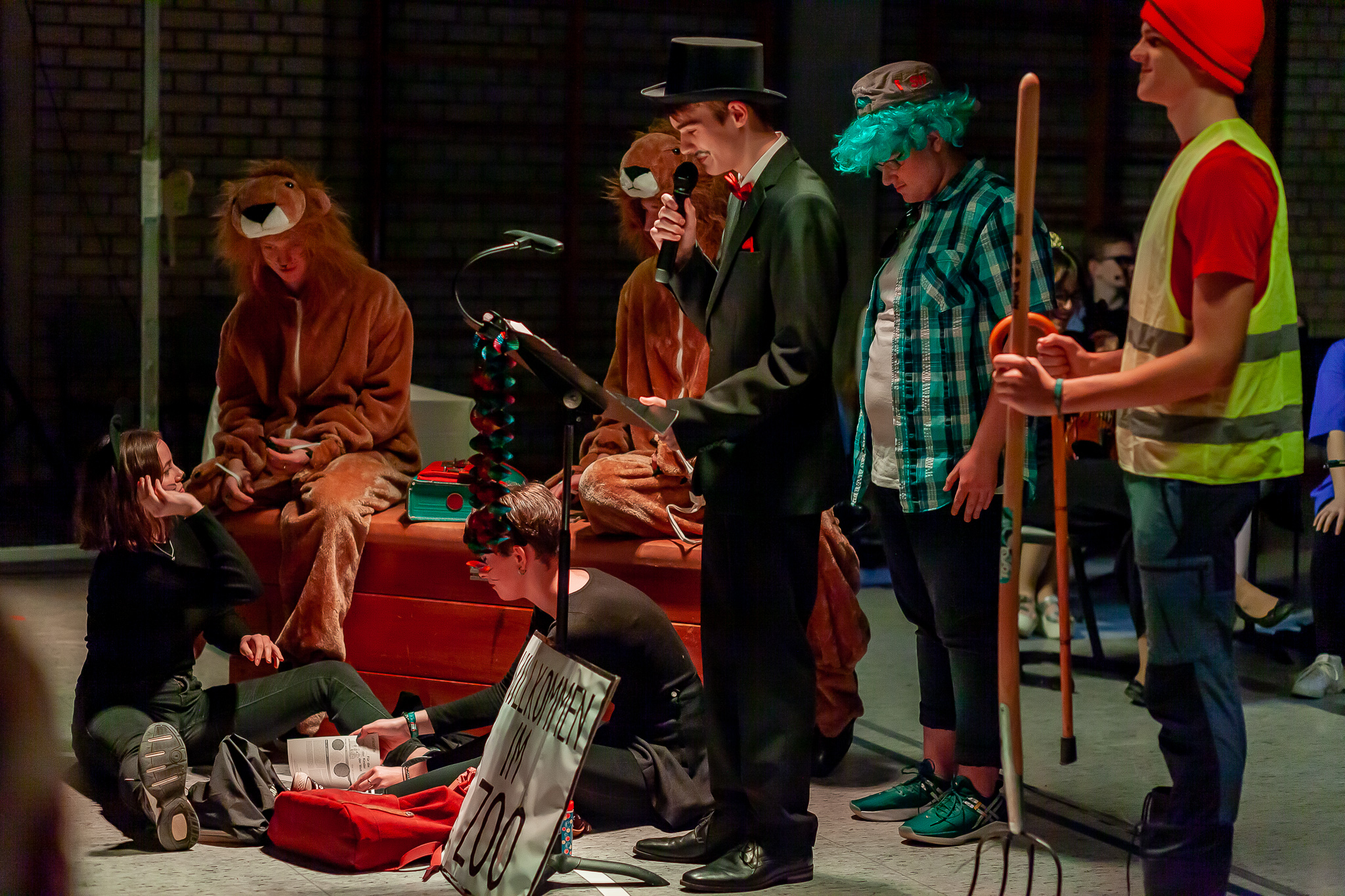 Margit Weinberger war es außerdem gelungen, mehrere Solisten und Gruppen für kabarettistische Auftritte und Tanzeinlagen zu gewinnen. Angeleitet von Sportlehrerin Jacqueline Tietze, zeigten ihre Tanzkunst nicht nur die acht Mädchen der „Dance Company Q12“, sondern auch ein schwarz-weiß bestrumpftes Lehrerensemble, das die Zuschauer durch skurrile Beinschwünge verwirrte. Wortwitz vom Feinsten gab es aus Schüler- und Lehrermund. Ursel Krafts Theatergruppe der Oberstufe (s. Foto oben li.) sah das Zusammenleben von Schülern und Lehrern in der Schule wie in einem Zoo. „Fantasus Horribillicribifax“ alias Bernhard Haberl nahm gar manche seiner Kollegen als Freudenhainer Zwerge und weiteres Fußvolk auf die Schippe. Und die Freudenhainer Eule alias Sepp Duschl erzählte amüsante Geschichtchen, in die er im Stile Willy Astors tatsächlich alle Orchestermitglieder und Lehrer namentlich verwebte.