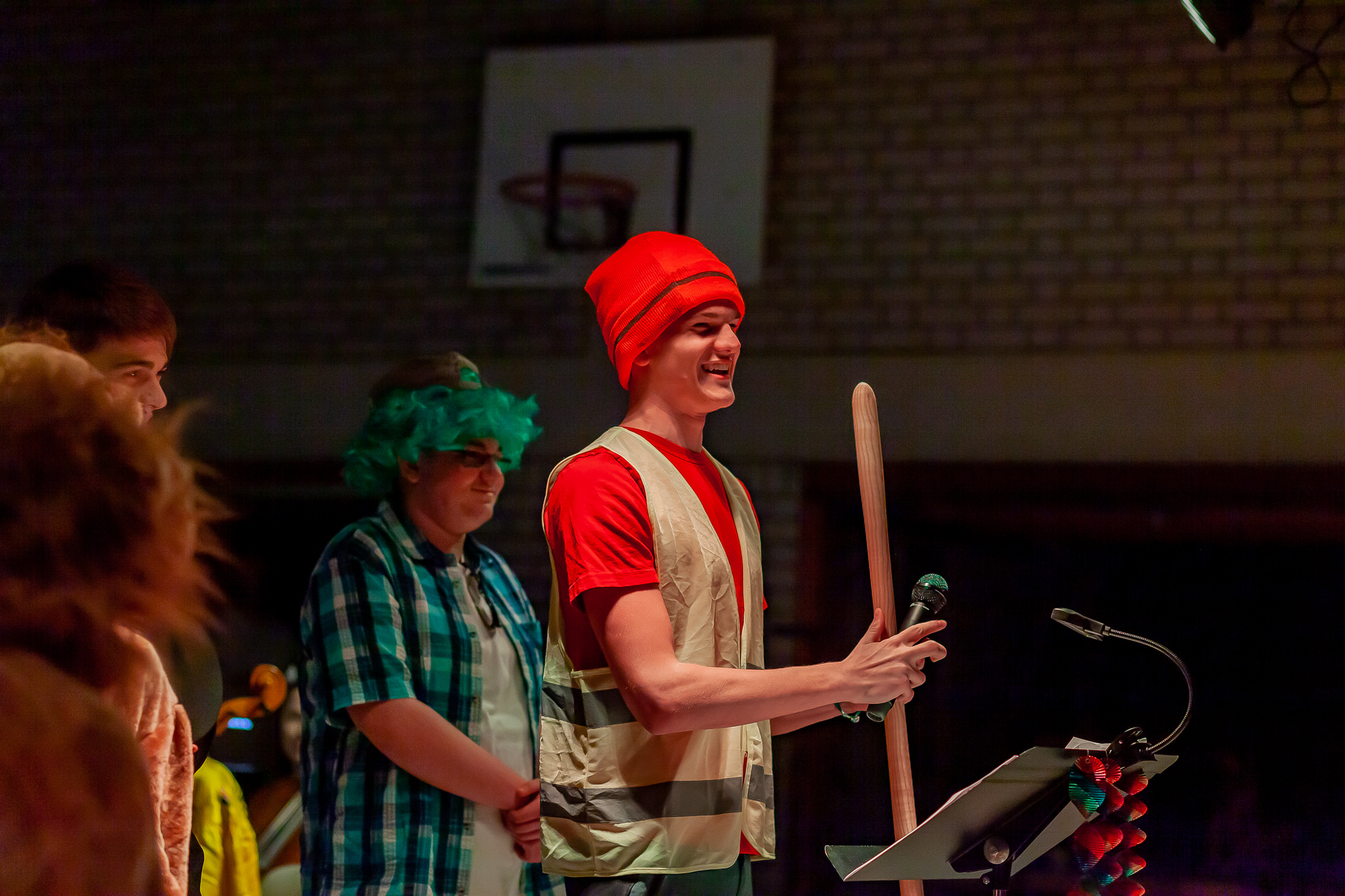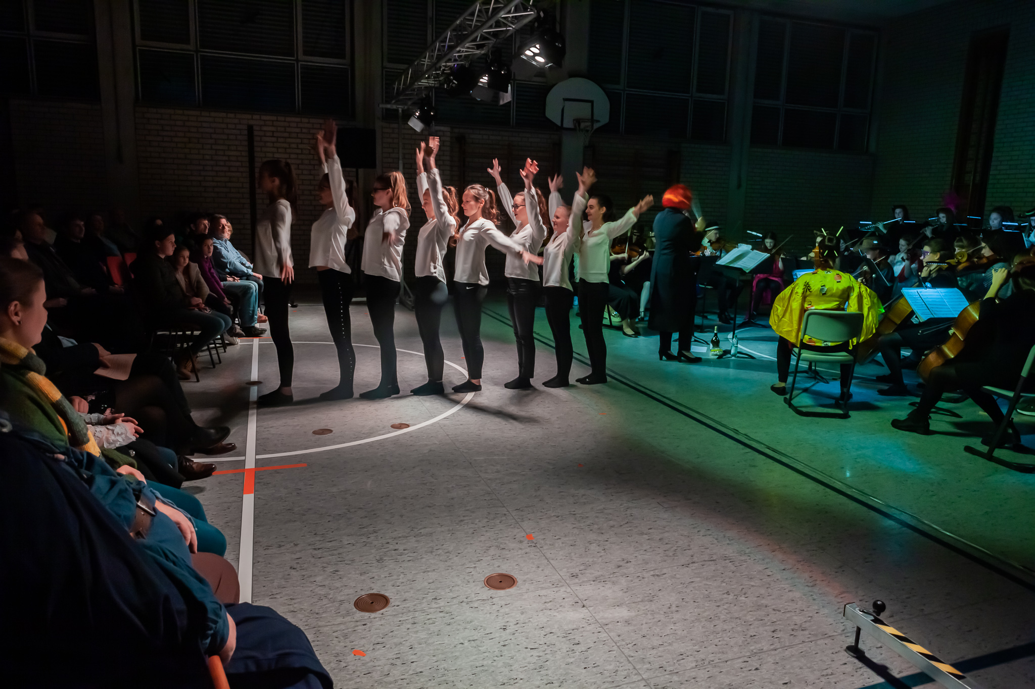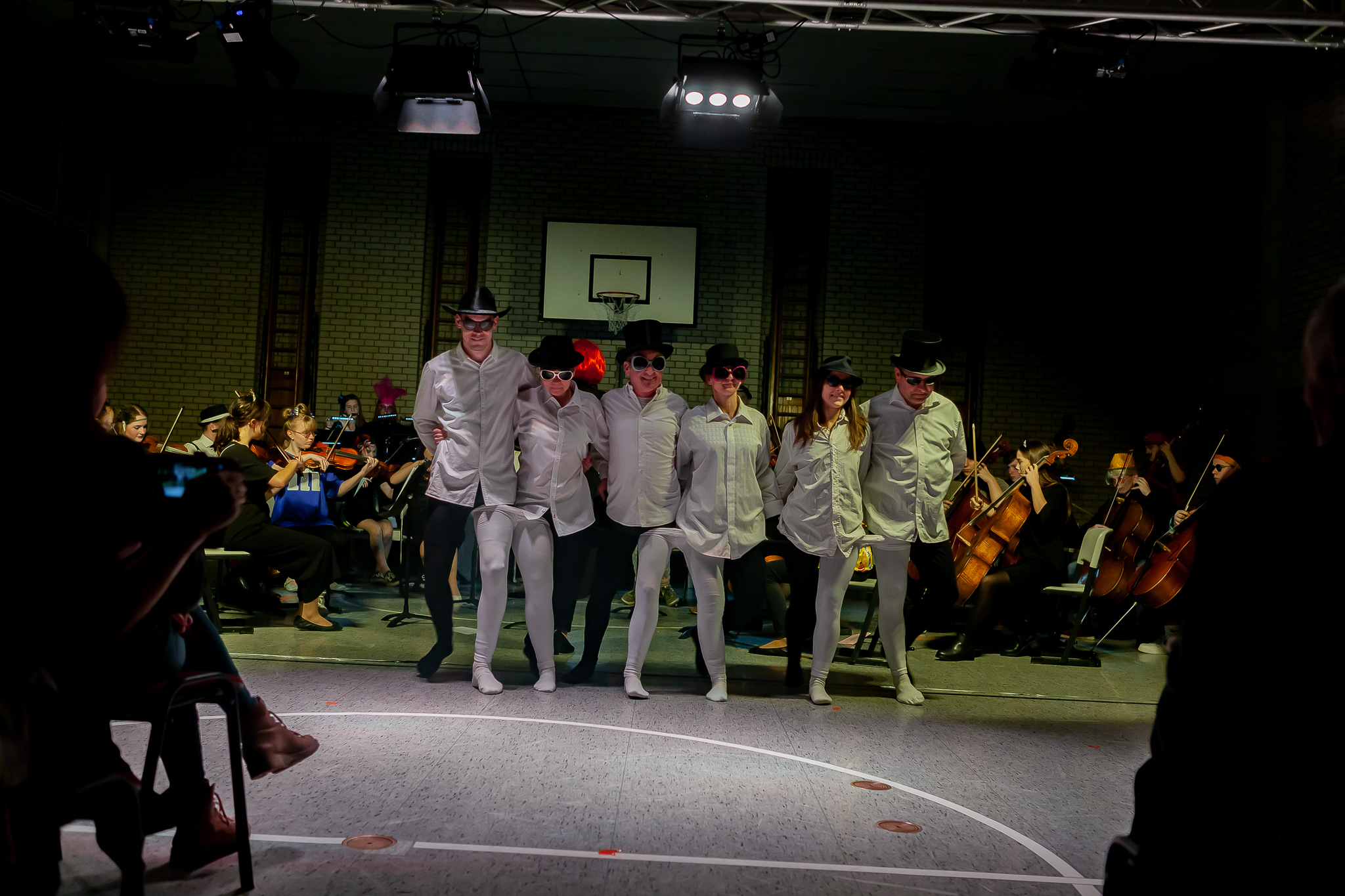 Margit Weinberger war es außerdem gelungen, mehrere Solisten und Gruppen für kabarettistische Auftritte und Tanzeinlagen zu gewinnen. Angeleitet von Sportlehrerin Jacqueline Tietze, zeigten ihre Tanzkunst nicht nur die acht Mädchen der „Dance Company Q12“, sondern auch ein schwarz-weiß bestrumpftes Lehrerensemble, das die Zuschauer durch skurrile Beinschwünge verwirrte. Wortwitz vom Feinsten gab es aus Schüler- und Lehrermund. Ursel Krafts Theatergruppe der Oberstufe (s. Foto oben li.) sah das Zusammenleben von Schülern und Lehrern in der Schule wie in einem Zoo. „Fantasus Horribillicribifax“ alias Bernhard Haberl nahm gar manche seiner Kollegen als Freudenhainer Zwerge und weiteres Fußvolk auf die Schippe. Und die Freudenhainer Eule alias Sepp Duschl erzählte amüsante Geschichtchen, in die er im Stile Willy Astors tatsächlich alle Orchestermitglieder und Lehrer namentlich verwebte.