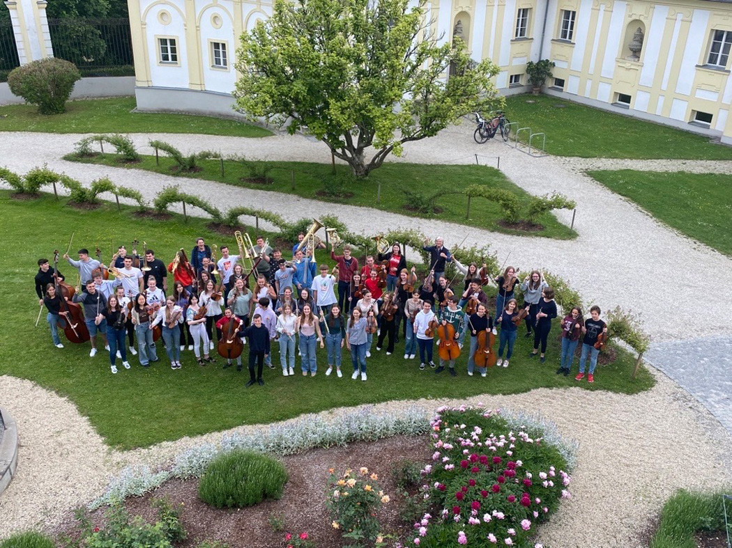 EW 22 A2 Schülerorchester HPEs entstand ein imposanter Klangkörper mit 70 Musiker*innen. Die besten Voraussetzungen als Probenlocation bot natürlich das musische Auersperg-Gymnasium, wo auch in bestimmten Abständen mit Orchesterleiterin und Projektkoordinatorin Margit Weinberger fleißig geprobt und voreinstudiert wurde. Die musikalische Gesamtleitung oblag einem Profi, dem Konzertmeister der Bamberger Symphoniker, einem der renommiertesten A - Orchester in Deutschland, Harald Strauss – Orlovsky. Mit seiner norddeutschen ruhigen Art führte er die Schüler durch die anstrengenden, aber sehr erfolgreichen Proben.