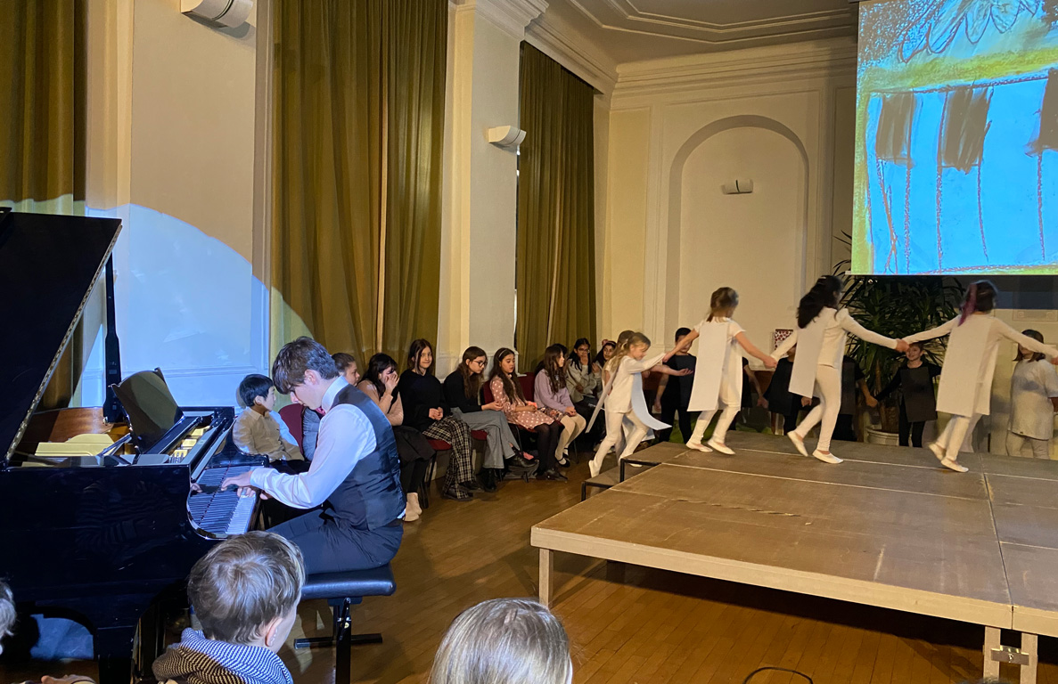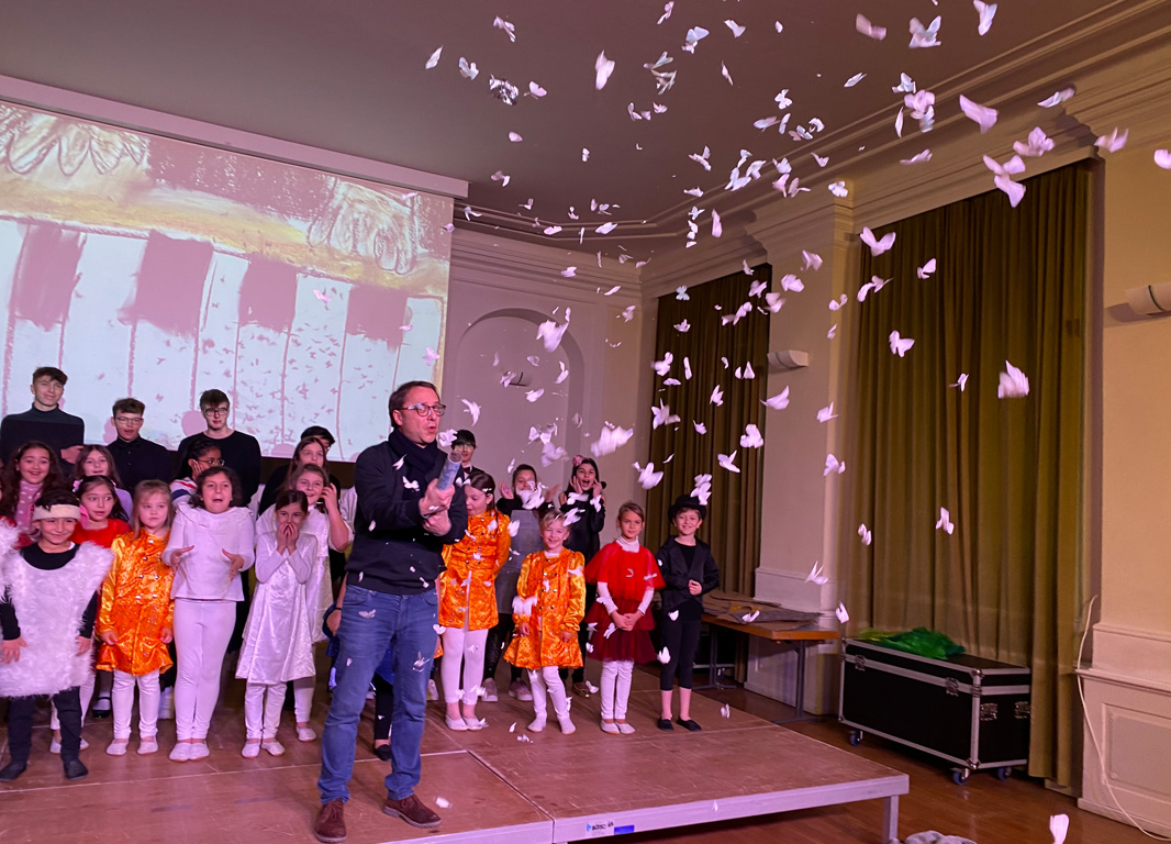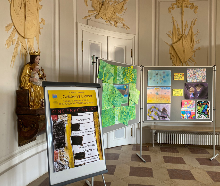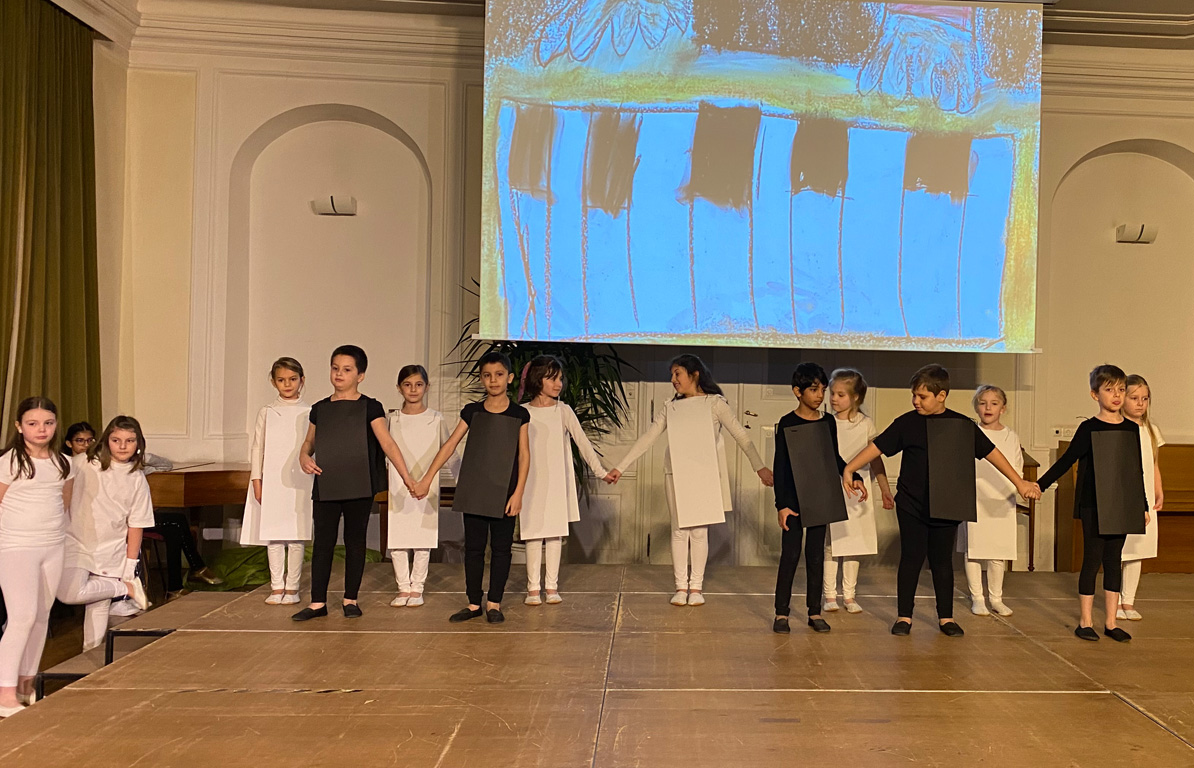 Auf einem fein gestalteten Plakat war das Ereignis in den Wochen zuvor an vielen Orten der Stadt angekündigt: Hände gemalt auf einer Klavier-Tastatur hatte dazu die junge Schülerin, Katalena Molitor. Deren Plakat-Entwurf war nicht nur prominent ausgewählt worden, sie erhielt heute sogar einen Preis dafür. Und Elmar Slama meinte, dass „wir mal eine Ausstellung veranstalten müssten, allein mit den schönen, ansprechenden Plakaten“, welche die Schüler und Schülerinnen im Laufe der Zeit gestaltet haben, kleine Kunstwerke, die „schon so viele Besucher motivierten, in unsere Konzerte zu kommen“. Auch heute präsentierte er sich wieder sehr gut besetzt, der schöne Festsaal von Freudenhain, diesmal zu einer Aufführung des „Children’s corner“, jenes 6teiligen Zyklus Claude Debussys. Und eine größere Anzahl kleinerer Kinder kauerte ganz vorn zu Füßen der Bühne, die man heute eigens aufgebaut hatte. Dort oben tanzten und bewegten sich grazil, liebenswert und poetisch kostümiert mit Schleiern und Kopfschmuck, in allerlei Farben vor dem Hintergrund der von Schülern gestalteten Gemälde: die Mädchen und Jungen der ersten bis vierten Ganztagsklassen aus der Kunst-Grundschule Haidenhof. Mit einer Menge Empathie und Freude hatten deren Lehrerinnen und Lehrer wohl wiederum Empathie und Freude in den Kindern zu wecken verstanden. Der herzliche Applaus des Publikums, der jungen wie älteren Menschen belohnte all das. Und der Beifall galt ebenso den bereits „großen“ Klavierschülerinnen und -schülern Elmar Slamas, zu deren Debussys- Kompositionen die noch sehr jungen Haidenhof-Kinder tanzten. Mit viel Agogik zelebrierten die Pianistinnen und Pianisten, 14, 15 Jahre alt, Debussys berühmten 6teiligen Zyklus. Aber nicht nur den allein brachte man zur Aufführung. Denn gerahmt gab‘s „Children’s Corner“, garniert mit der Aufführung zweier weiterer berühmter Debussy-Kompositionen, nämlich „Claire de Lune“ als Preludium, und als Epilog jenes berühmte „La Cathedrale engloutie“- der in Musik übersetzte Untergang einer verdorbenen Gesellschaft und deren Cathedrale im Meer. Die Kinder agierten so heiter wie ernst. Schwere und Leichtigkeit verschmolz im Zusammenspiel von Tanz, Musik und Bildender Kunst. Das Publikum honorierte alles zusammen immer wieder mit heftigem Applaus für die Kinder auf der Bühne, die Jugendlichen am Klavier….