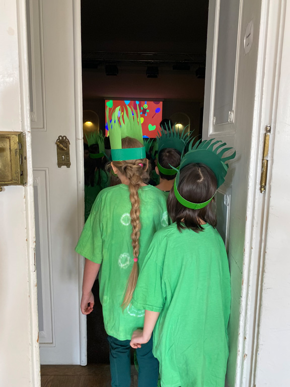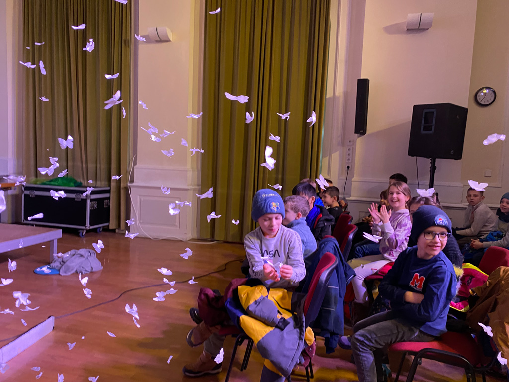 Die Kooperation zwischen Elmar Slamas Klavierklasse und der Kunst-Grundschule Haídenhof hat Tradition. Am Freitag, den 10.02. gab es gleich drei Aufführungen von Claude Debussys Klavierzyklus "Childrens's Corner". Vormittags wurden zu zwei unterschiedlichen Terminen mehrere Grundschulklassen der umliegenden Sprengel eingeladen, die Nachmittagsvorstellung war für jedermann geöffnet, auch für die Eltern der jungen Künstler. Die Freudenhainer Pianisten spielten die Stücke am Flügel, die Haidenhofer Grundschüler interpretierten sie tänzerisch auf der Bühne. Eine ausgeklügelte Choreographie, aufwändige Kostüme, wechselnde projizierte Hintergründe und bunte Lichteffekte brachten das Publikum zum Staunen.