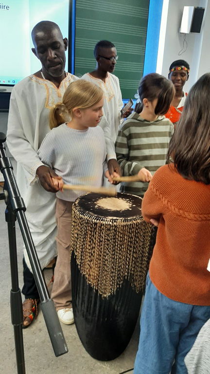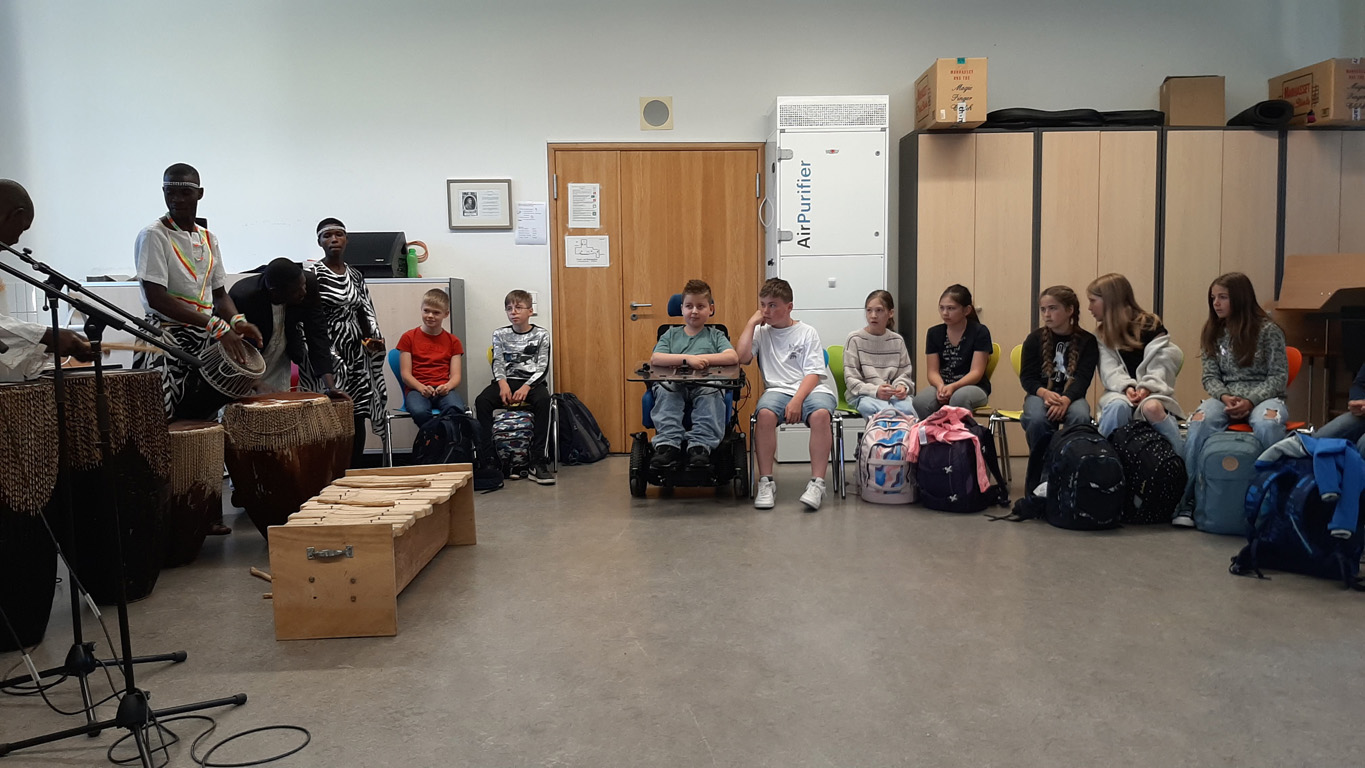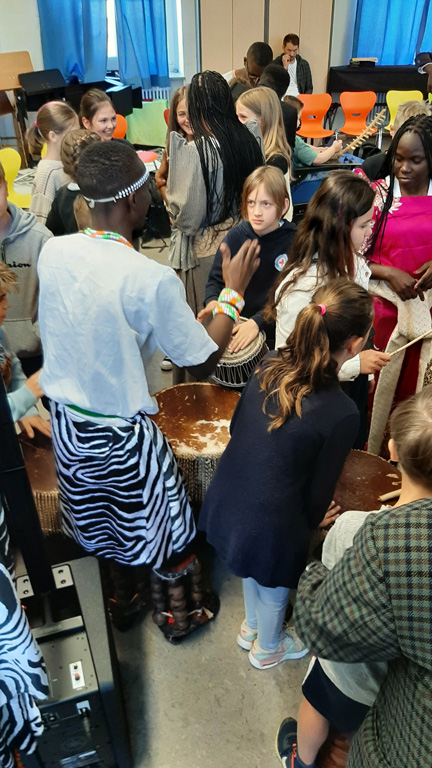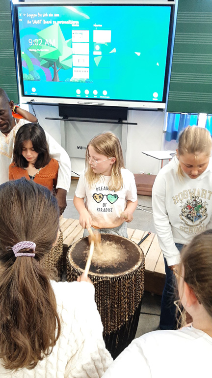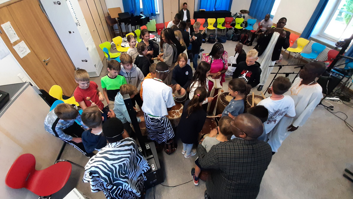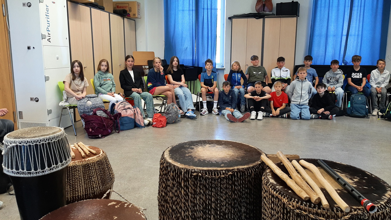 Im regulären Musikunterricht standen am heutigen Montag weder Mozart noch die Beatles, Kein Jazz oder Durtonleitern auf dem Programm, sondern Singen und Trommeln auf „Ugandisch“.