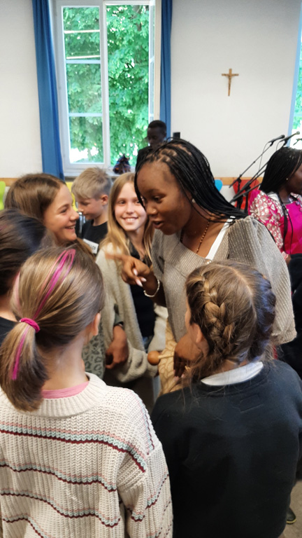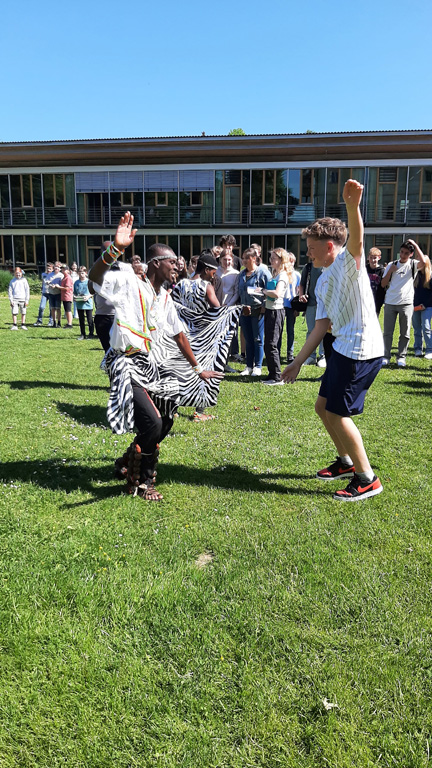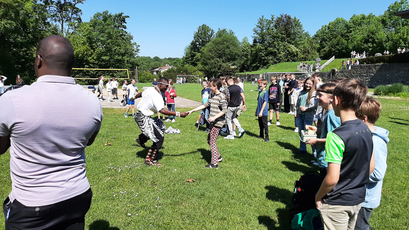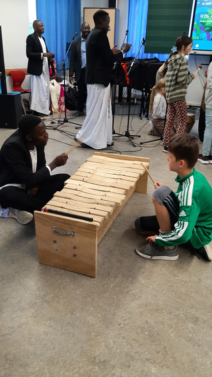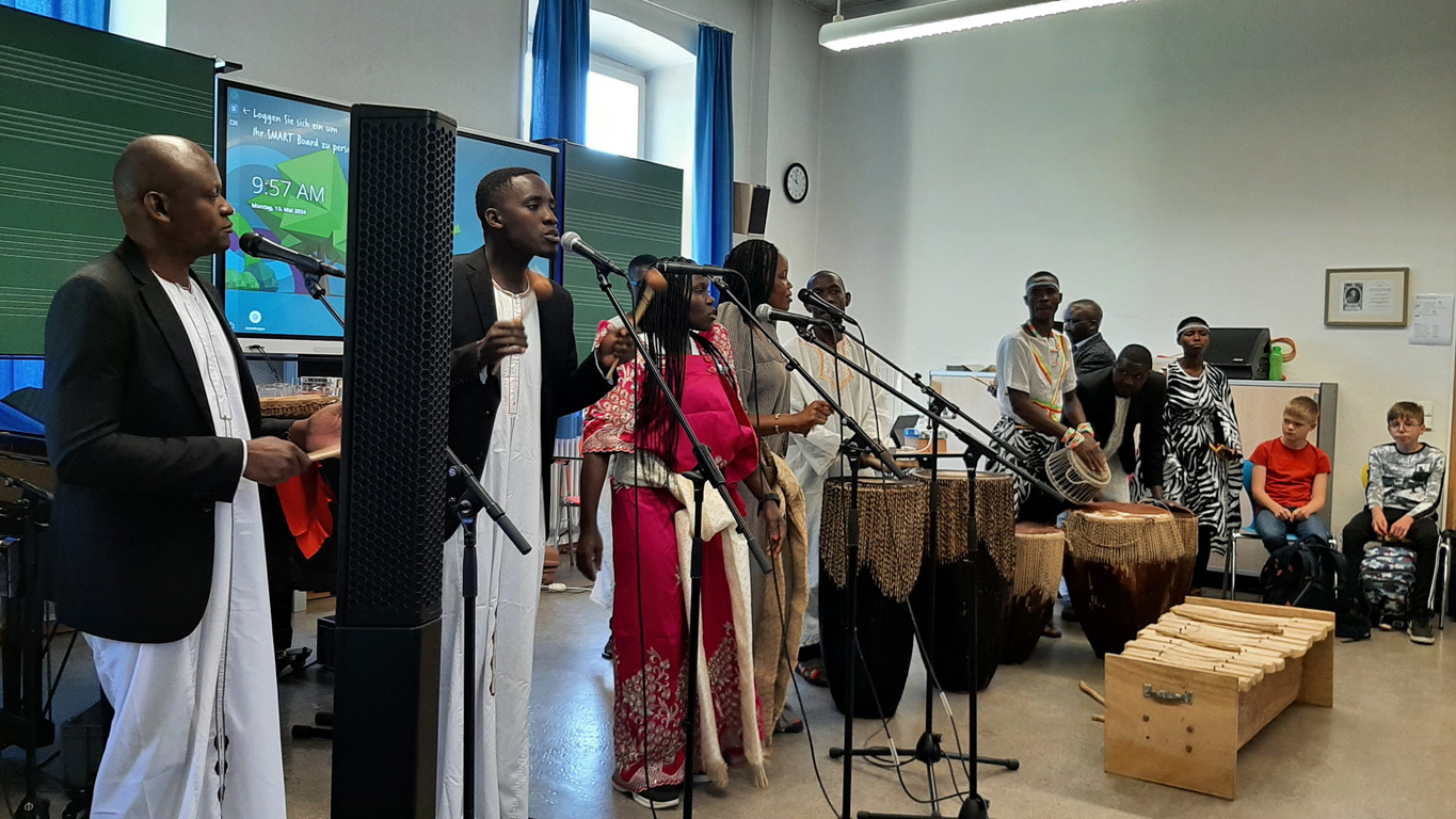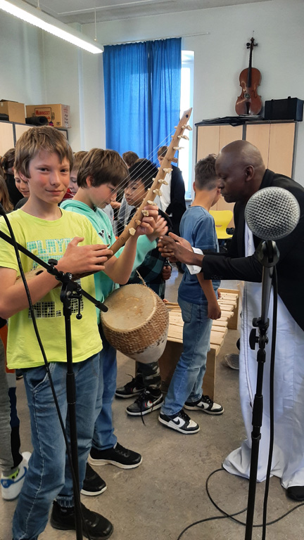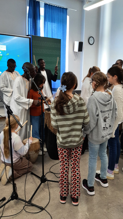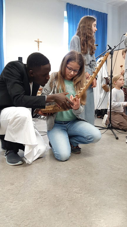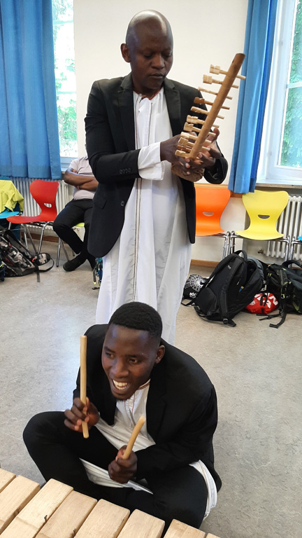 Am Ende der jeweiligen Stunde musizierten Gäste und Schüler miteinander das Lied „Nakato leka“. Das ist ein Kinderlied, in dem die Vögel sich nicht vom Naschen an der Getreideernte verscheuchen lassen wollen.