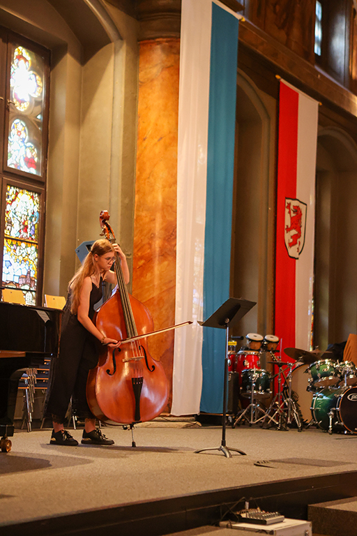 Meisterhaft erklang das Stück von L. Brower, souverän gespielt von Johanna Keilhofer auf der Gitarre. Auch das Kontrabassspiel von Elizabeth Kunert zeigte großes Talent. Der Kontrabass gab sich auch am zweiten Abend ein Stelldichein, gespielt von Clara Eckert. Sicheres Ausloten der dynamischen Abstufungen und sehr differenziertes Spiel zeichneten ihr schönes Spiel aus.