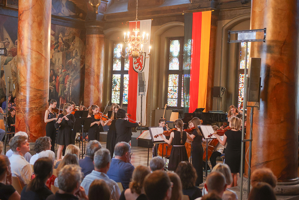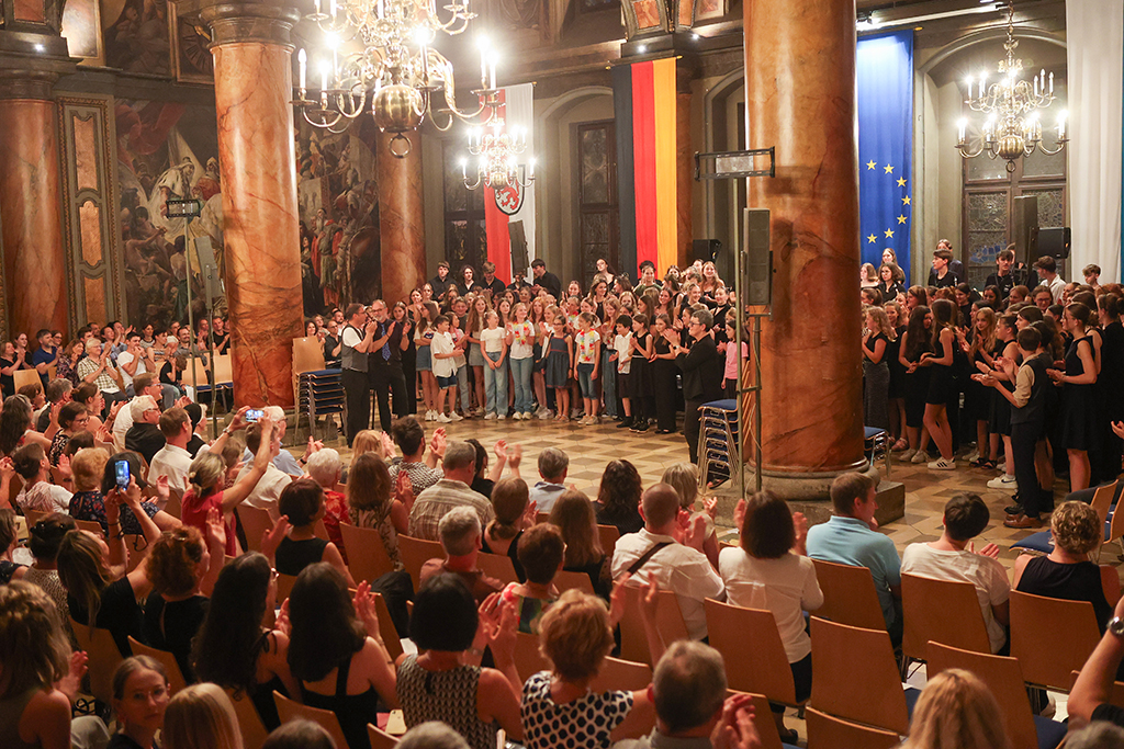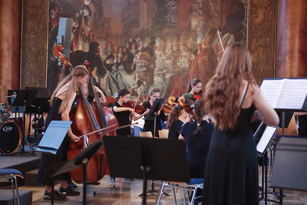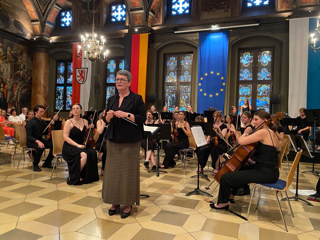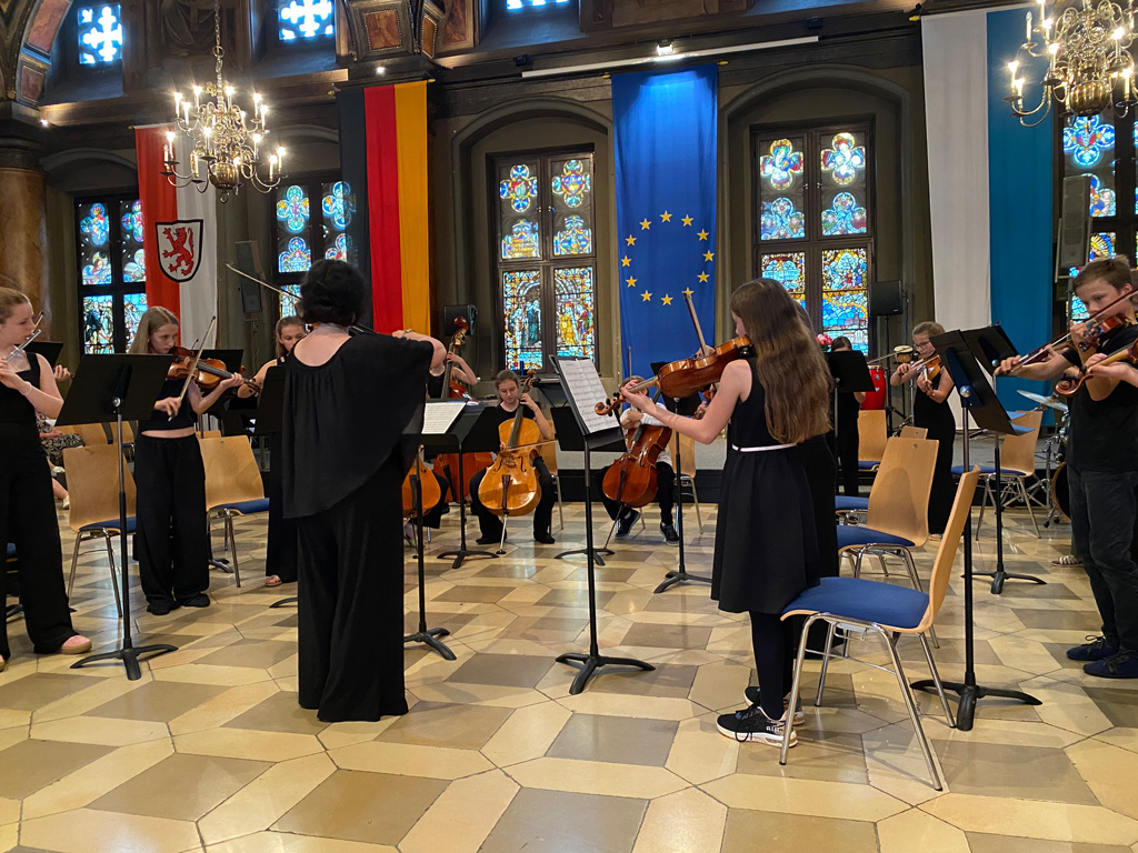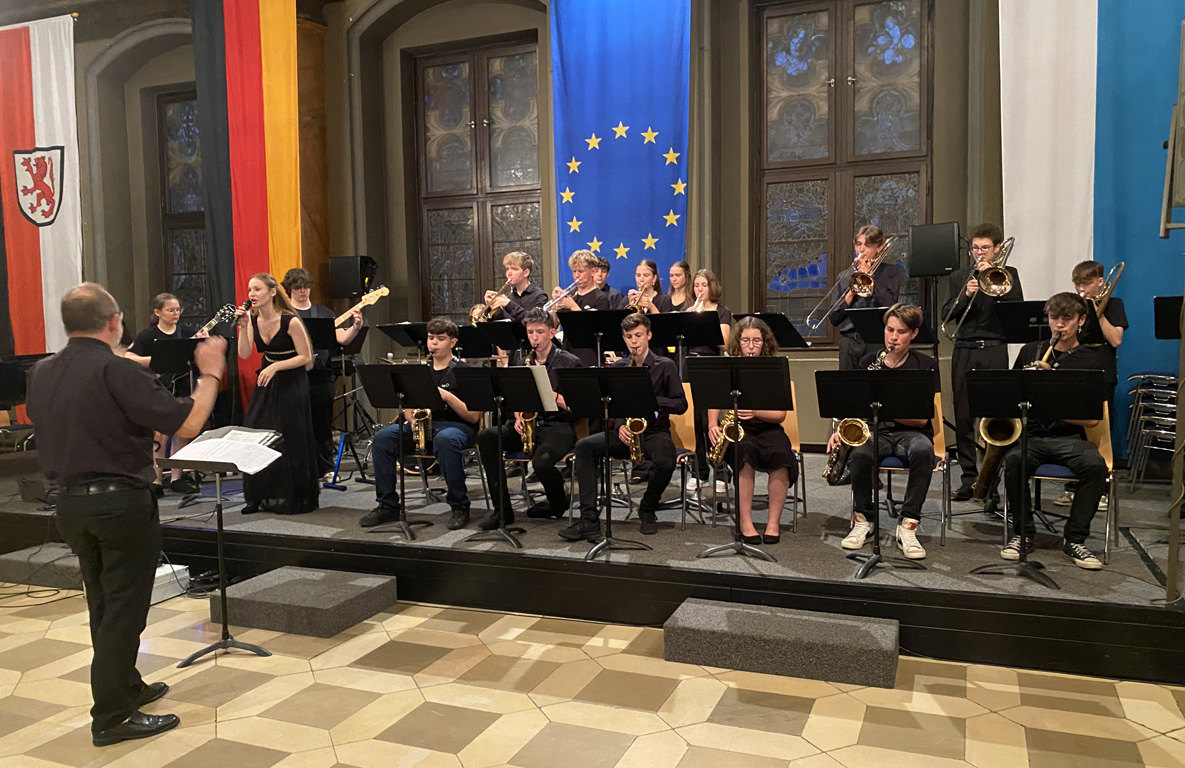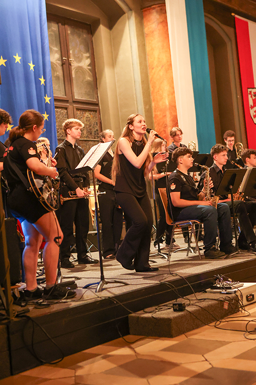 Im dichtgefüllten Rathaussaal bei geradezu tropischer Hitze zeigten alle Ensembles des Auersperg-Gymnasiums ihr Können. Eingeleitet wurden beide Abende durch das Unter- und Mittelstufenorchester, das dieses Jahr mit vielen engagierten jungen Musikern von der 5.-8. Klasse ein erfrischendes Repertoire spielte, geleitet von Brigitte Glas. Das Medley „Phantom der Oper“, ebenso „Shake it off“ von T. Swift erklangen zupackend und ausdrucksvoll am ersten Abend, am zweiten überzeugte die Gruppe vor allem mit einem intonationssicheren, energischen Antonio Vivaldi und C. Caballos „Havana“, nun unterstützt von einer Schülertanzgruppe, die sich sehr bewegungssicher und homogen mit einer schönen Choreografie in die Herzen der Zuhörer tanzte.