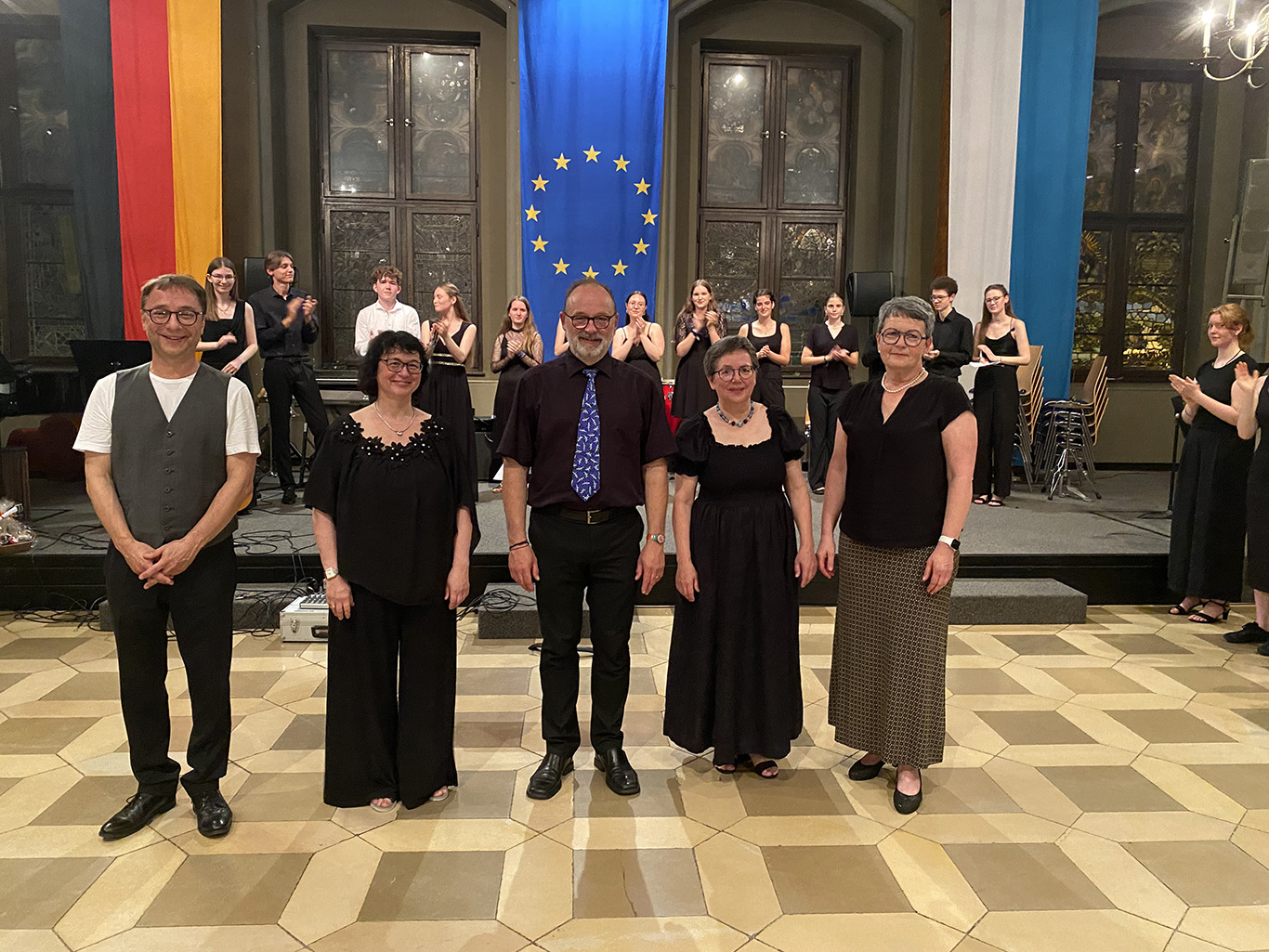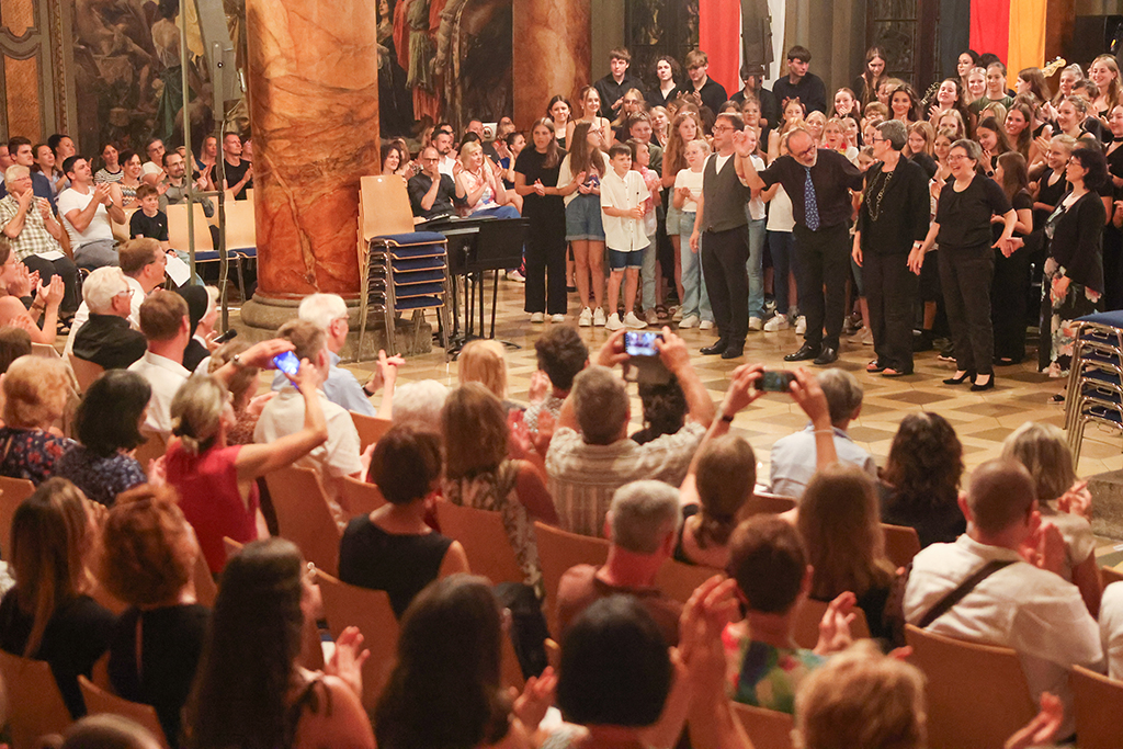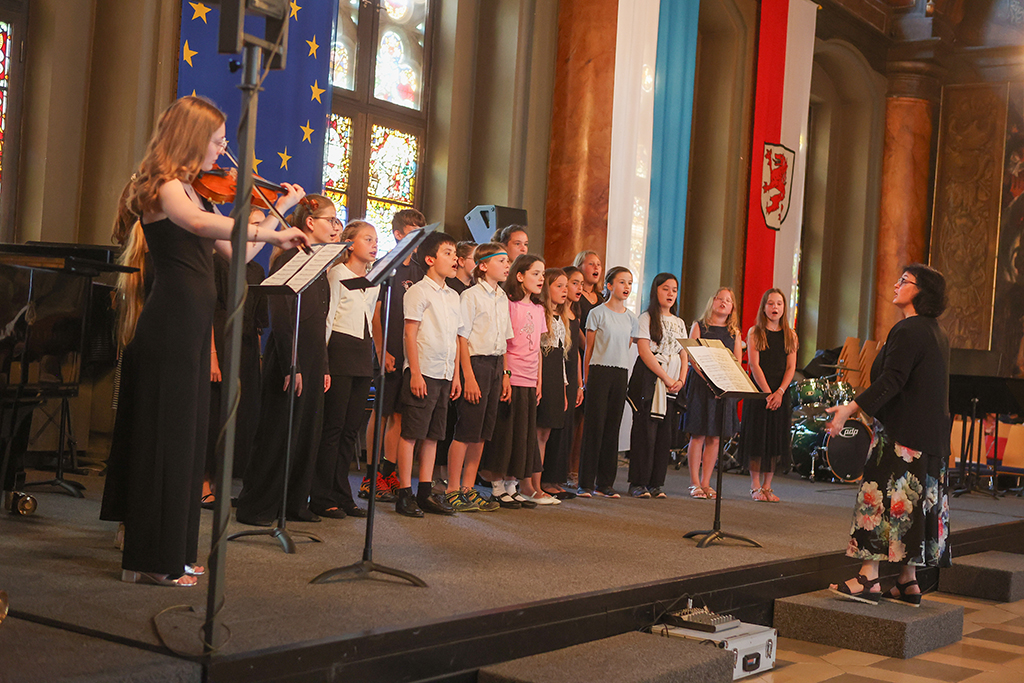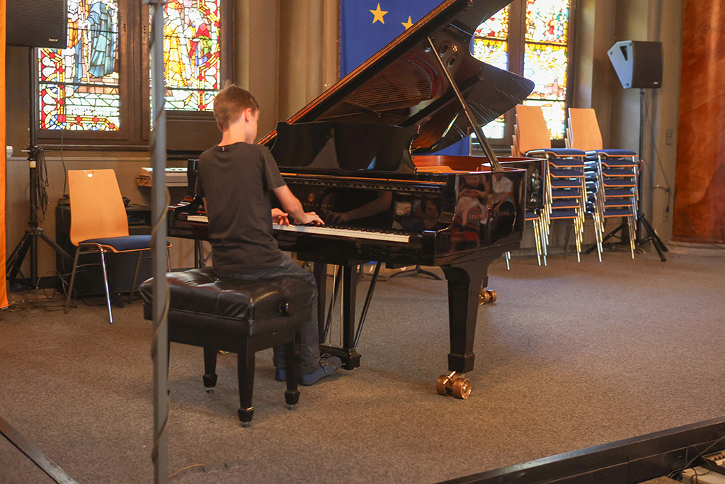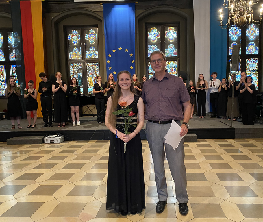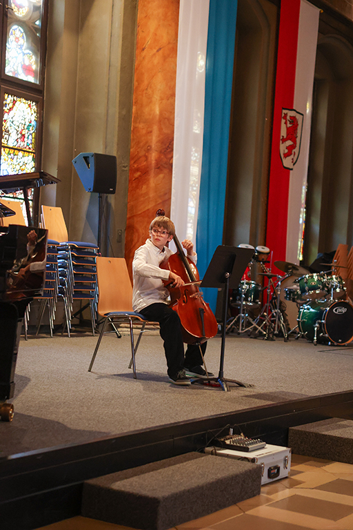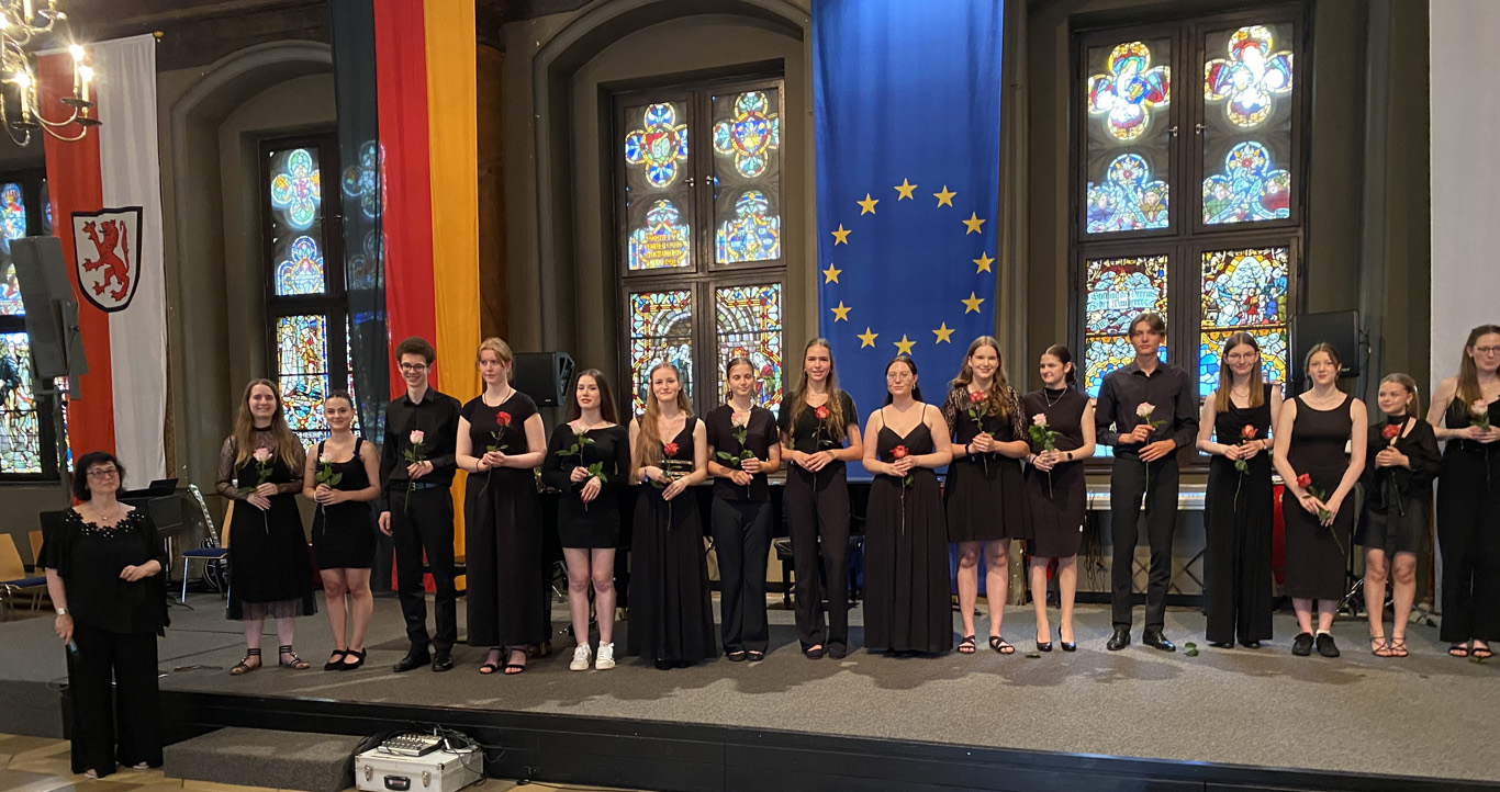Zwischen den Chorstücken erklangen einzelne solistische Werke: David Huber wusste mit R. Schumanns „Mai, du lieber Mai“ das Publikum für sich zu gewinnen mit einem präzisen klaren Anschlag und auswendigem Spiel, ebenso zeigten die Geschwister Felix und Franziska Krause , die engagiert und stilsicher den „Dance Caprice“ mit Violoncello und Klavier vortrugen, großen Ausdruckswillen. Bernkopf Rebecca interpretierte reif mit schönem Ton das „Allegro“ aus A. Dvoraks Sonate G-Dur auf der Violine.