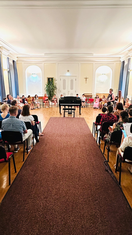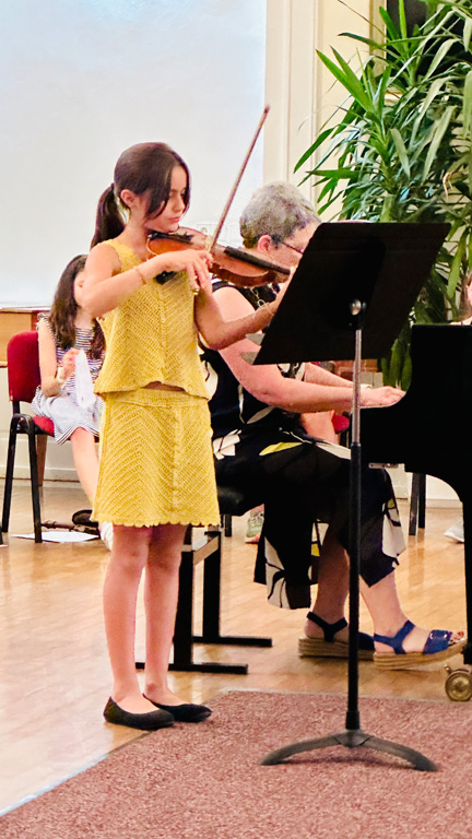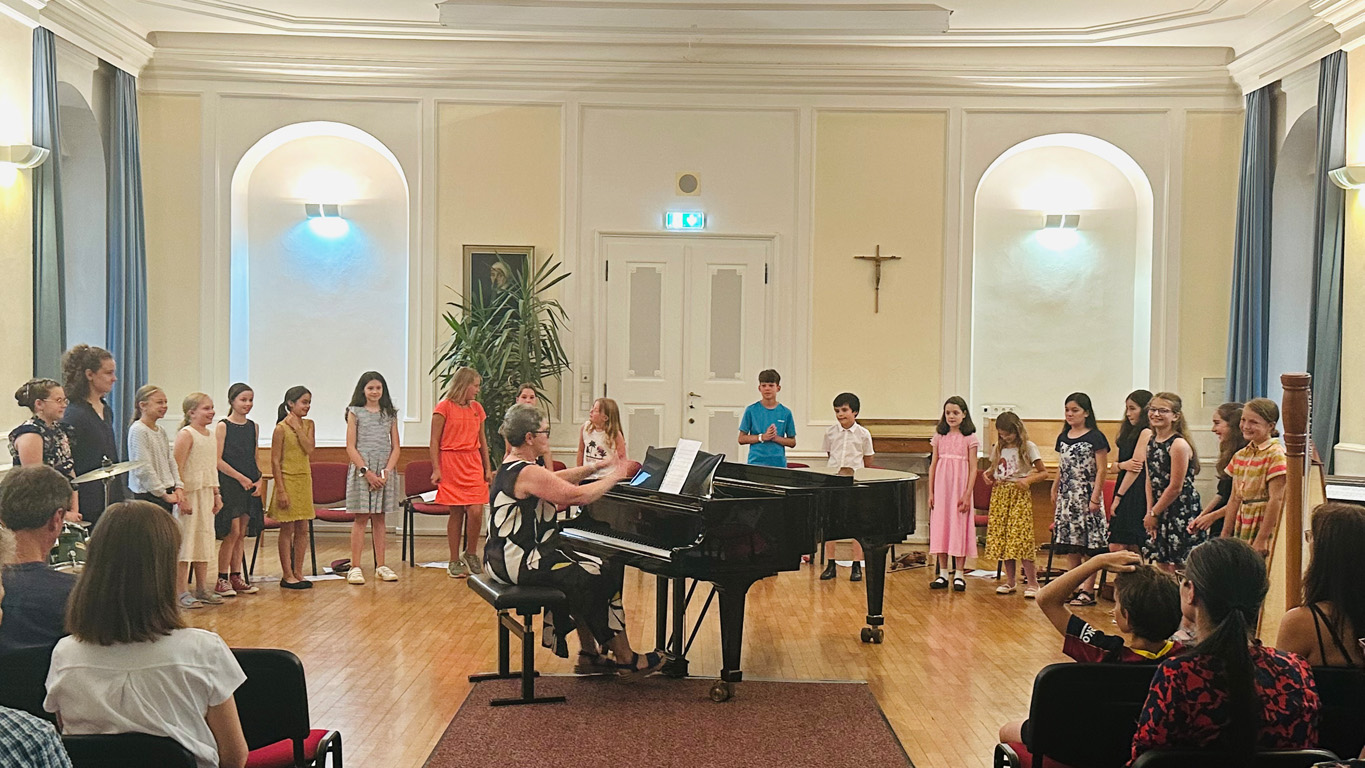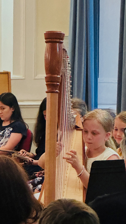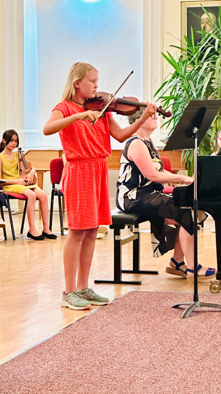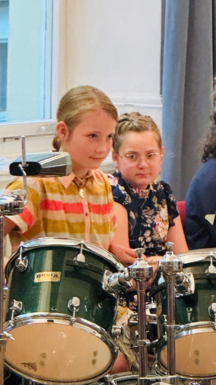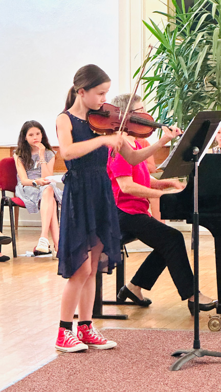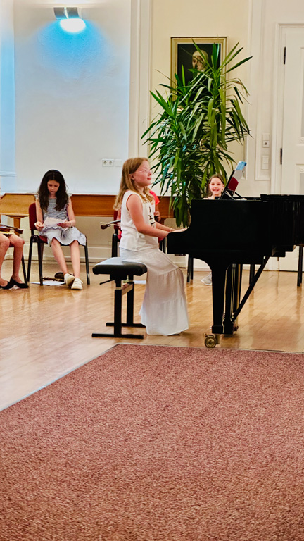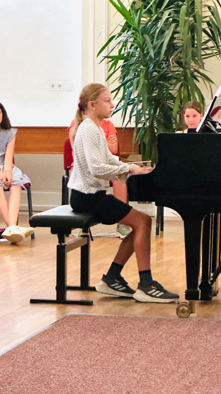Aufgrund der überschaubaren Stücklängen wurde das Konzert zu einem kurzweiligen Vorspielabend, bei dem auch das parallel ablaufende Gewitter mit so manchem Donnerschlag einen außerordentlichen Tusch setzte. Unterschiedlichste Instrumente gab es zu hören: Violine, Klavier, Gitarre, Flöte, Harfe, Klarinette und Schlagzeug. Hier zeigte die Klasse nicht nur ihr klassisches Repertoire, sondern so manche Pianistin große Freude an moderner Popmusik.