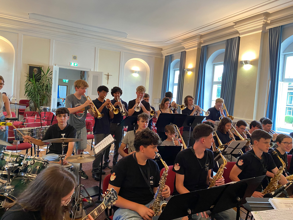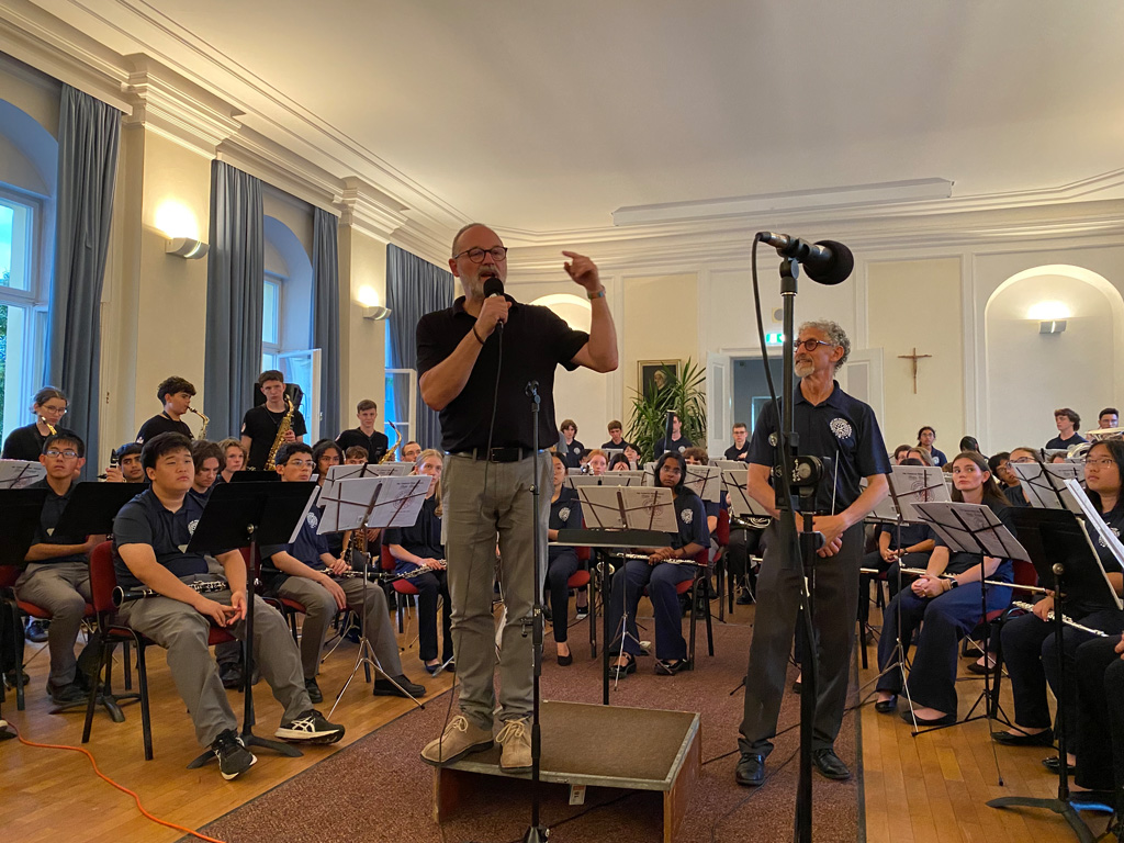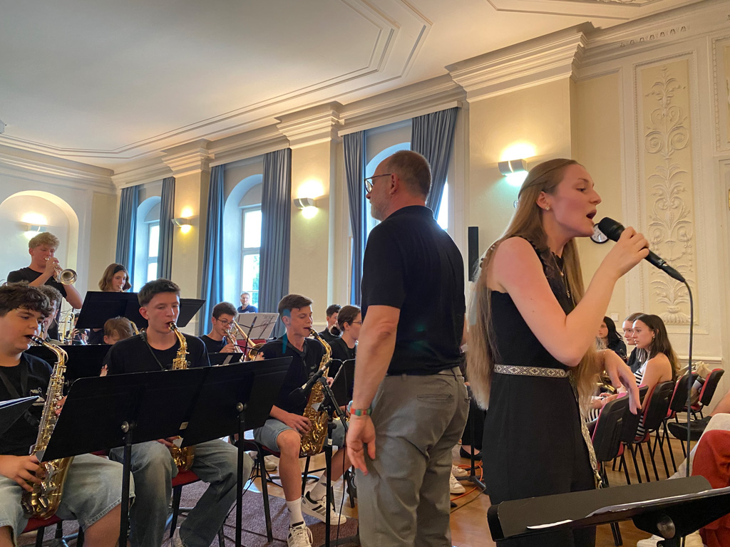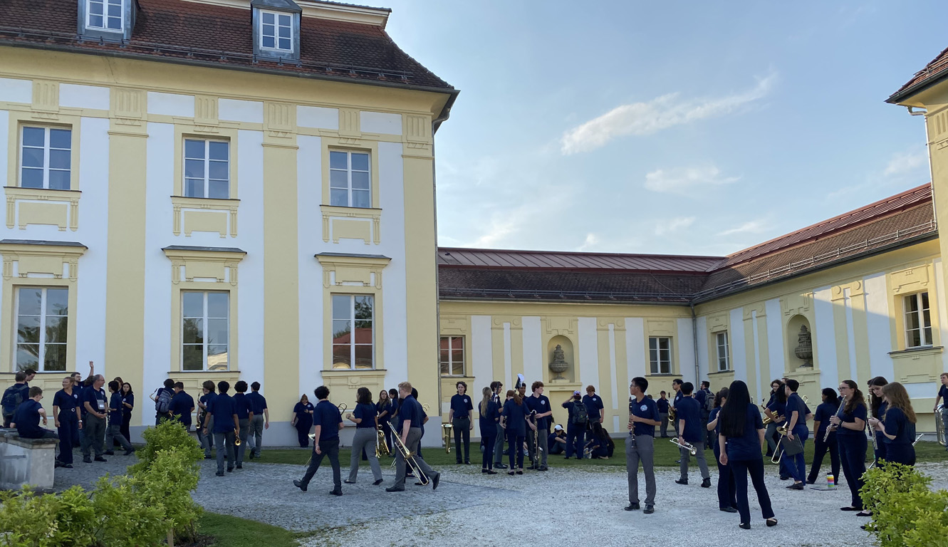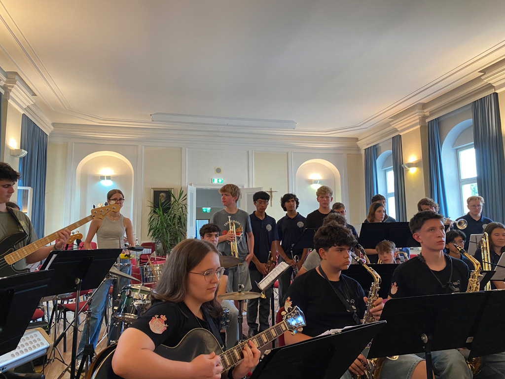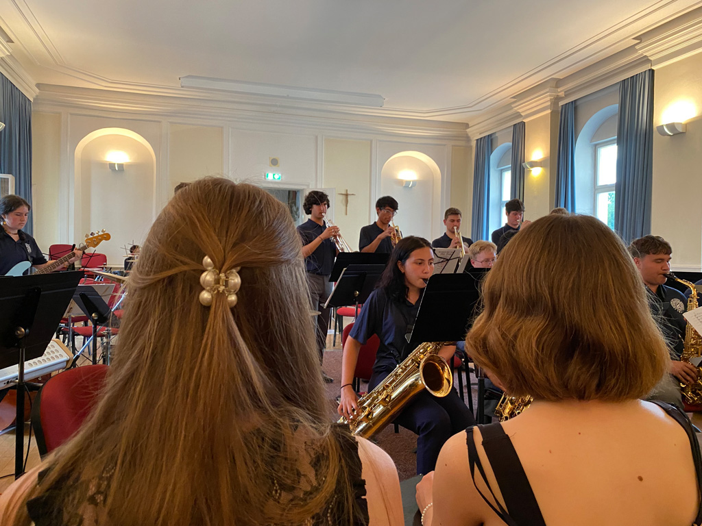 Volles Haus in Freudenhain. Das letzte Freudenhainer Event dieses Sommers machte den Festsaal des ehrwürdigen Schlosses zur Schwitzhütte. 150 junge Musiker aus Amerika und Freudenhain gaben ein beeinruckendes Konzert im, auch vom Publikum, gut gefüllten Saal. Concert Band, zwei Big Bands, Chor, Streichorchester und zum Finale alle gemeinsam begeisterten das Publikum mit einem kanpp zweistündigen Programm voller Spielfreude auf hohem Niveau. Höhepunkt der Veranstaltung war die schnelle Verständigung der jungen Musiker: musikalisch bei einer sehr kurzen gemeinsamen Probe der beiden BigBands , sowie persönlich nach kurzer Schnupperphase. Nach dem Konzert wurden bei Spezi und Übergabe kleiner "Gifts" in Windeseile Kontakte geknüpft, Schulenglisch ausgepackt, Insta-Freundschafte und Facebookadressen ausgetauscht.
