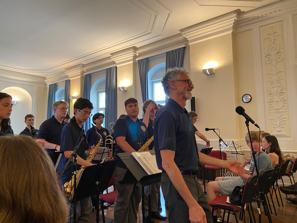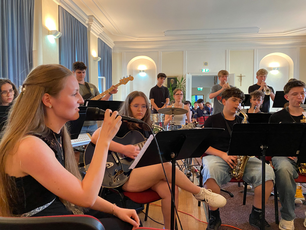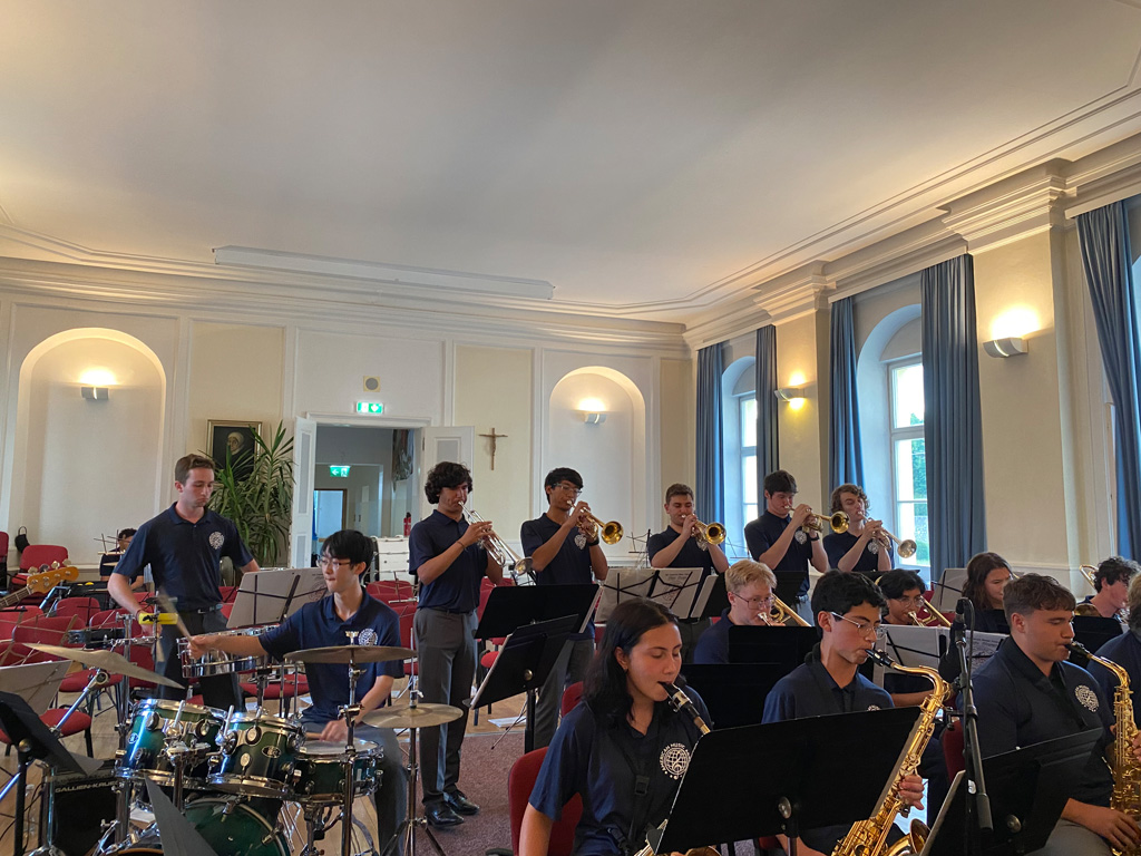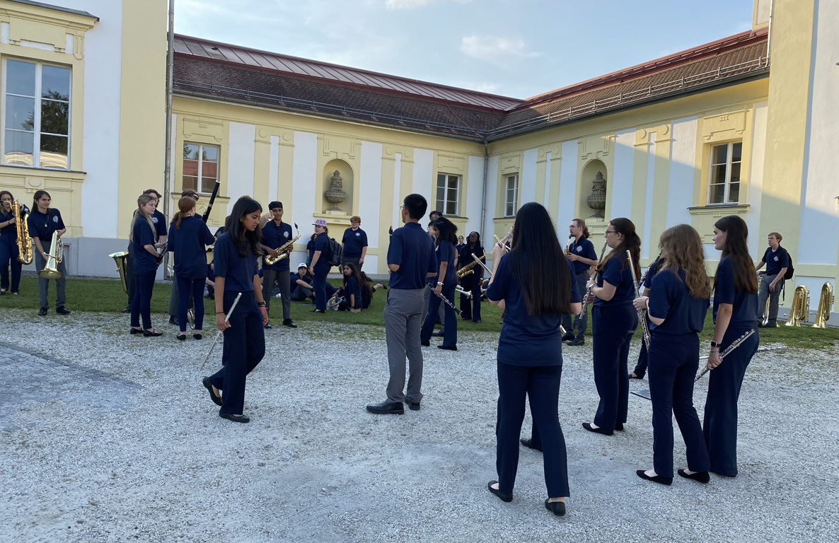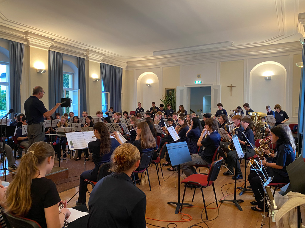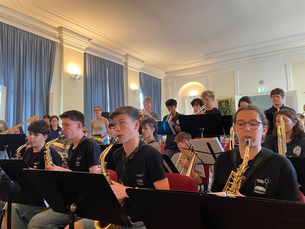 Volles Haus in Freudenhain. Das letzte Freudenhainer Event dieses Sommers machte den Festsaal des ehrwürdigen Schlosses zur Schwitzhütte. 150 junge Musiker aus Amerika und Freudenhain gaben ein beeinruckendes Konzert im, auch vom Publikum, gut gefüllten Saal. Concert Band, zwei Big Bands, Chor, Streichorchester und zum Finale alle gemeinsam begeisterten das Publikum mit einem kanpp zweistündigen Programm voller Spielfreude auf hohem Niveau. Höhepunkt der Veranstaltung war die schnelle Verständigung der jungen Musiker: musikalisch bei einer sehr kurzen gemeinsamen Probe der beiden BigBands , sowie persönlich nach kurzer Schnupperphase. Nach dem Konzert wurden bei Spezi und Übergabe kleiner "Gifts" in Windeseile Kontakte geknüpft, Schulenglisch ausgepackt, Insta-Freundschafte und Facebookadressen ausgetauscht.
