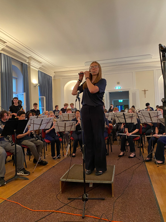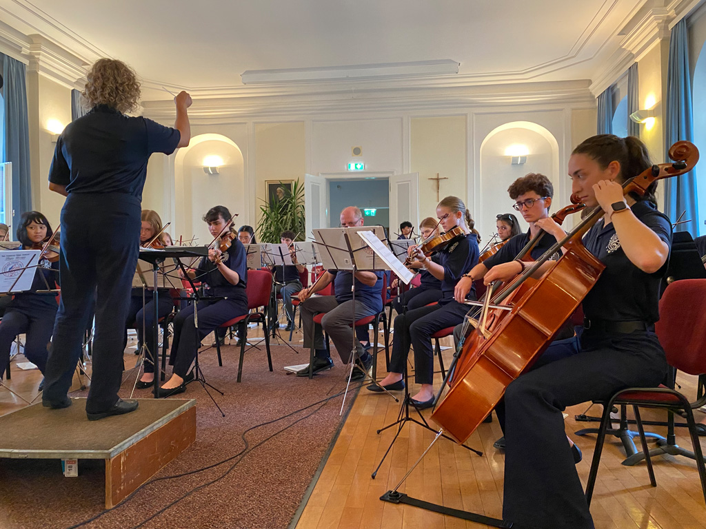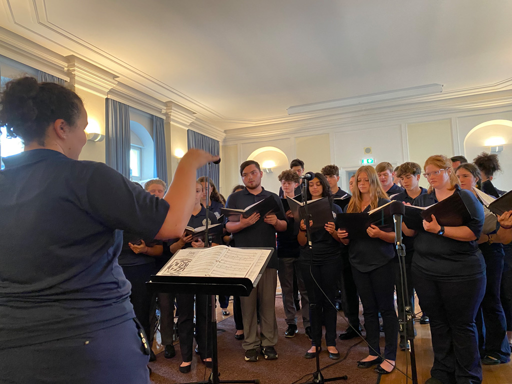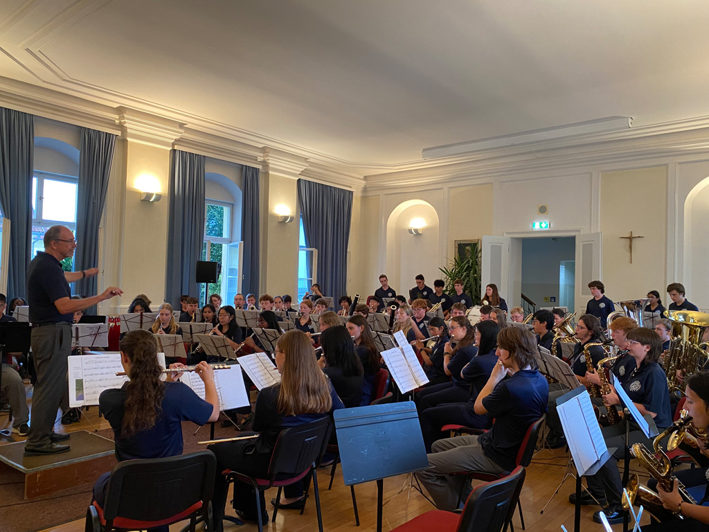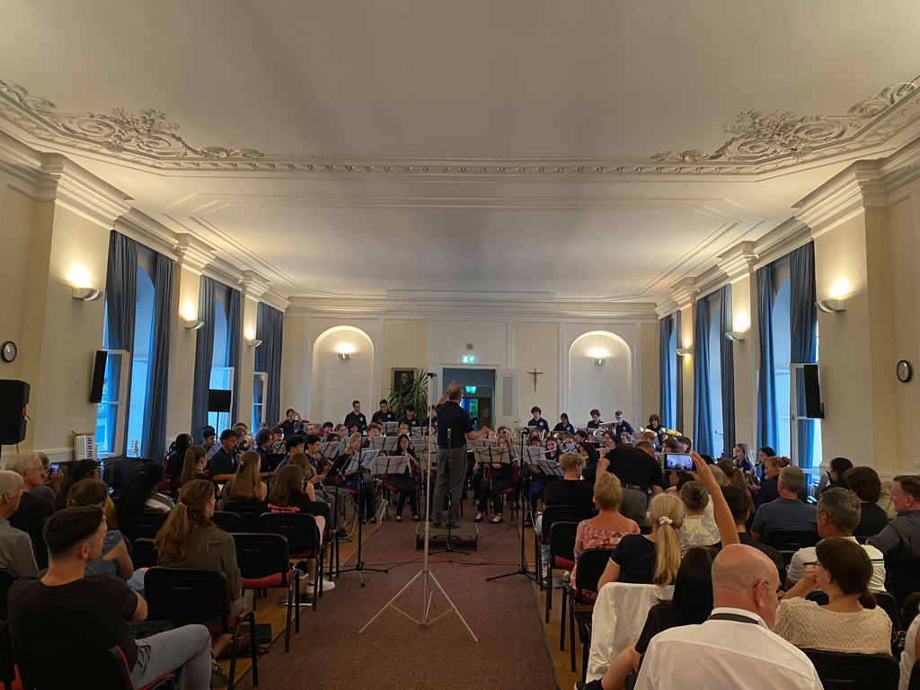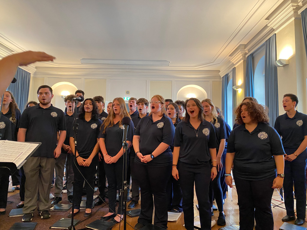 Volles Haus in Freudenhain. Das letzte Freudenhainer Event dieses Sommers machte den Festsaal des ehrwürdigen Schlosses zur Schwitzhütte. 150 junge Musiker aus Amerika und Freudenhain gaben ein beeinruckendes Konzert im, auch vom Publikum, gut gefüllten Saal. Concert Band, zwei Big Bands, Chor, Streichorchester und zum Finale alle gemeinsam begeisterten das Publikum mit einem kanpp zweistündigen Programm voller Spielfreude auf hohem Niveau. Höhepunkt der Veranstaltung war die schnelle Verständigung der jungen Musiker: musikalisch bei einer sehr kurzen gemeinsamen Probe der beiden BigBands , sowie persönlich nach kurzer Schnupperphase. Nach dem Konzert wurden bei Spezi und Übergabe kleiner "Gifts" in Windeseile Kontakte geknüpft, Schulenglisch ausgepackt, Insta-Freundschafte und Facebookadressen ausgetauscht.