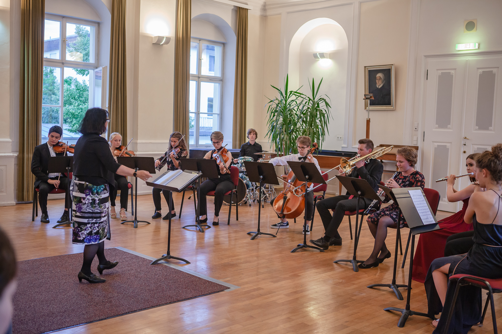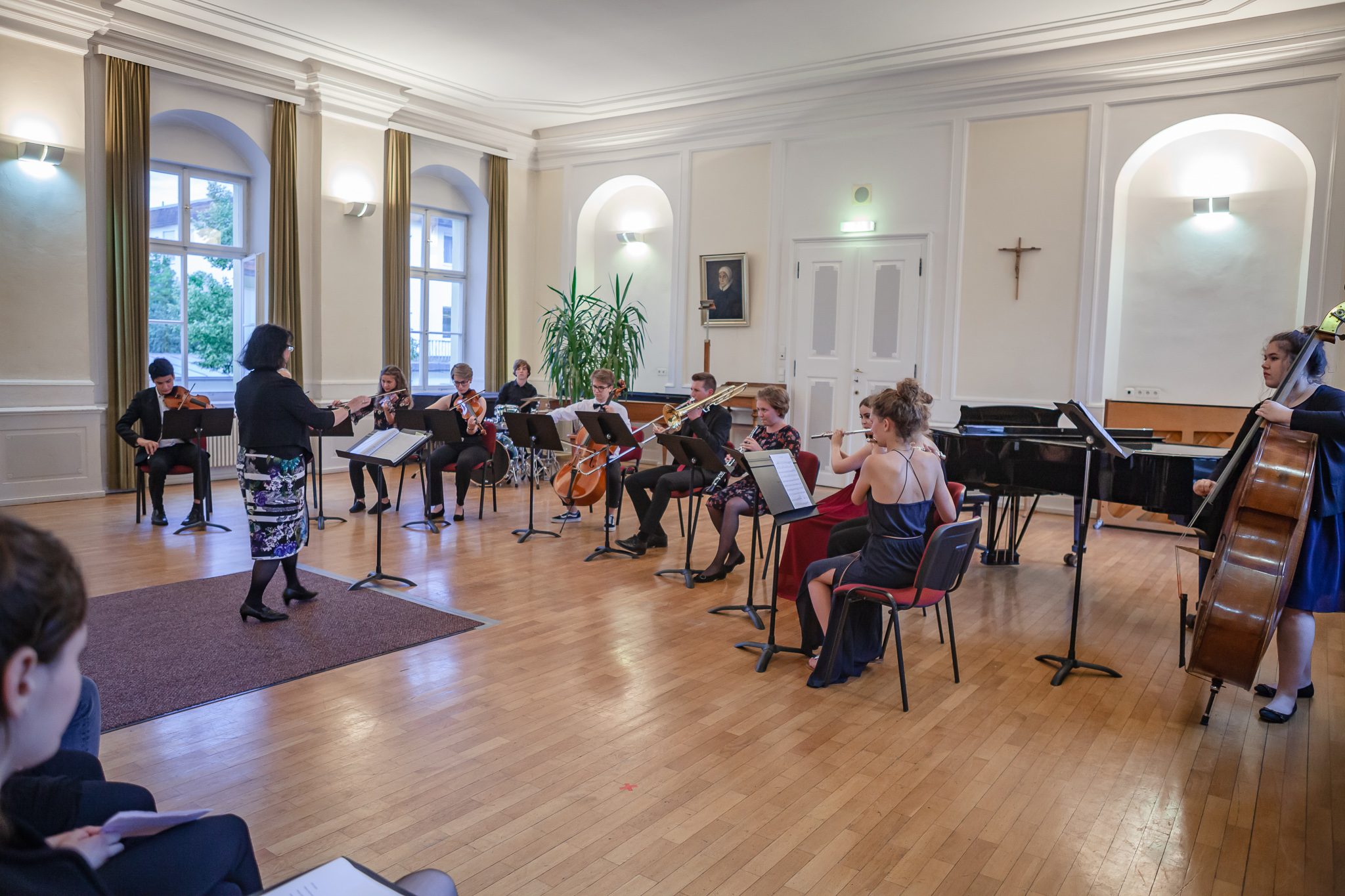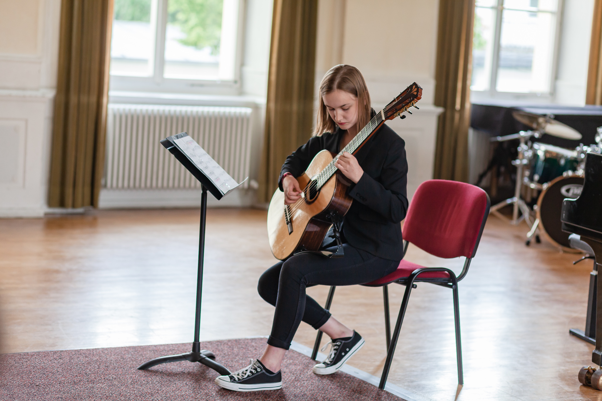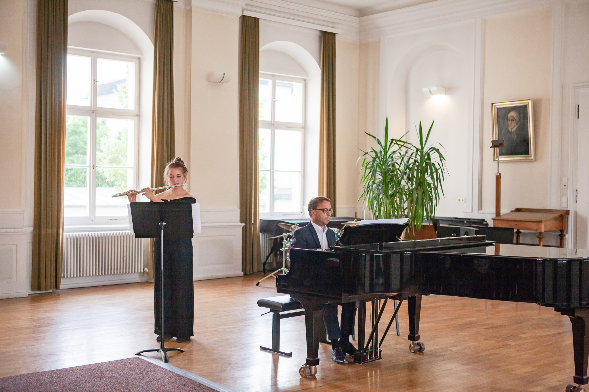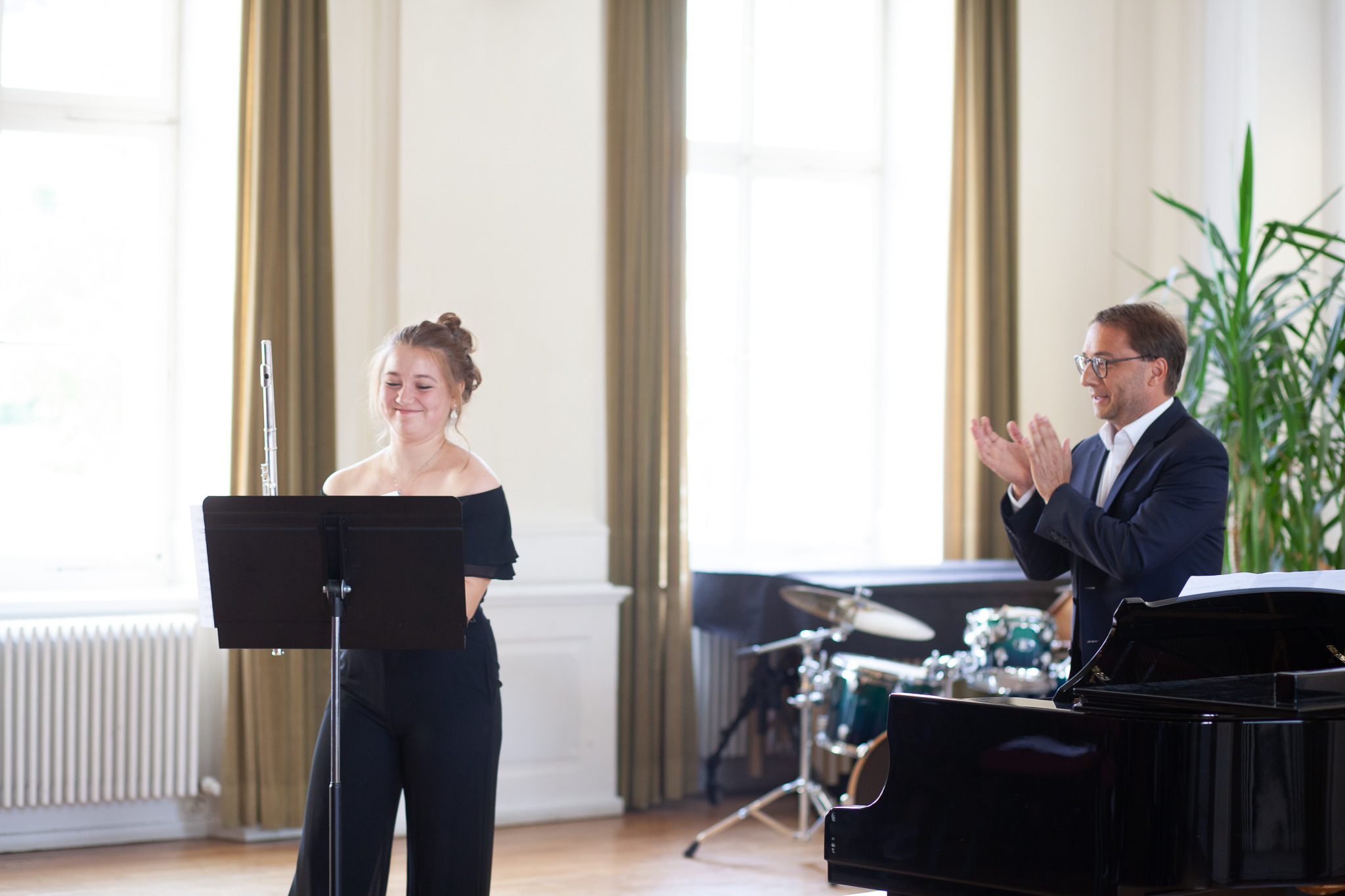 Die Streicher wussten auch zu überzeugen, allen voran Felix Lambsdorff auf der Violine und Korbinian Seibold auf dem Violoncello, die überaus ausdrucksstark und virtuos ihre Werke darboten. Anna Riesinger zeigte ihr Können mit einem Satz aus Joseph Haydns Violinkonzert, Laura Sonnleitner stimmte ein Rondo von W. A. Mozart an und Vanessa Bauer interpretierte ein Werk von Henry Eccles. Auch die Riege der Querflötistinnen mit Lena Mautner, Alina Schlichtenmayer und Lea Schwarzmeier begeisterte mit ihrem Spiel. Sowohl virtuose als auch lyrisch ausdrucksstarke Momente prägten ihr Spiel. Die Pianisten des Kurses, Pia Martin, Simon Seidl, DaHye Kim und Magnus Schiebelsberger beeindruckten mit ihren Leistungen in Werken von Mozart, Scarlatti, Schumann und Schubert. Sie entfalteten in ihren Interpretationen eine große Palette von Ausdrucksmöglichkeiten, die sich auch im Spiel der Instrumente Gitarre und Schlagzeug deutlich zeigte. So verzauberte Eva Heide mit ihrem südamerikanischen „Tico, Tico“ die Zuhörer. Tobias Baier setzte mit dem Werk Caramba einen fulminanten Eckpfeiler.