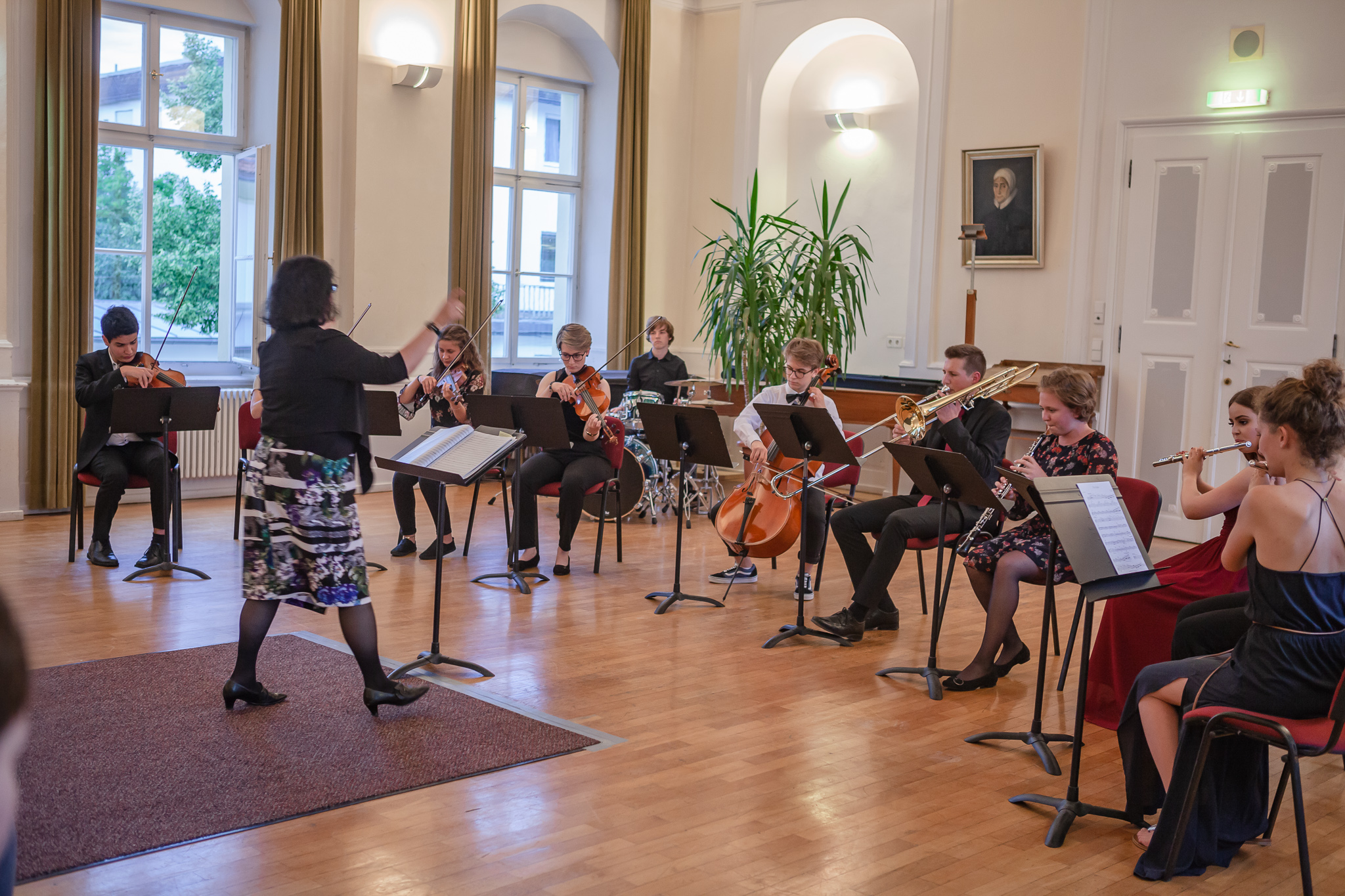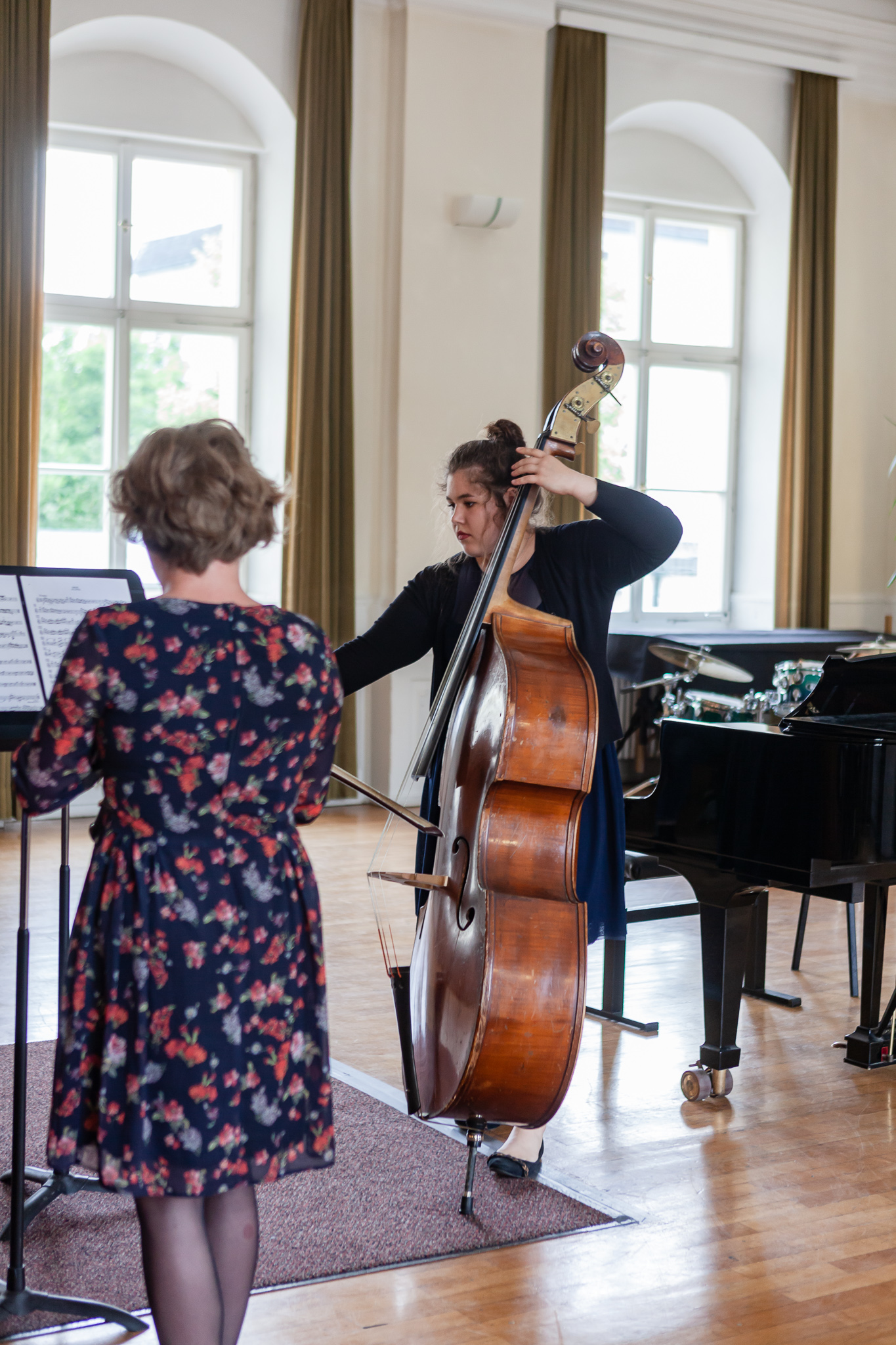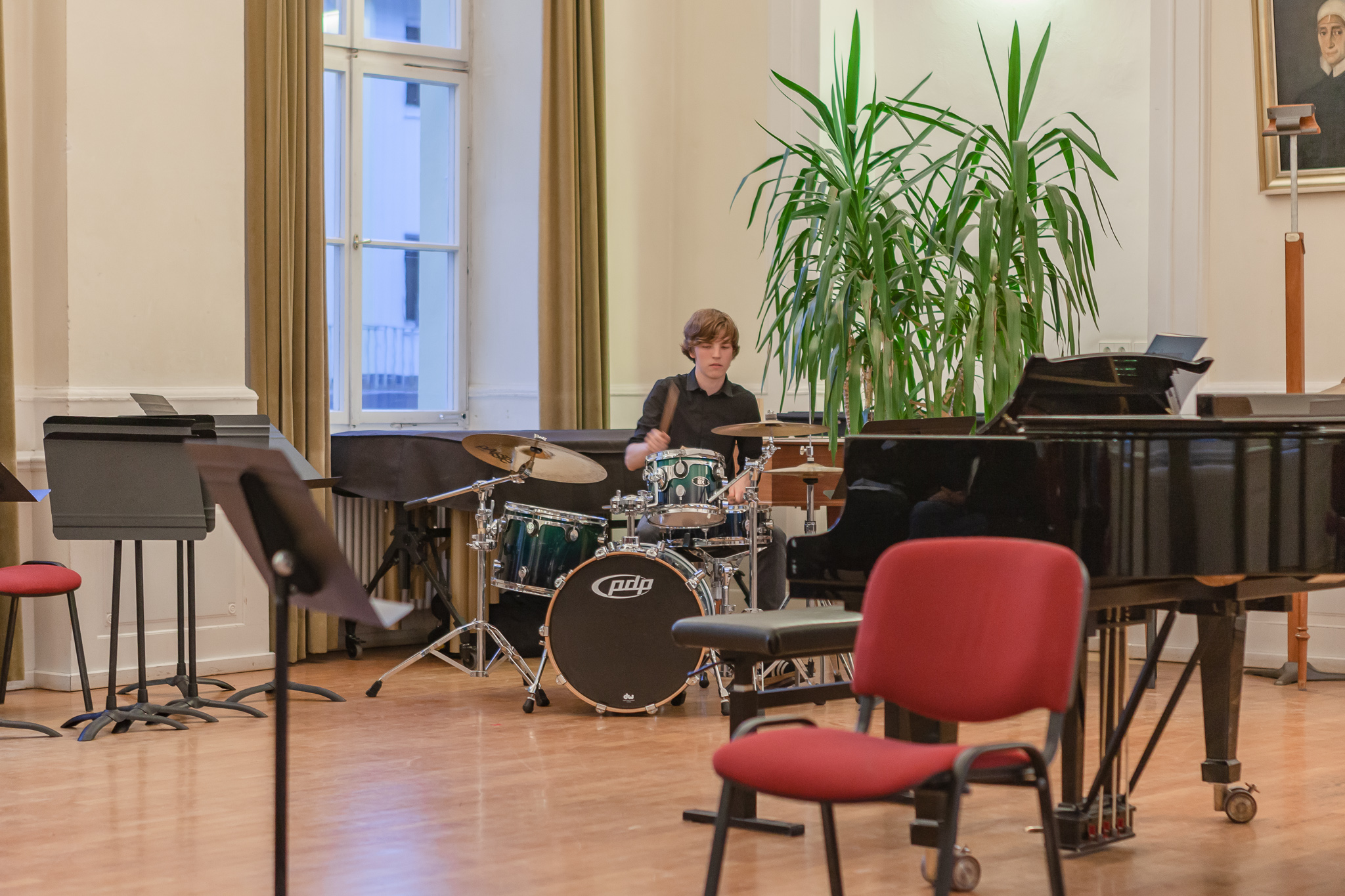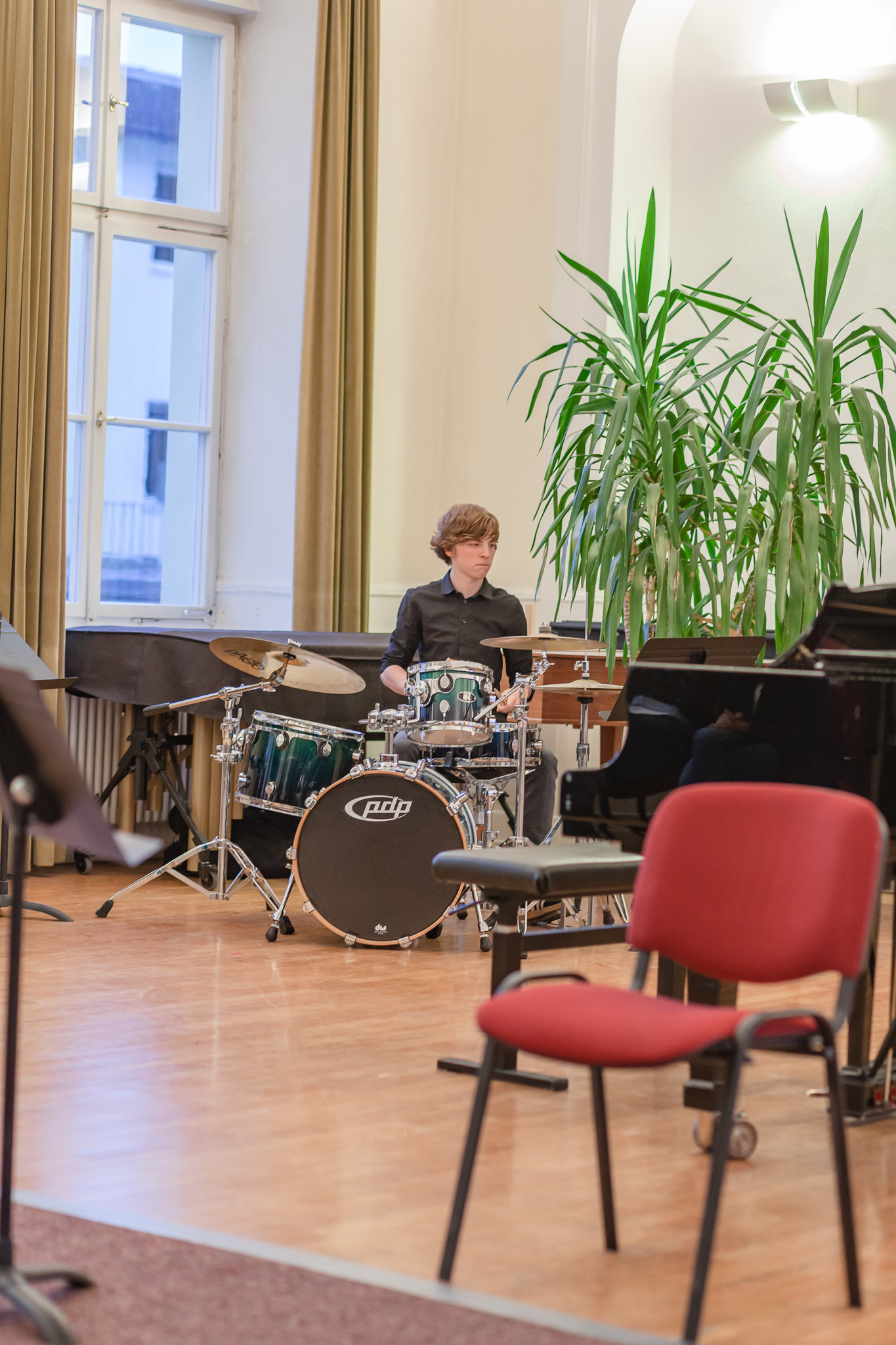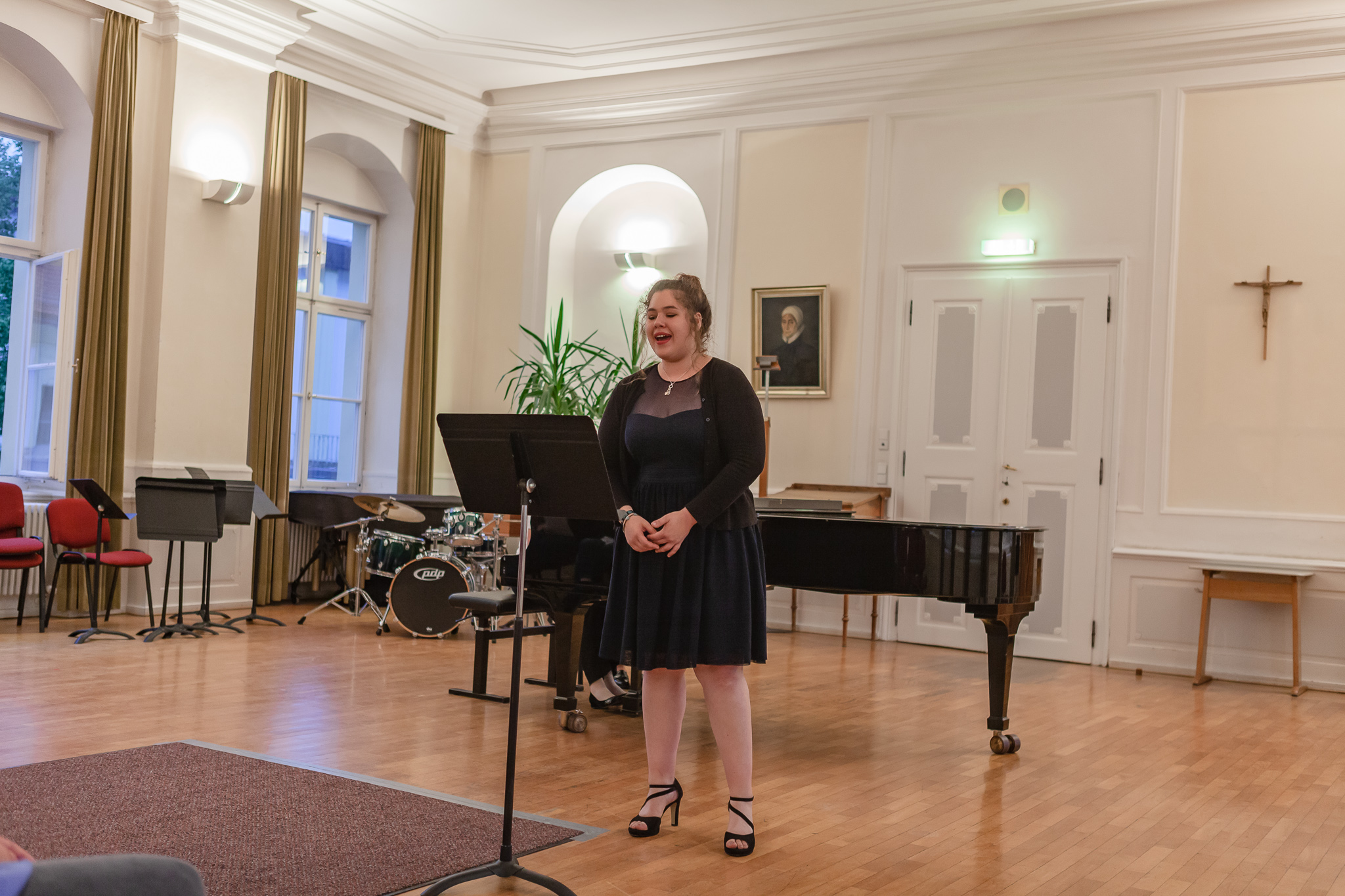 Die Streicher wussten auch zu überzeugen, allen voran Felix Lambsdorff auf der Violine und Korbinian Seibold auf dem Violoncello, die überaus ausdrucksstark und virtuos ihre Werke darboten. Anna Riesinger zeigte ihr Können mit einem Satz aus Joseph Haydns Violinkonzert, Laura Sonnleitner stimmte ein Rondo von W. A. Mozart an und Vanessa Bauer interpretierte ein Werk von Henry Eccles. Auch die Riege der Querflötistinnen mit Lena Mautner, Alina Schlichtenmayer und Lea Schwarzmeier begeisterte mit ihrem Spiel. Sowohl virtuose als auch lyrisch ausdrucksstarke Momente prägten ihr Spiel. Die Pianisten des Kurses, Pia Martin, Simon Seidl, DaHye Kim und Magnus Schiebelsberger beeindruckten mit ihren Leistungen in Werken von Mozart, Scarlatti, Schumann und Schubert. Sie entfalteten in ihren Interpretationen eine große Palette von Ausdrucksmöglichkeiten, die sich auch im Spiel der Instrumente Gitarre und Schlagzeug deutlich zeigte. So verzauberte Eva Heide mit ihrem südamerikanischen „Tico, Tico“ die Zuhörer. Tobias Baier setzte mit dem Werk Caramba einen fulminanten Eckpfeiler.