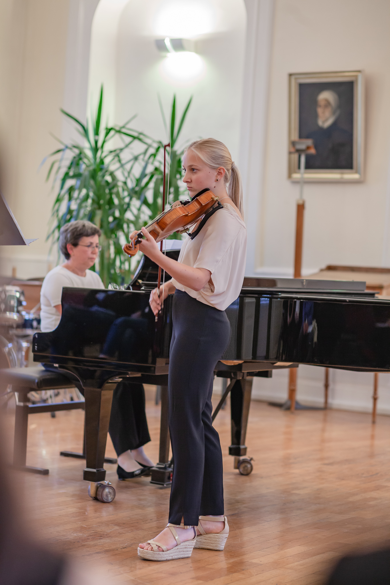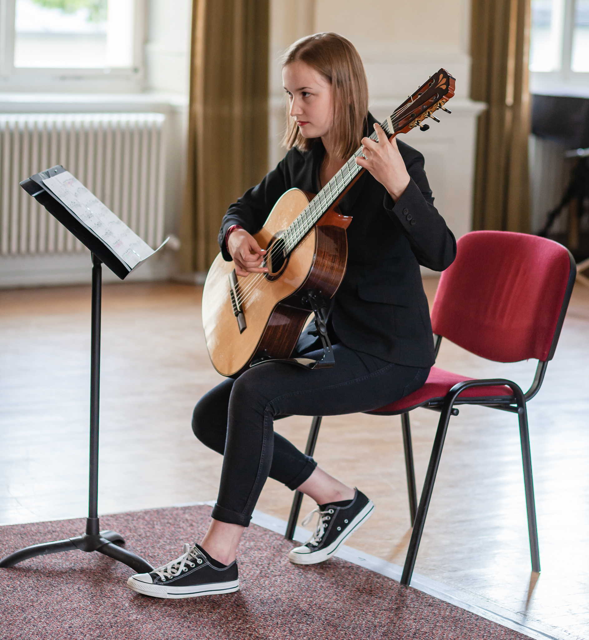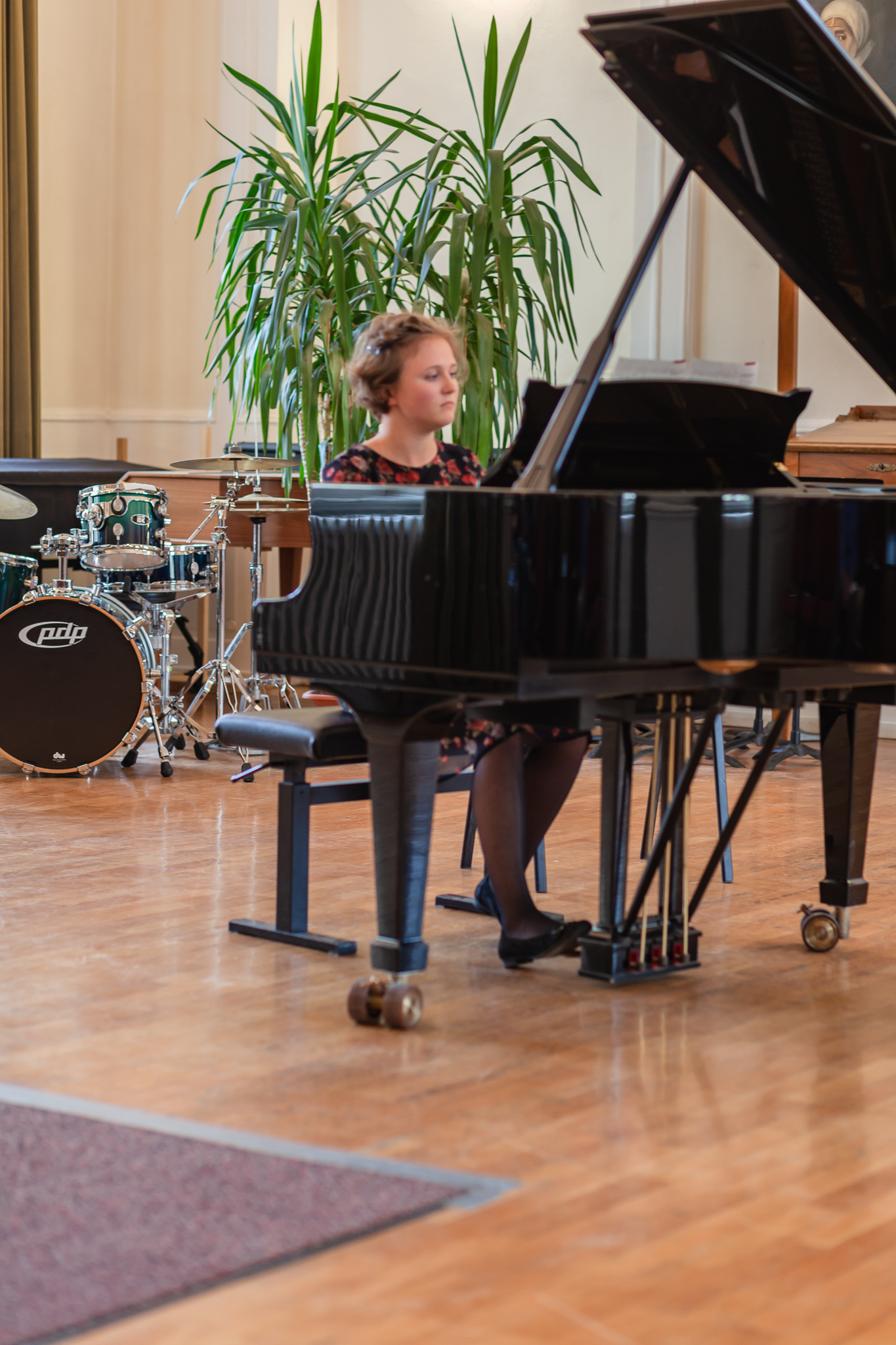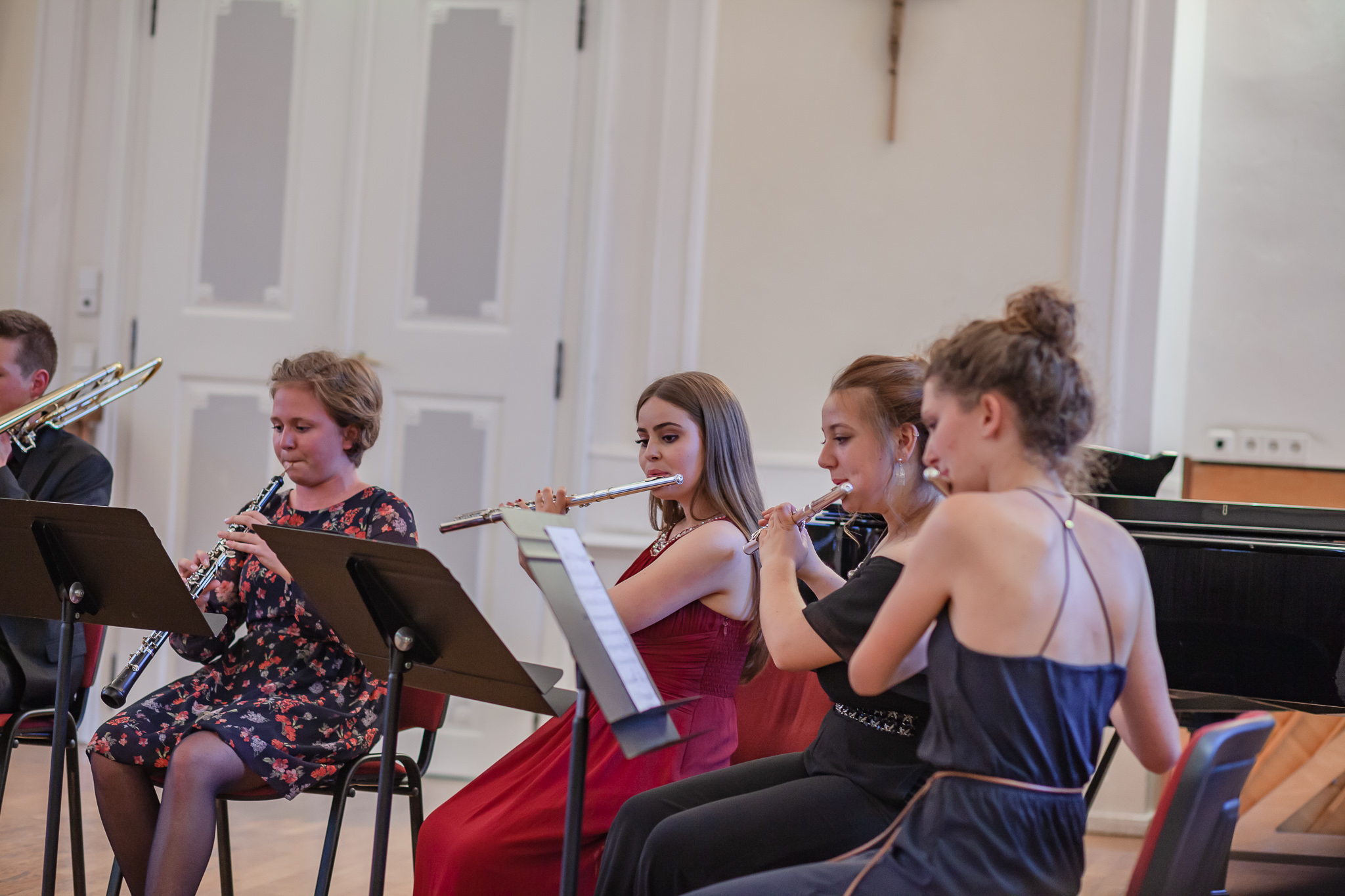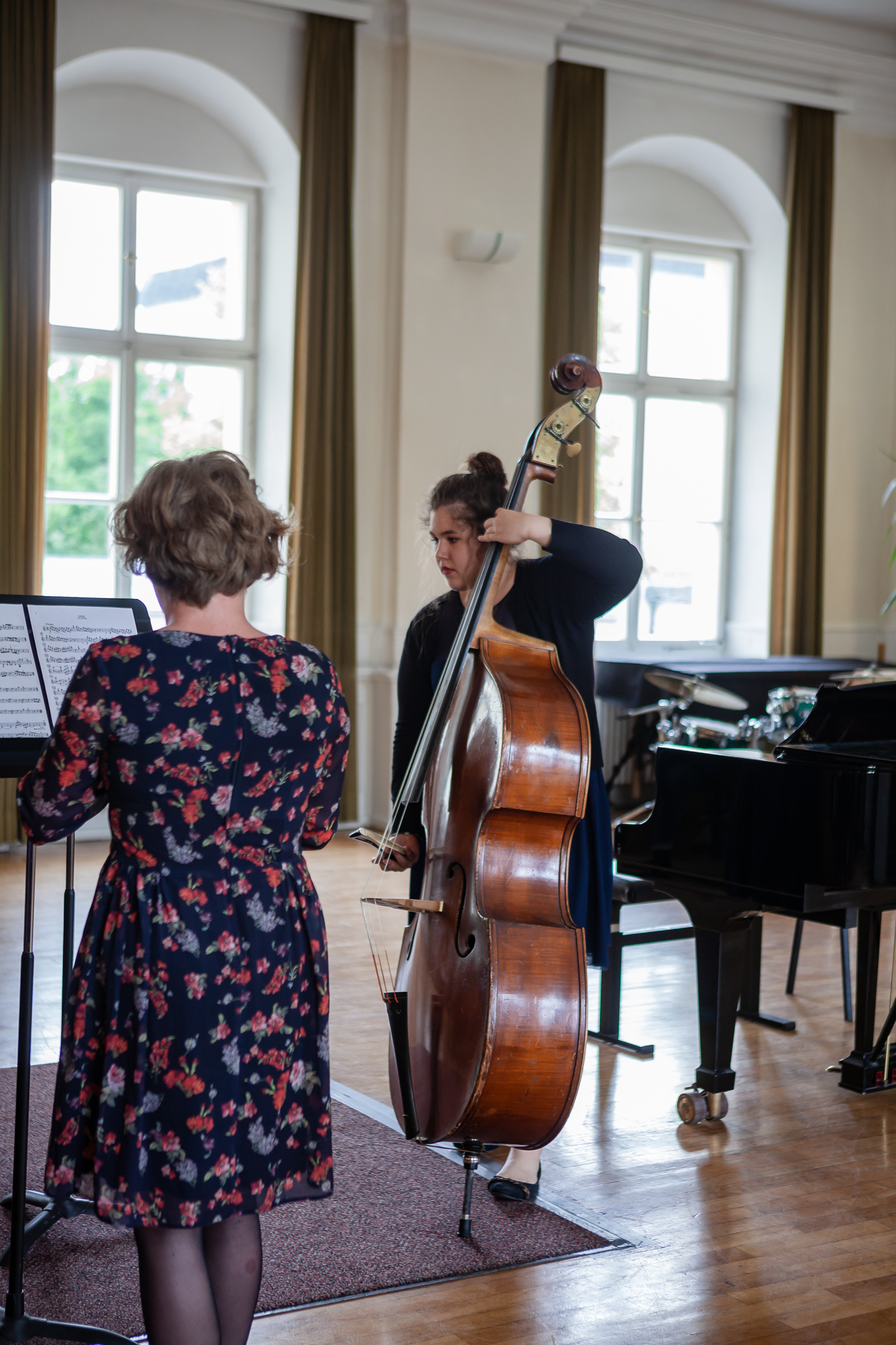 Die Streicher wussten auch zu überzeugen, allen voran Felix Lambsdorff auf der Violine und Korbinian Seibold auf dem Violoncello, die überaus ausdrucksstark und virtuos ihre Werke darboten. Anna Riesinger zeigte ihr Können mit einem Satz aus Joseph Haydns Violinkonzert, Laura Sonnleitner stimmte ein Rondo von W. A. Mozart an und Vanessa Bauer interpretierte ein Werk von Henry Eccles. Auch die Riege der Querflötistinnen mit Lena Mautner, Alina Schlichtenmayer und Lea Schwarzmeier begeisterte mit ihrem Spiel. Sowohl virtuose als auch lyrisch ausdrucksstarke Momente prägten ihr Spiel. Die Pianisten des Kurses, Pia Martin, Simon Seidl, DaHye Kim und Magnus Schiebelsberger beeindruckten mit ihren Leistungen in Werken von Mozart, Scarlatti, Schumann und Schubert. Sie entfalteten in ihren Interpretationen eine große Palette von Ausdrucksmöglichkeiten, die sich auch im Spiel der Instrumente Gitarre und Schlagzeug deutlich zeigte. So verzauberte Eva Heide mit ihrem südamerikanischen „Tico, Tico“ die Zuhörer. Tobias Baier setzte mit dem Werk Caramba einen fulminanten Eckpfeiler.