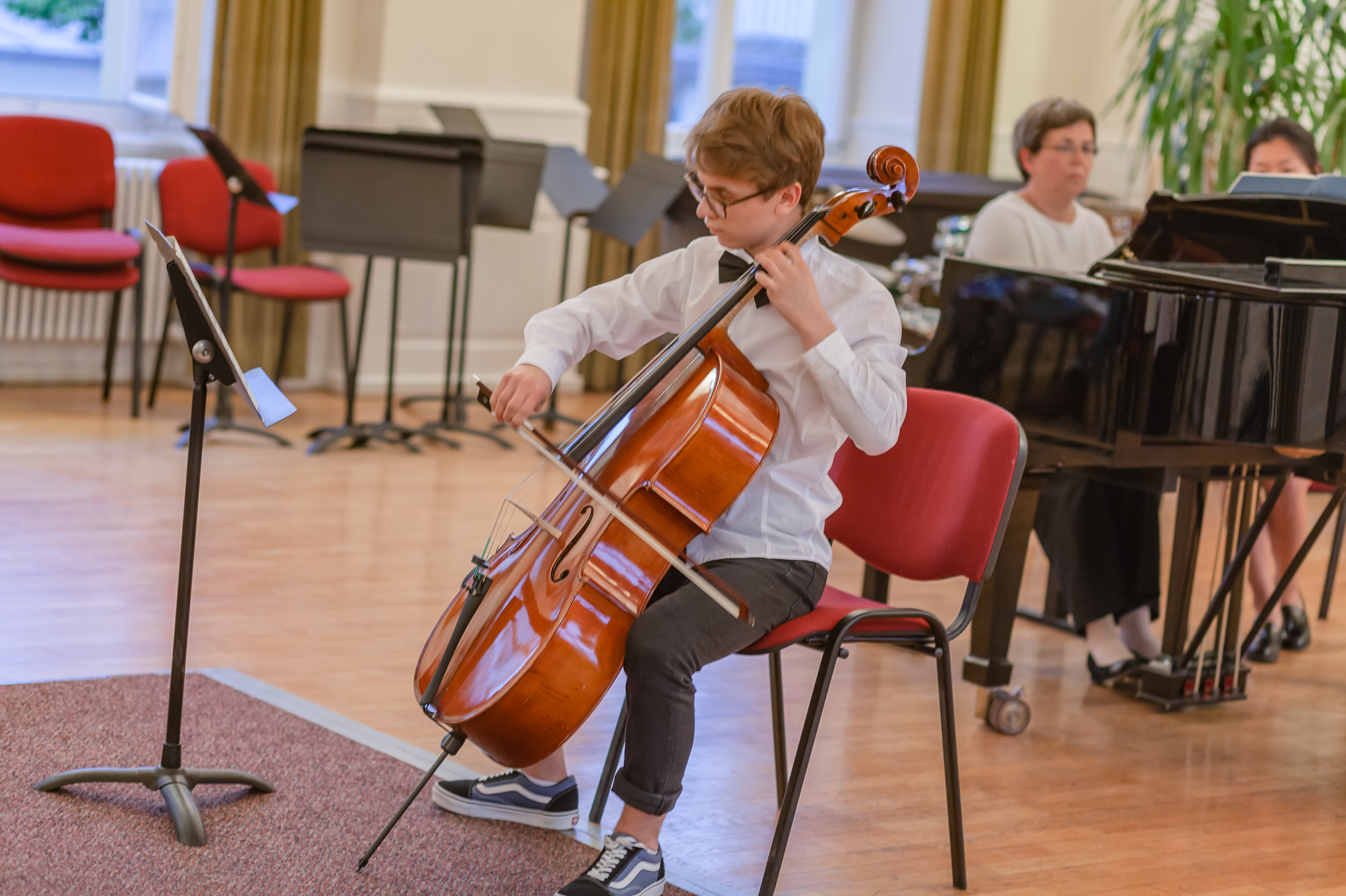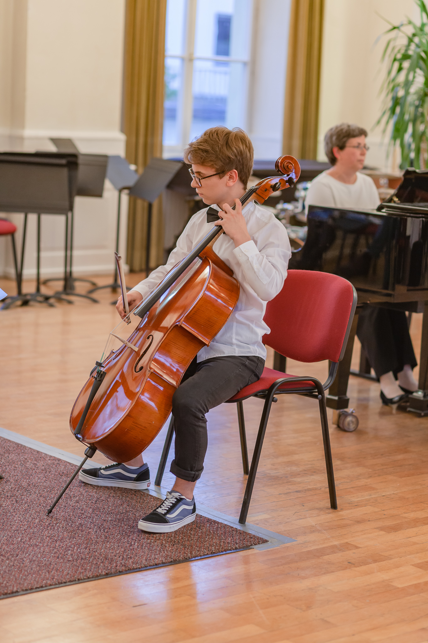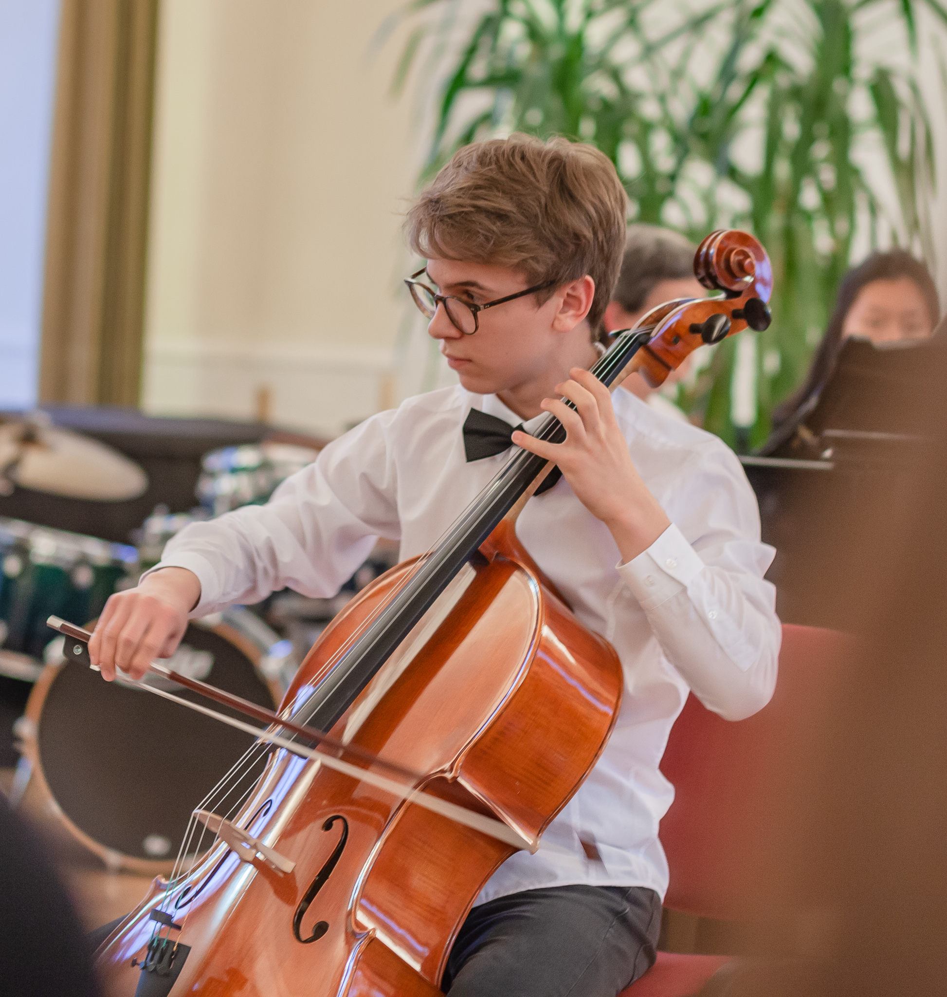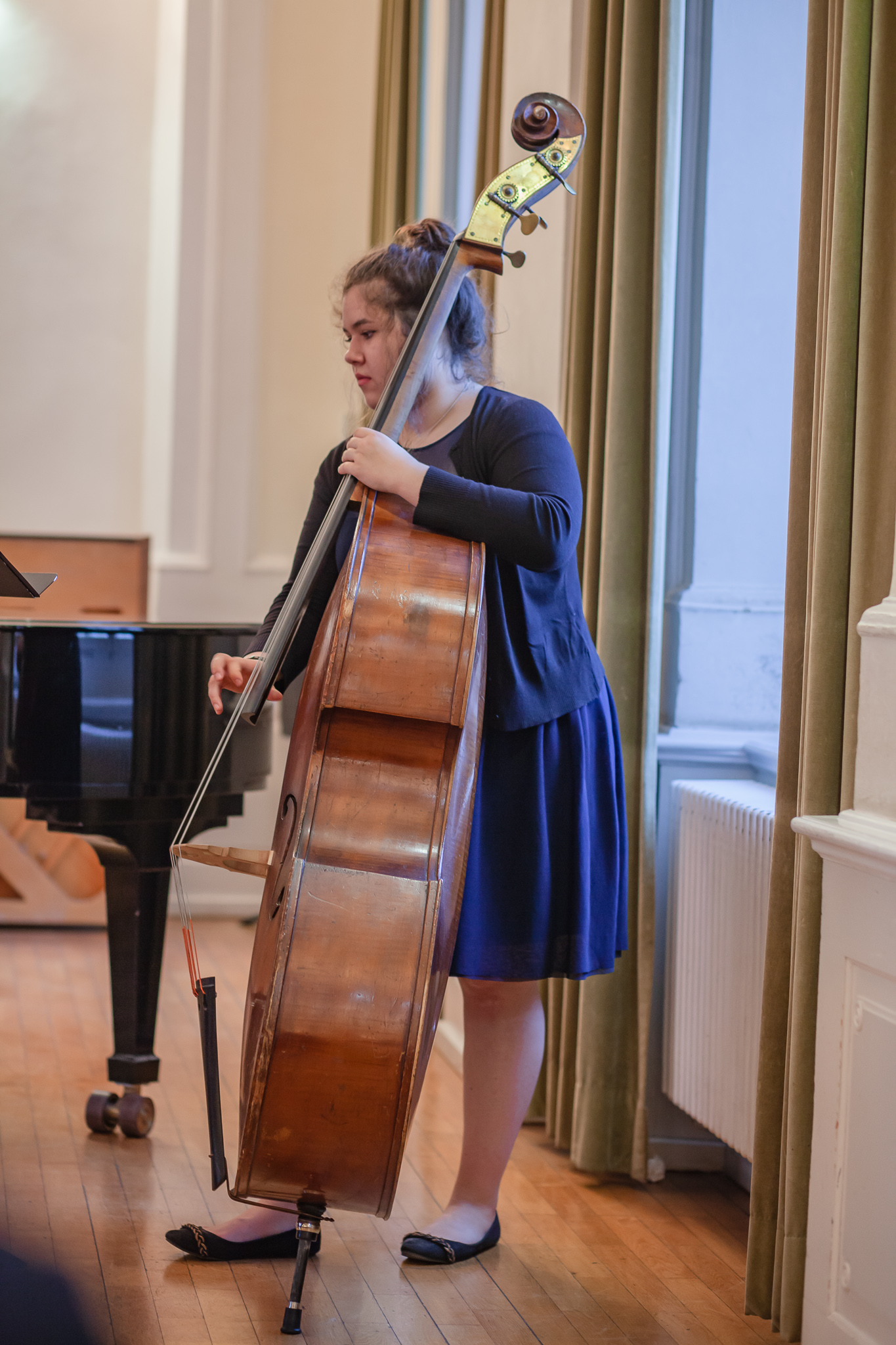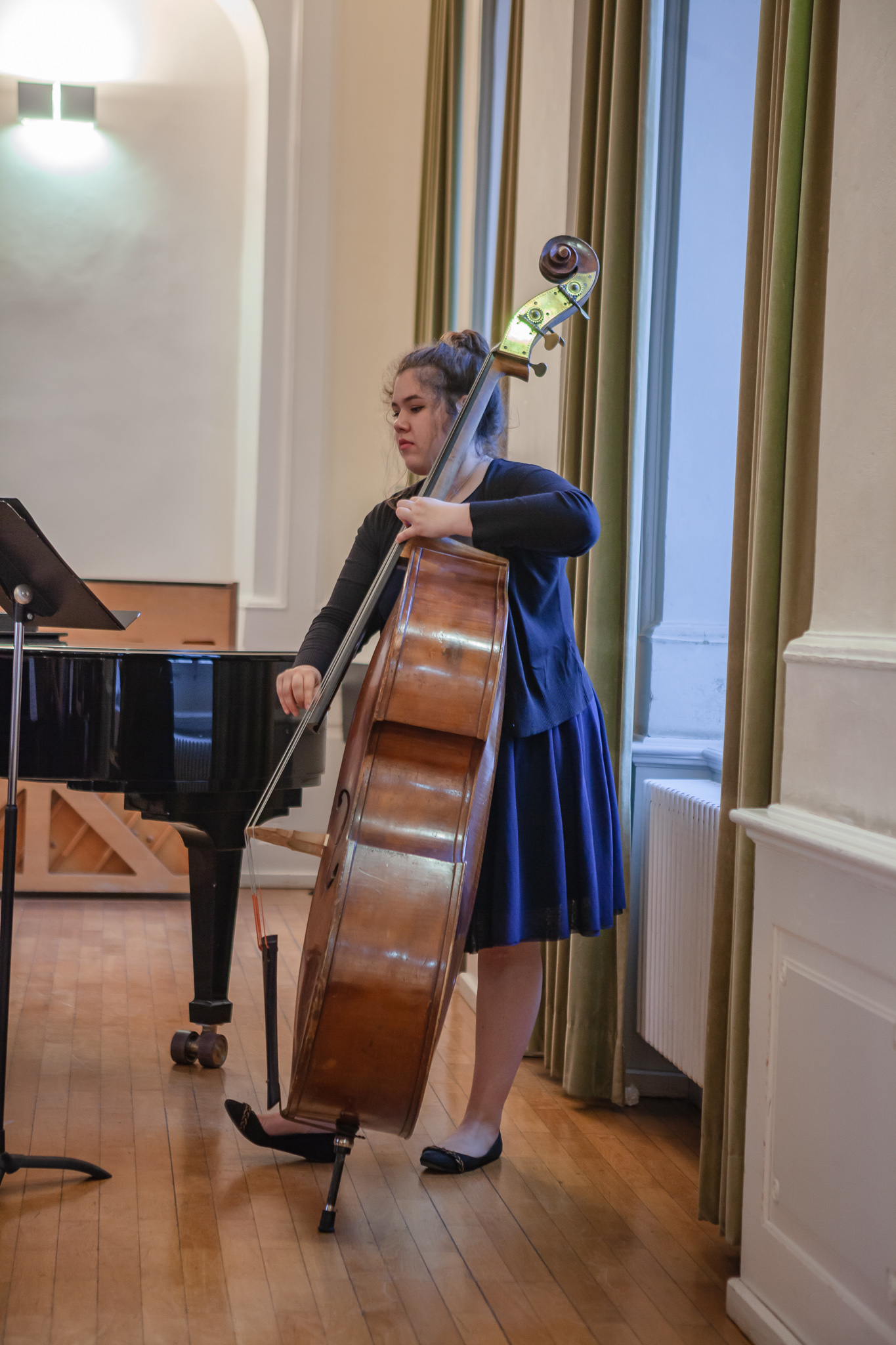 Die Streicher wussten auch zu überzeugen, allen voran Felix Lambsdorff auf der Violine und Korbinian Seibold auf dem Violoncello, die überaus ausdrucksstark und virtuos ihre Werke darboten. Anna Riesinger zeigte ihr Können mit einem Satz aus Joseph Haydns Violinkonzert, Laura Sonnleitner stimmte ein Rondo von W. A. Mozart an und Vanessa Bauer interpretierte ein Werk von Henry Eccles. Auch die Riege der Querflötistinnen mit Lena Mautner, Alina Schlichtenmayer und Lea Schwarzmeier begeisterte mit ihrem Spiel. Sowohl virtuose als auch lyrisch ausdrucksstarke Momente prägten ihr Spiel. Die Pianisten des Kurses, Pia Martin, Simon Seidl, DaHye Kim und Magnus Schiebelsberger beeindruckten mit ihren Leistungen in Werken von Mozart, Scarlatti, Schumann und Schubert. Sie entfalteten in ihren Interpretationen eine große Palette von Ausdrucksmöglichkeiten, die sich auch im Spiel der Instrumente Gitarre und Schlagzeug deutlich zeigte. So verzauberte Eva Heide mit ihrem südamerikanischen „Tico, Tico“ die Zuhörer. Tobias Baier setzte mit dem Werk Caramba einen fulminanten Eckpfeiler.
