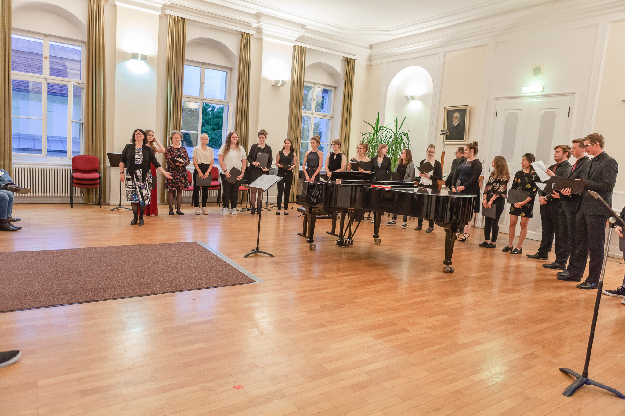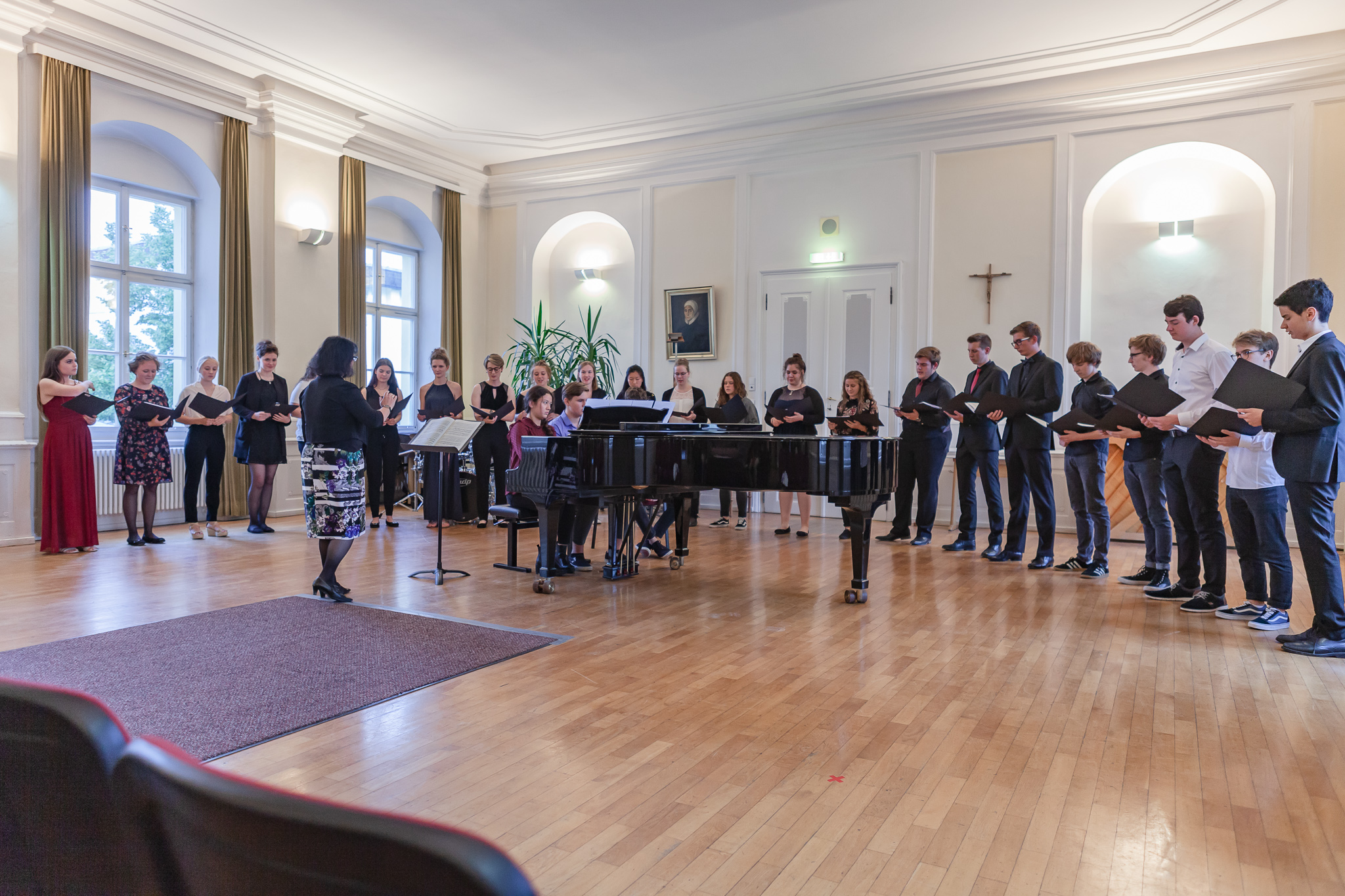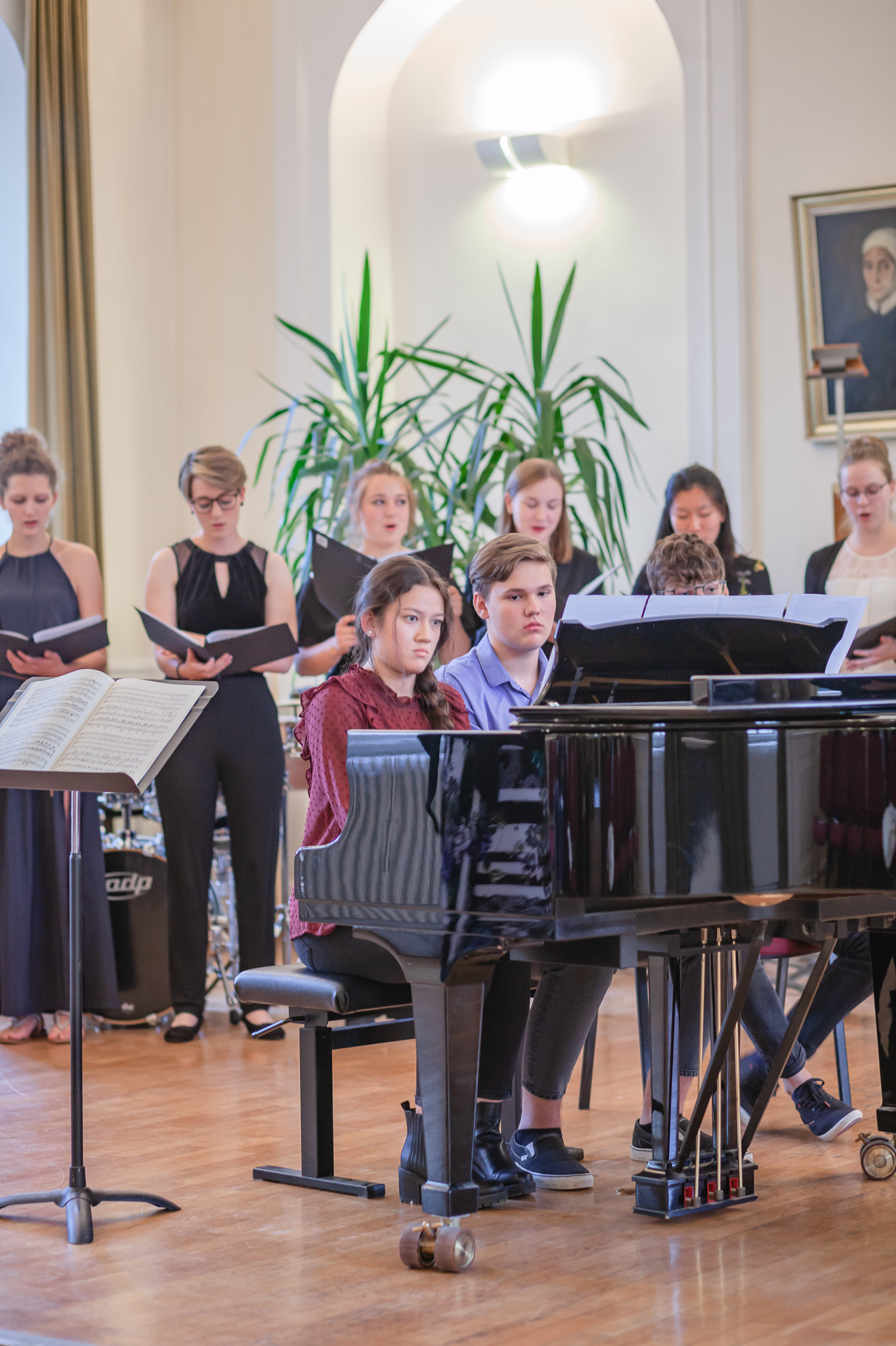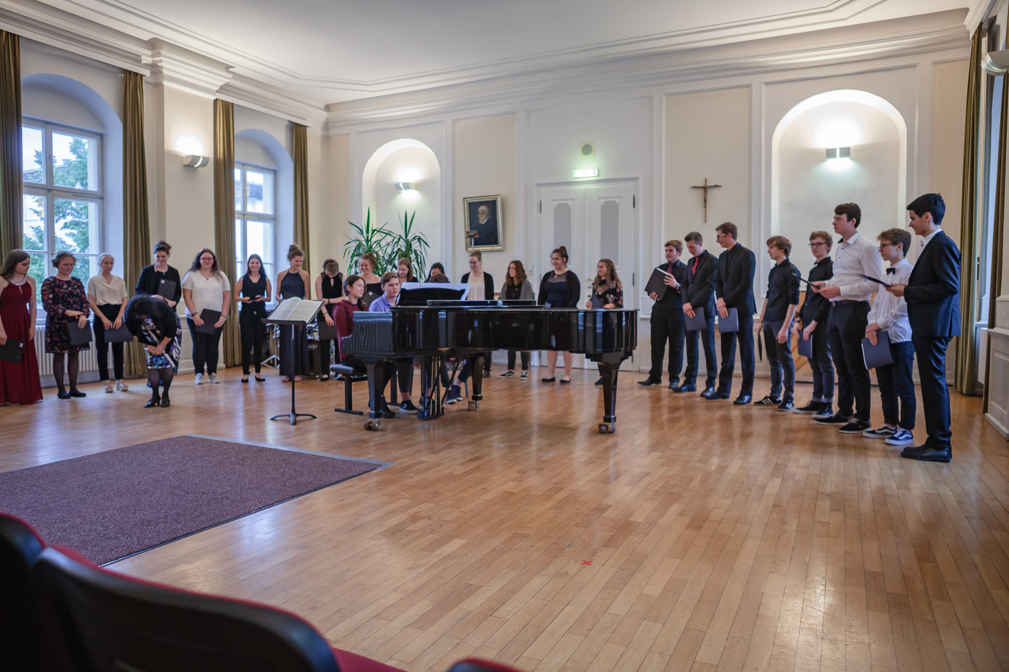 Die herausragenden gesanglichen Leistungen zeigten sich auch im Chorgesang, Die Kursleiterin wählte dazu das Lied „Ein hübscher Vogel“ aus den „Liebesliederwalzern“ von Johannes Brahms, das spritzig und fein artikuliert den ersten Teil des Abends abrundete. Chiara Andrée und Julius Hörner als Begleiter überzeugten in ihrem exakt aufeinander abgestimmten, sicheren und kraftvollen Spiel. Mit dem Lied „Irish Blessing“ verabschiedete die Q 11 die Zuhörer nach einem eindrucksvollen Konzert.