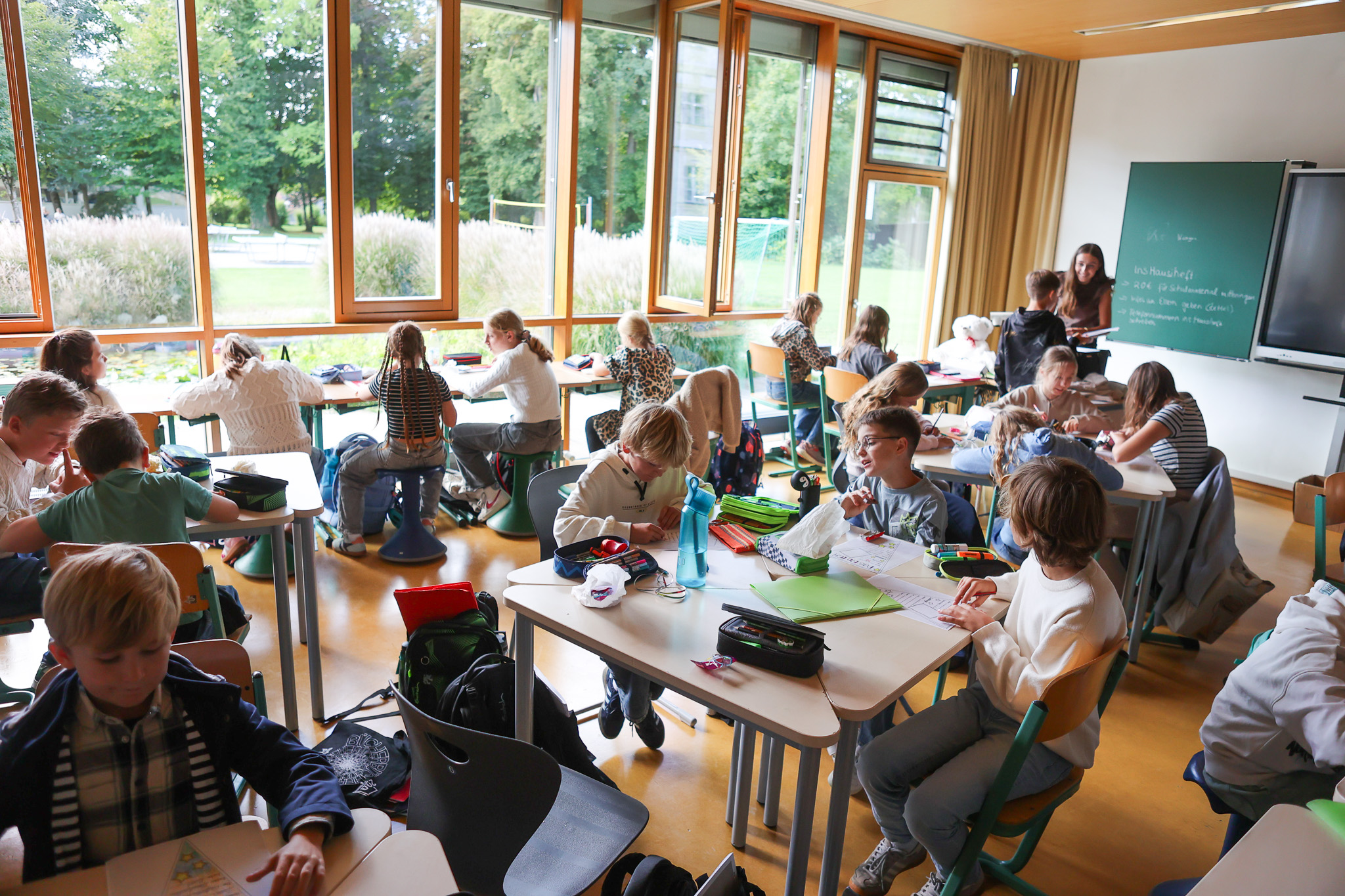 Äußerlich erkennt man die Pilotklasse bereits an der besonderen Raumgestaltung nach dem sogenannten „Churer Modell“: Die Schülerinnen und Schüler sitzen nicht wie üblich in Reihen zur Tafel hin, sondern arbeiten flexibel in verschiedenen Lerngruppen zusammen. Transparente Kanban-Boards helfen dabei, den Lernprozess für alle sichtbar zu dokumentieren. Die Kinder bekommen so die Chance, modernes Lernen ganz praktisch zu erfahren und eigenständiges, reflektiertes Arbeiten von Anfang an einzuüben.