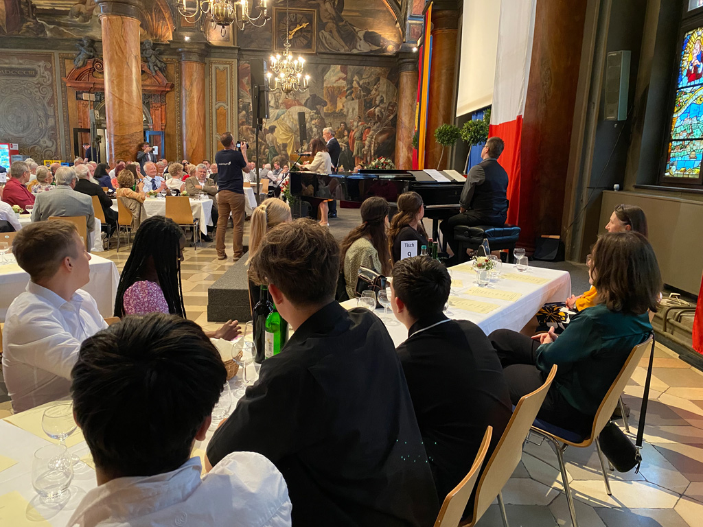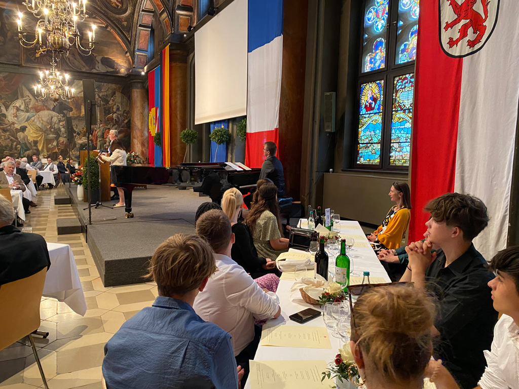 Am 23. Juni 1973 unterzeichneten der damalige Passauer Bürgermeister Emil Brichta und sein französischer Amtskollege aus der Mittelmeer-Küstenstadt Cagnes-sur-Mer die Partnerschaftsurkunde im Großen Rathaussaal zu Passau, und genau an dem Ort feierte man am 23. Juni 2023 das goldene Jubiläum. 55 Cagnoiser samt ihrem Bürgermeister Louis Nègre waren angereist, um mit den Passauer Honoratioren des ehrwürdigen Tages zu gedenken. Dass die Freudenhainer Schüler/-innen mit ihren Lehrerinnen Frau Kramer und Frau Fuchs, in Begleitung von Frau Täuber, dabei sein durften, hat folgenden Grund: Bereits Monate vor dem Festtag war das Kulturamt der Stadt Passau auf das Auersperg-Gymnasium zugekommen und bat um einen musikalischen Beitrag zu den Festlichkeiten, wusste man doch, dass die Freudenhainer 18 Jahre lang bis 2019 einen Schüleraustausch mit dem Lycée Renoir in Cagnes gepflegt hatten.