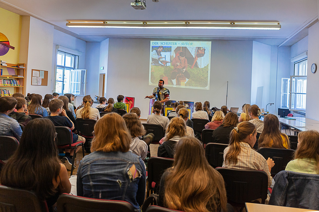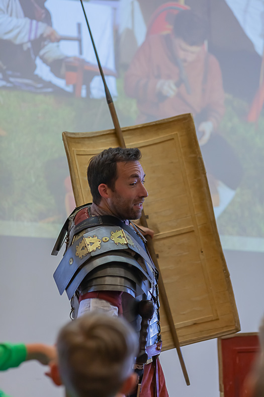 Diesen Titel hatte ein Vortrag für die 6. und 7. Klassen im Rahmen der Fächer Geschichte und Latein, in dem das Leben der römischen Legionäre genauer beleuchtet werden sollte. Dass sich diese Ankündigung für die Schülerinnen und Schüler im Laufe der folgenden 90 Minuten bewahrheitete, lag an dem großartigen Josef Geisberger, der sein Publikum als „römischer Legionär“ mitnahm in die Welt der Antike.