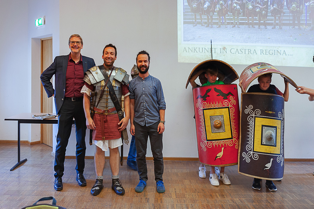 Seine Leidenschaft für die experimentelle Archäologie, die am Lehrstuhl für Alte Geschichte an der Universität Regensburg ihren Anfang nahm, war gleich auf den ersten Blick augenscheinlich: Vom Helm über den metallenen Schienenpanzer, den bunt bemalten Schild bis hin zu den ledernen Soldatenstiefeln (die Füße übrigens auch im Sommer originalgetreu in dicken Wollsocken) – fast schien ein „echter“ Legionär einer Zeitmaschine entsprungen zu sein. Dabei nutzte der Experte durchaus auch moderne Technik und veranschaulichte seine Erklärungen zum Leben der römischen Legionäre mit authentischen eigenen Fotos von Training, Lagerleben und langen Märschen.