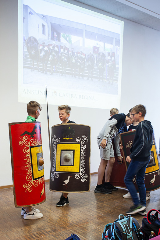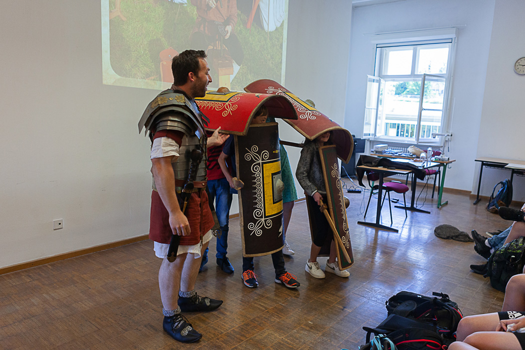 Am beeindruckendsten für die Schülerinnen und Schüler waren sicherlich die bis ins Detail korrekt nachgebauten Ausrüstungsgegenstände. Diese wurden nicht nur vorgestellt, sondern durften immer wieder selbst ausprobiert werden. Wie schwer ein scutum (großer Schild) zu halten ist, wie gut koordiniert die Abläufe in der römischen Armee waren und wie perfekt alle Bestandteile der Rüstung für ihren Zweck optimiert waren – all das konnten die SchülerInnen und Schüler aktiv nachvollziehen. Und sogar die aus Asterix und Obelix berühmte testudo (Schildkröte) wurde eingeübt.