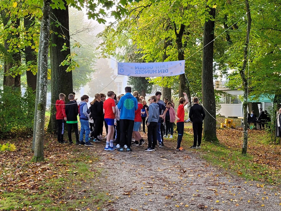 Schon seit über 20 Jahren gibt es den Spendenlauf der „Aktion gegen den Hunger“. Schülerinnen und Schüler können auf sportliche Art und Weise ihr Engagement für die hilfsbedürftigen Menschen zeigen und pro gelaufener Runde Geld spenden. Auch Freudenhains Schüler waren wieder mit dabei! Das P-Seminar der Q12 „Wir für Afrika“, unter der Leitung von Gerald Dobretsberger, organisierte den Spendenlauf. Jeder Schüler suchte sich zuvor schon Sponsoren seiner Wahl aus, die die jeweils gelaufenen Runden finanzieren werden. Seien es die Eltern, Nachbarn oder Firmen, jeder durfte sich dazu bereit erklären. Am 5. und 6. Oktober gingen die 5. bis 11. Klassen, gestaffelt nach Jahrgangsstufen, im herbstlichen Schulpark an den Start, um in 60 Minuten so viele Runden wie möglich zu erlaufen.