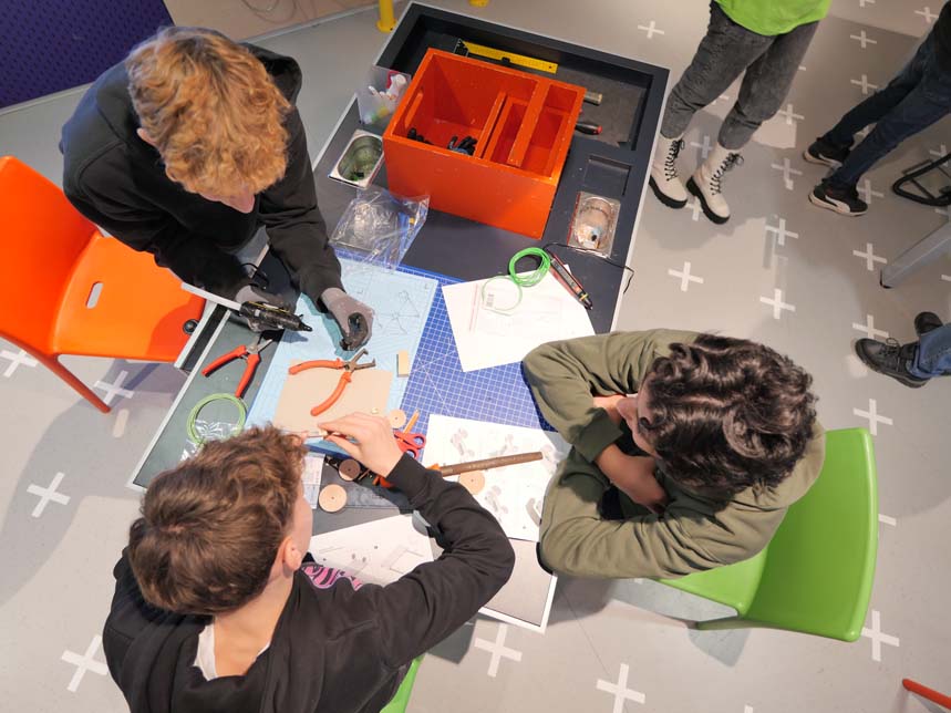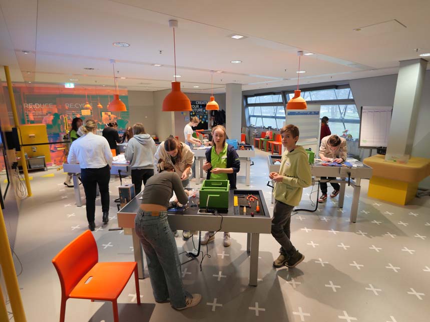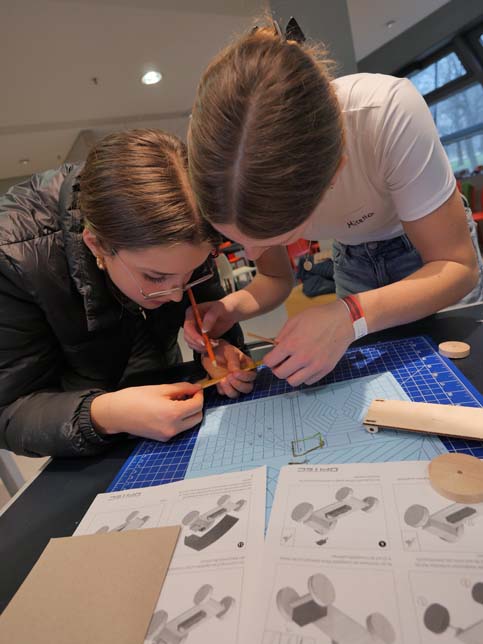 In einem zweiten Workshop wurden die Autos der Zukunft entworfen und mit Bausets als Modell zusammengebaut. Hierbei ging es nicht nur um ein ansprechendes Design, sondern auch um die Reduktion des Gewichts und um die Vermeidung von Abfall. Auf diese Weise wurde klar, dass leichte Autos weniger Energie brauchen und die Abfallvermeidung eine ressourcenschonende Produktion darstellt.