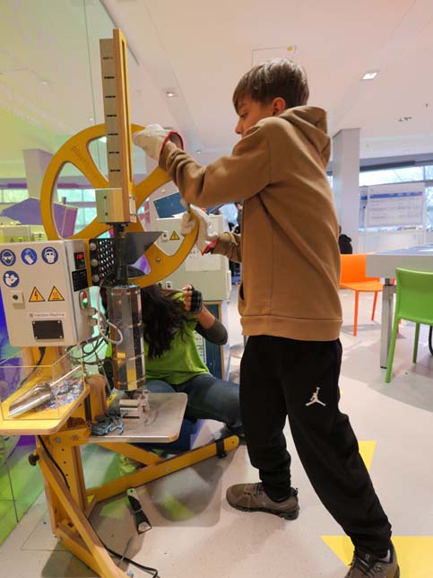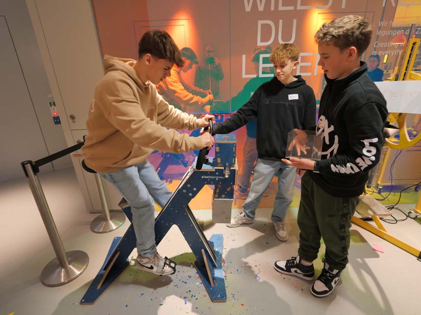 Am letzten Morgen gingen wir – diesmal mit Gepäck und im Regen – den nun schon bekannten Weg durch den Olympiapark zur BMW-Welt, wo der zweite Workshop auf uns wartete. Bei einem Quiz zum Thema Nachhaltigkeit bekamen wir als „Punkte“ Deckel von Plastikflaschen, welche wir am Schluss recyceln konnten. Wir haben die Deckel mit Hilfe einer Handkurbel oder per Fahrradantrieb geschreddert, die Plastikteilchen anschließend eingeschmolzen und in Metallformen gegossen. So konnte am Schluss jeder seinen eigenen Kamm, Karabiner oder Kreisel aus recyceltem Kunststoff mit nach Hause nehmen.