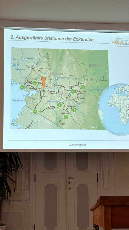 Die thematischen Schwerpunkte der Reise beinhalteten den Teeanbau, den Safari-Tourismus, die Wasserversorgung, die Nachhaltigkeit und die Entwicklungszusammenarbeit von Deutschland und Kenia. Auf dem äußerst kurzweiligen und informativen Vortrag nahm Jonas Wagener die Zuhörer auf insgesamt 9 Reisestationen mit, die zuerst von der Hauptstadt Nairobi über den Norden Kenias bis zum Mount Kenya, dem höchsten Berg des Landes, welcher vulkanischen Ursprungs ist, gingen. Der Referent berichtete darüber, dass die Gruppe aufgrund der weiten Fahrstrecken mehrmals den Äquator überquerte und das tropische Klima mit der hohen Luftfeuchtigkeit und den Starkniederschlägen für einige Krankheitsfälle und riskante Jeepmanöver sorgte. Zusätzlich erfuhren die Zuhörer von der Tatsache, auf über 2000 m üNN vor Malaria geschützt zu sein, da eine Übertragung der Krankheit in dieser Höhe sehr unwahrscheinlich ist. Auch die Einflüsse der Kolonialzeit bis zur Unabhängigkeit des Staates im Jahr 1963 wurden angesprochen, so geht doch der Name „White Highlands“, der landwirtschaftlichen Nutzfläche im Hochland von Kenia, auf die Besiedelung durch die Europäer zurück. Auch die Namensgebung des Victoriasees, an den Kenia neben Tansania und Uganda angrenzt, ist der britischen Königin Viktoria gewidmet und sogar der Kilimandscharo im Nordosten Tansanias, erinnert mit dem Namen „Kaiser-Wilhelm-Spitze“ an finstere Zeiten in der Geschichte Afrikas. Als Randinformation erfuhren wir, dass der Name EDEKA auf die Begriffe „Einkaufsgenossenschaften deutscher Kolonialwaren- und Lebensmittel-Einzelhändler“ zurückgeht, was die Zuhörer nachdenklich stimmte. Noch bis vor Kurzem hing sogar in der Passauer Altstadt über dem Edeka Markt ein Transparent mit dieser Information, so Wagener.