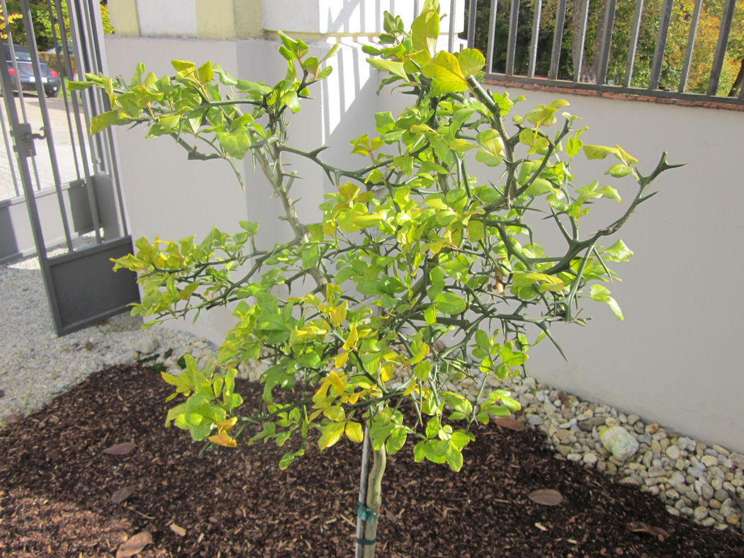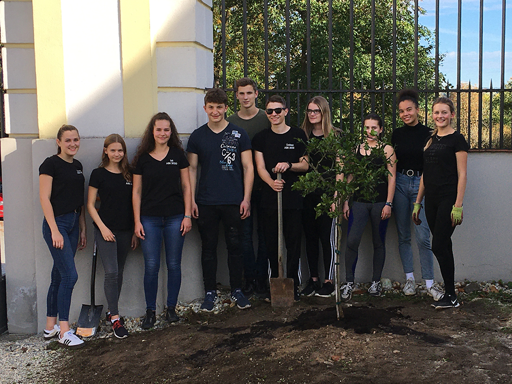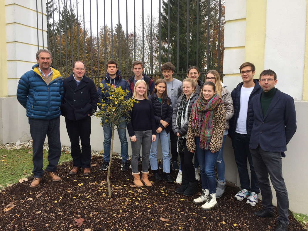 Was lag näher, als die Passauer Goldpomeranze zurück in den Schlossgarten von Freudenhain zu bringen? Mit Unterstützung der Stadtgärtnerei Passau wurden daher im Herbst zwei Passauer Goldpomeranzen vom P-Seminar angepflanzt. Sie befinden sich rechts und links hinter dem Eingangstor und sind somit für jeden, der die Schlossanlage betritt, sofort sichtbar. Zunächst wurden in schweißtreibender Arbeit tiefe Pflanzlöcher in das Erdreich gegraben, die dann mit Pflanzerde aufgefüllt wurden, um den Pomeranzen einen guten Start in Freudenhain zu bieten. Dann konnte man die beiden dornenbewehrten Pflanzen in ihren neuen Lebensraum einsetzen und die Wurzelstöcke noch sorgfältig mit Erdreich bedecken. Wir danken Herrn Hermann Scheuer (links auf Bild 4) von der Stadtgärtnerei und wünschen den Bäumchen einen guten Start. Laut Herrn Scheuer dürfen wir uns im Frühling auf die erste Pomeranzenblüte freuen.