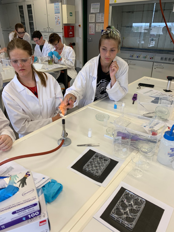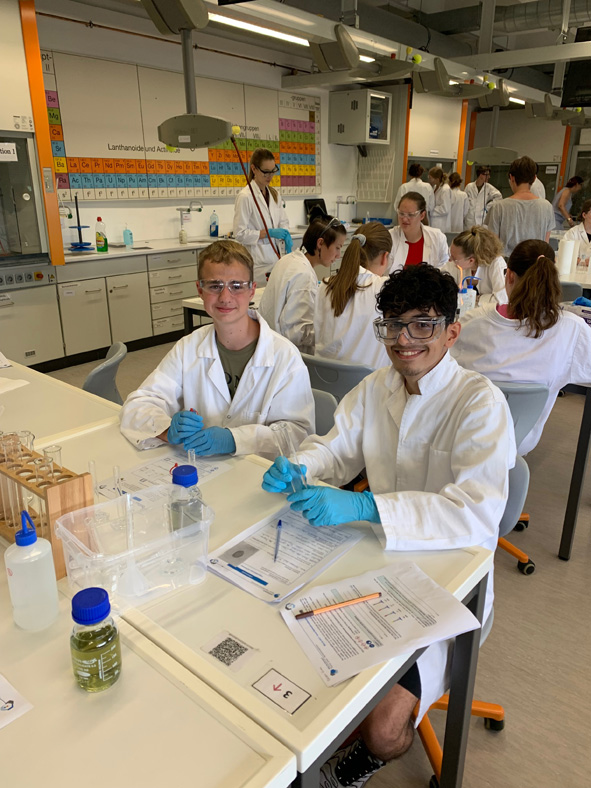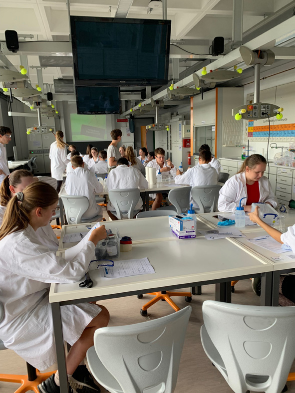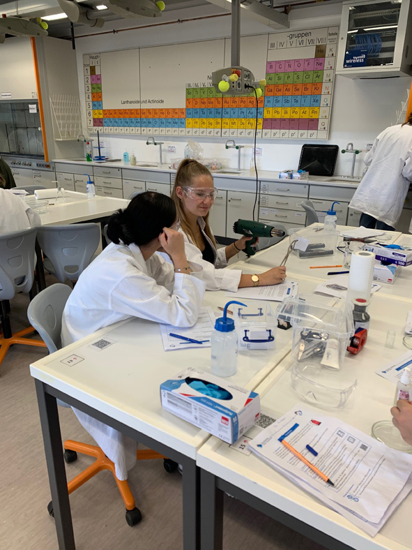 Die Klasse 9a des Auersperg-Gymnasium Passau hatte am Schülerexperimentiertag der Universität Regensburg, dem 26. Juli 2022, die Möglichkeit, eigenständig in Gruppen Experimente zum Thema „Chemische Reaktionen und Energetik“ durchzuführen. Dadurch wurde ihr Wissen zur Thematik aufgefrischt und verankert. Die Schülerinnen und Schüler erhielten die Möglichkeit, selbst zu experimentieren und somit ihr Interesse an den jeweiligen Inhalten zu steigern und ihre experimentellen Kompetenzen zu verbessern. In vier Stationen konnten die Schüler einen Feuerlöscher bauen, durch Flammenfärbung Ionen nachweisen, ihren Fingerabdruck kenntlich machen und einen Lumineszenzversuch durchführen.