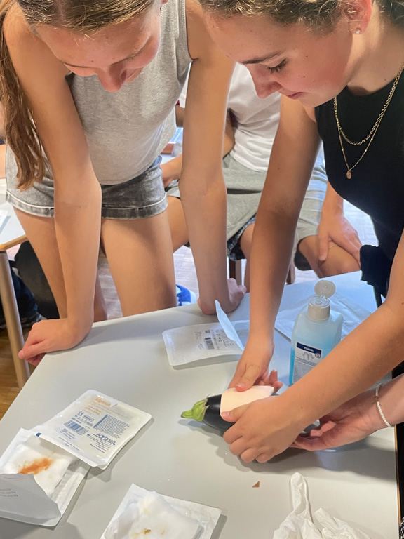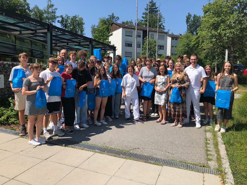 Am nächsten Tag fand bereits das nächste Highlight statt, der Besuch des Rehafachzentrums Passau-Kohlbruck. In dieser großartigen Klinik wurde den Schülerinnen und Schülern ein vielfältiges und interessantes Programm zu den Themen „Wundversorgung und Hygiene“ und „Ernährungsmedizin“ geboten. Die Ernährungsexpertin Frau Pölt startete dabei mit einem Impulsvortrag zum Thema Grundlagen der gesunden Ernährung. Anschließend konnten sich die Schüler eigenverantwortlich in einer Stationenarbeit das Thema „Zuckerfallen in Getränken“ erarbeiten und abwechselnd mit der Ernährungsexpertin in der Lehrküche des Klinikums gesunde Speisen zubereiten. Dabei wurden belegte Vollkornbrote, Gemüse- und Obstspieße, Obstsalat, Müsli und Fruchtsäfte oder -shakes zubereitet und abschließend mit der gesamten Gruppe verzehrt. Auch der Themenkomplex zum Wundmanagement startete mit einem kurzen Vortrag über chronische Wunden, modernste Wundversorgungsmaterialien und verschiedene Krankheitsbilder, die im Rehafachzentrum behandelt werden. Danach durften die Schülerinnen und Schüler selbst ihr Können zeigen und an zuvor präparierten „Auberginen-Patienten“ die entsprechenden „Wunden“ versorgen. Als Abschluss dieses wundervollen Tags gab es noch Turnbeutel mit einer Nussmischung für die 8.-Klässler. Das Auersperg-Gymnasium dankt dem Reha-Fachzentrum für den herzlichen Empfang. Hier kann man sich näher über die Einrichtung informieren: www.rehafachzentrum.de